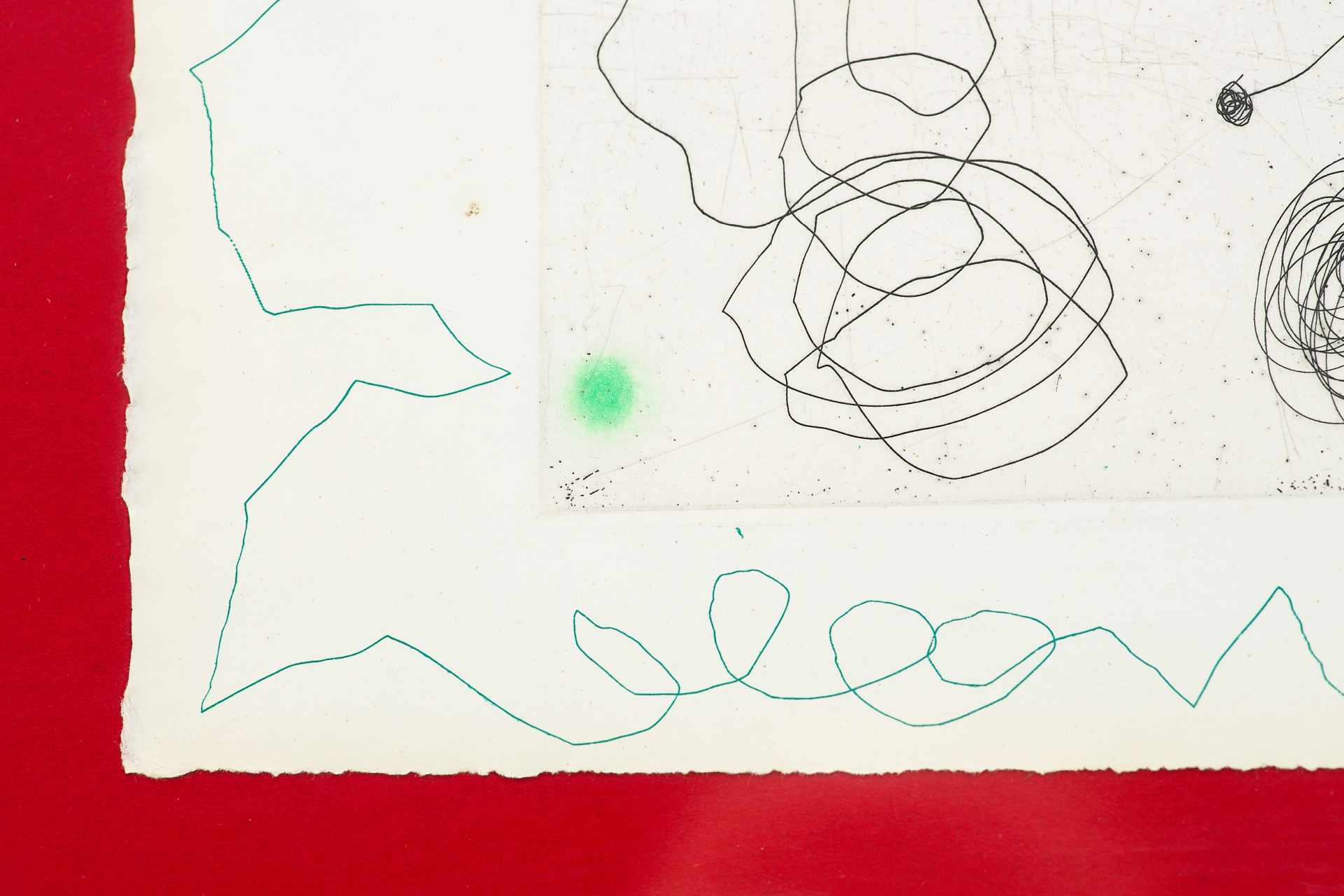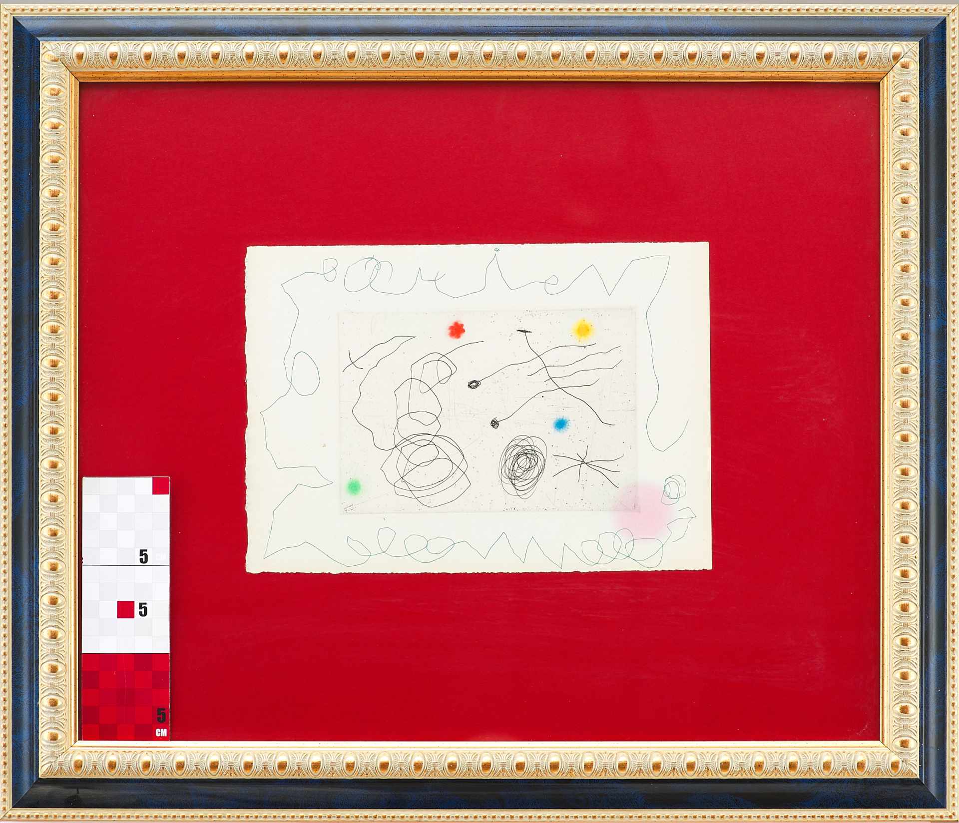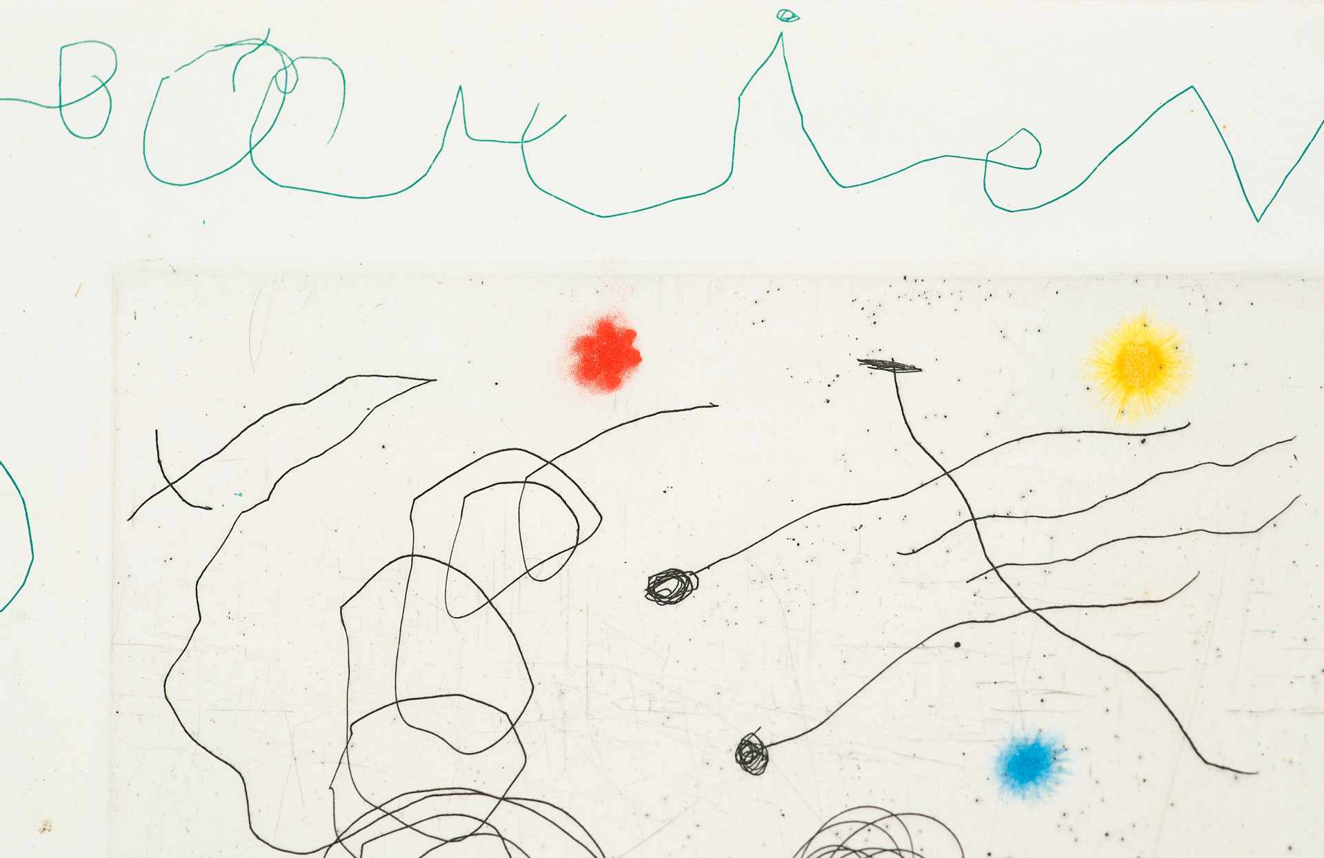 стороне листа печатная надпись: «Pointe seche originale de Joan Miro» («оригинальная (первая) печать «сухой иглы» Хуана Миро»)., подтверждающая подлинность произведения.
