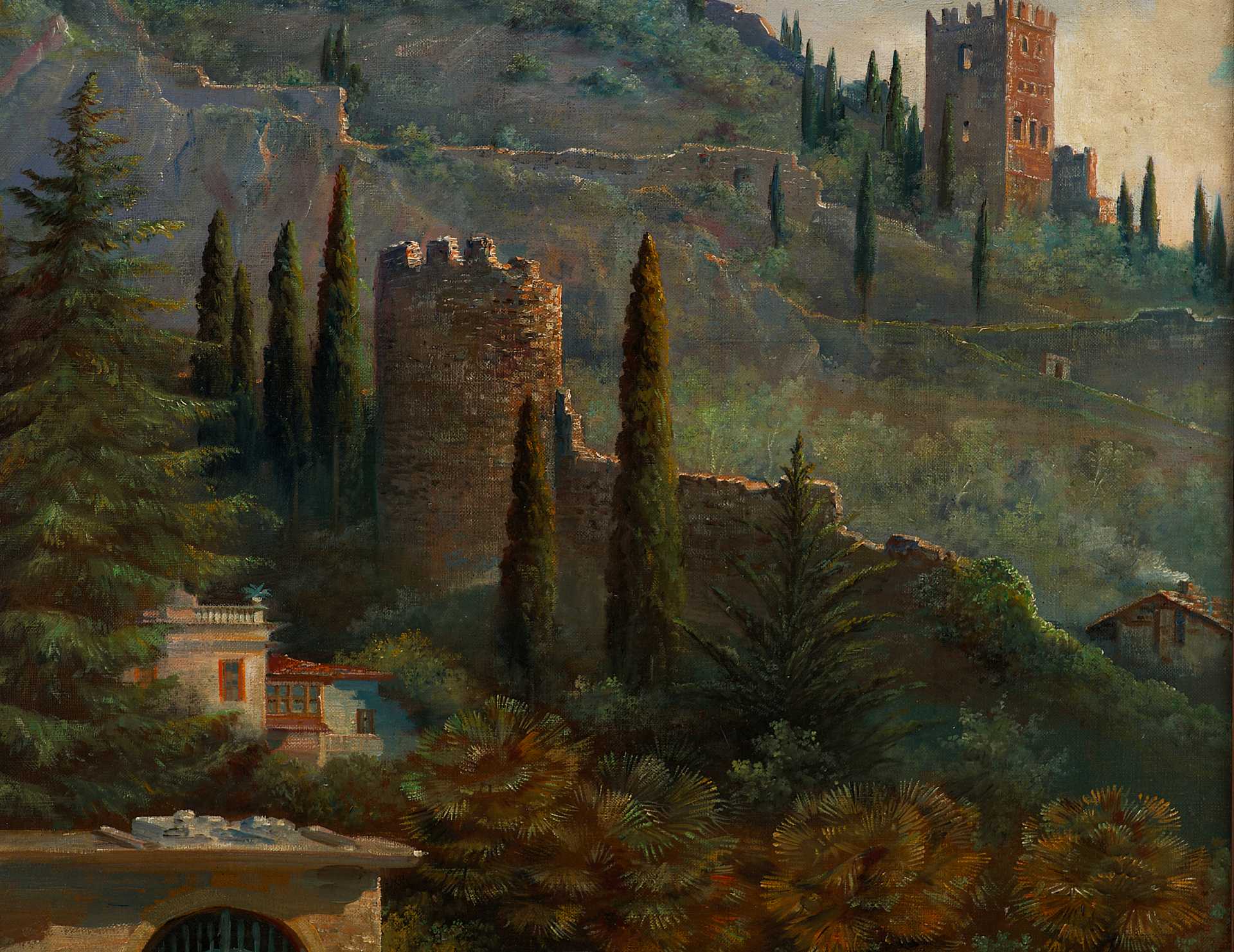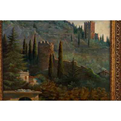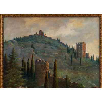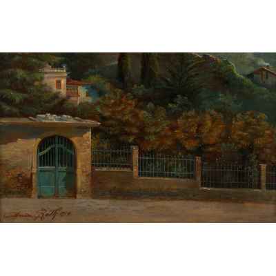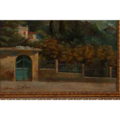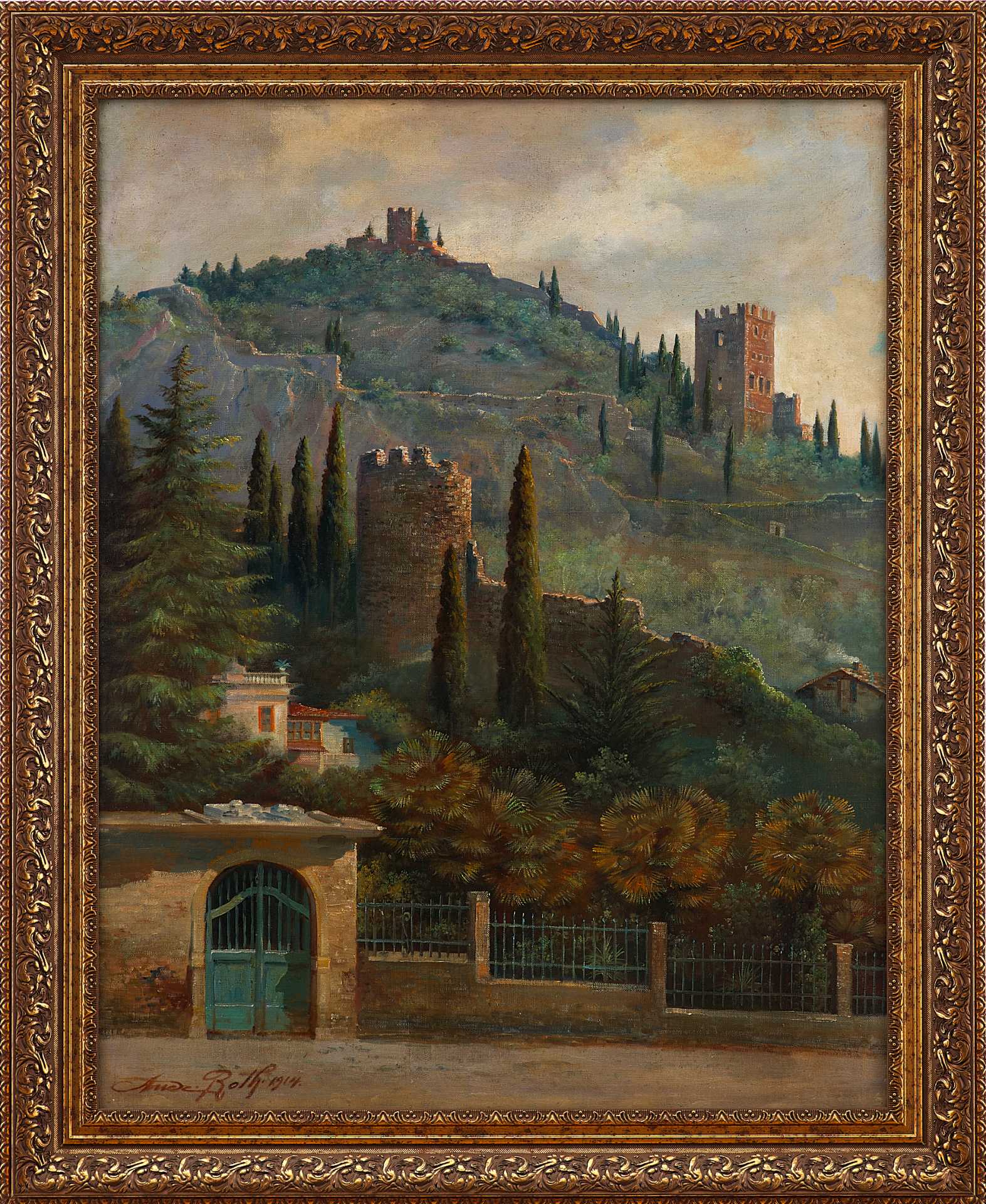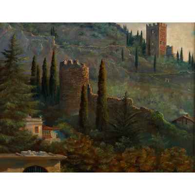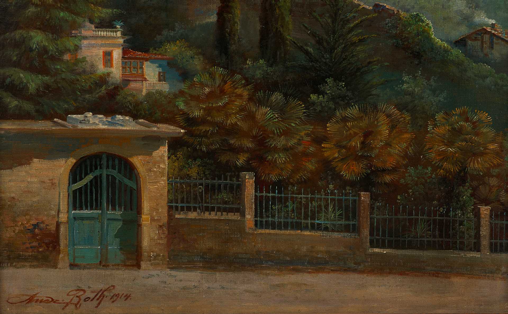 Изображен южный пейзаж с архитектурными строениями. На переднем плане — городская дорога, на которой каменные ворота с железными дверями и ступенчатый забор с металлическими решетками. За забором - высокие деревья: кипарисы, ели и другие. Среди пышной зелени виден дом белого цвета с коричневой крышей. Неподалеку от дома на возвышенном месте полуразрушенная крепостная башня и стена. На заднем плане - высокая гора с древними строениями. Слева внизу авторская подпись и дата: “Andr. Roth. 1914”.