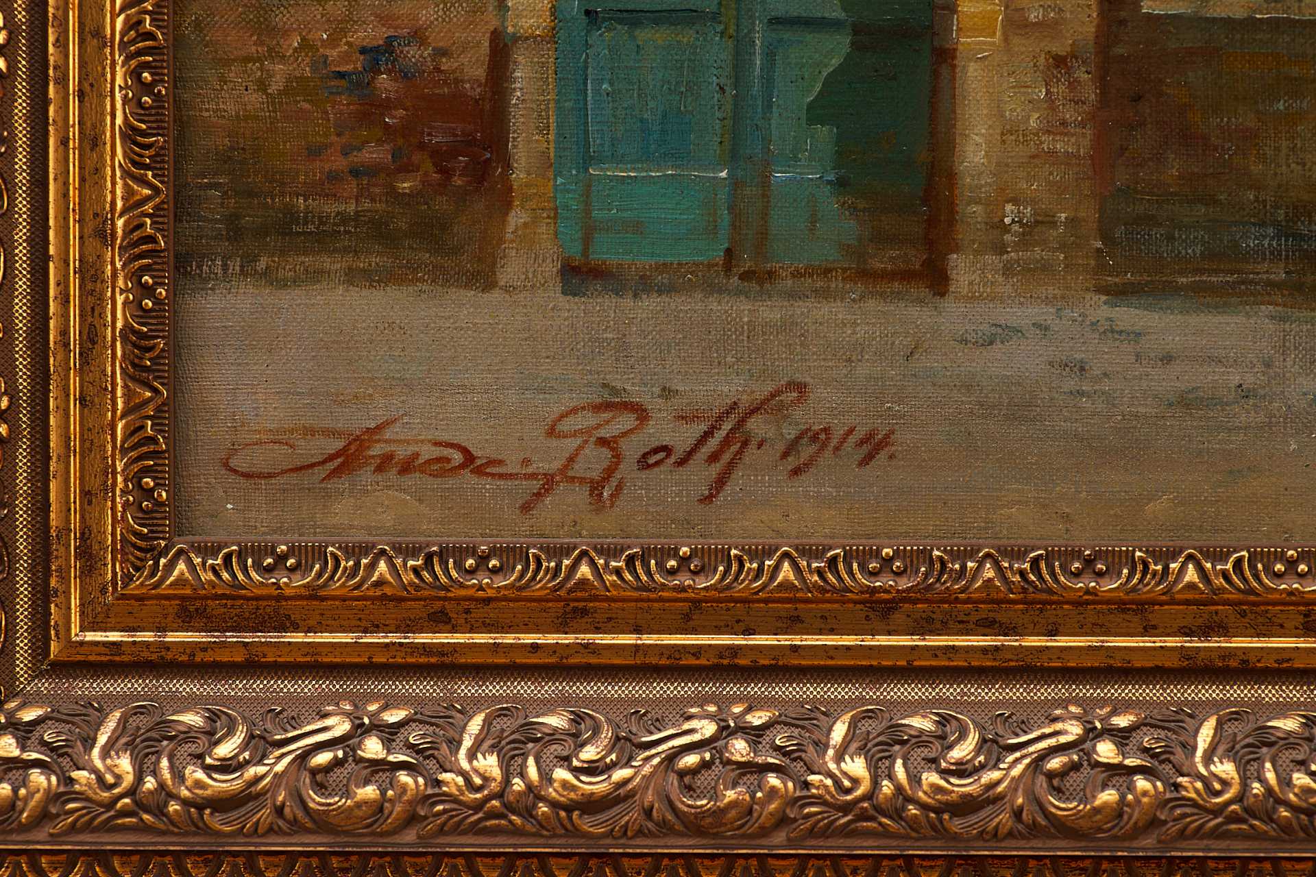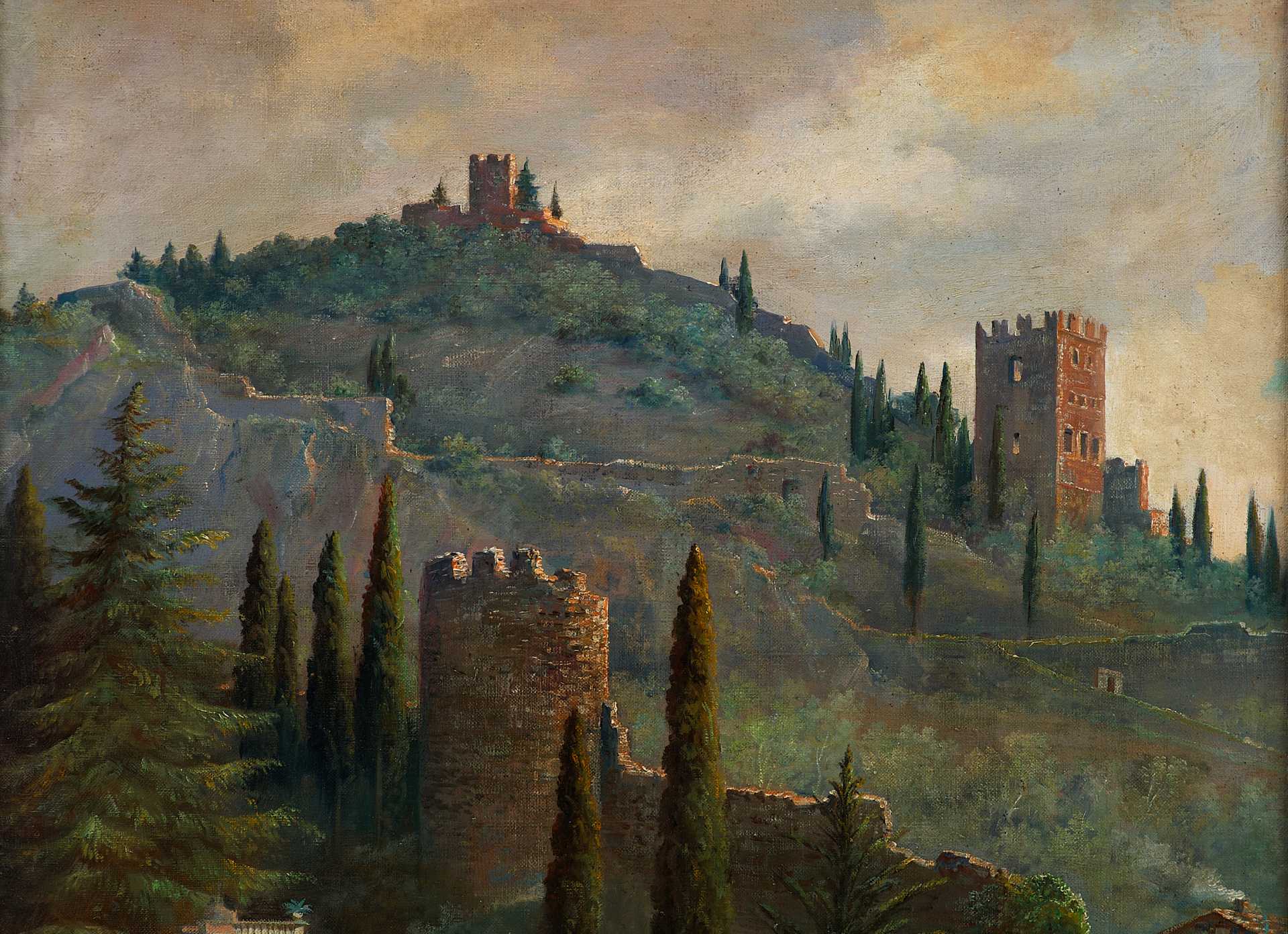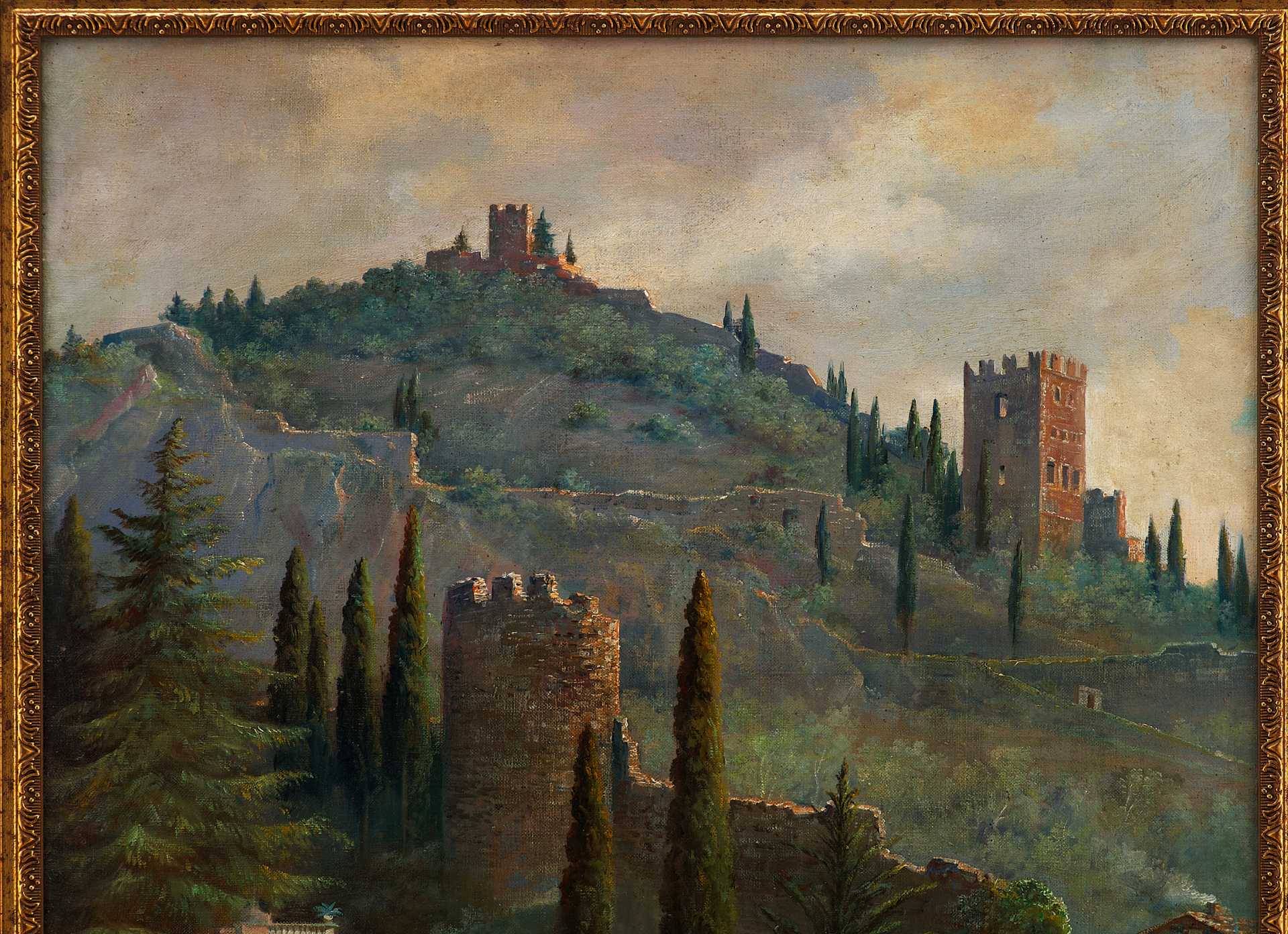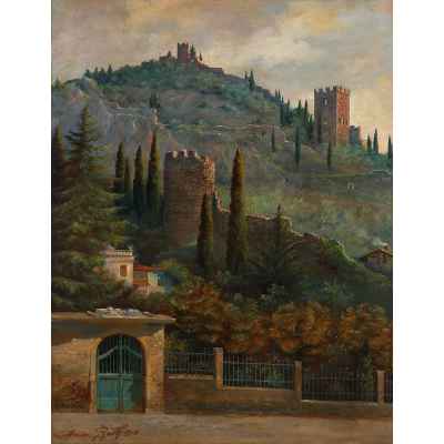 Изображен южный пейзаж с архитектурными строениями. На переднем плане — городская дорога, на которой каменные ворота с железными дверями и ступенчатый забор с металлическими решетками. За забором - высокие деревья: кипарисы, ели и другие. Среди пышной зелени виден дом белого цвета с коричневой крышей. Неподалеку от дома на возвышенном месте полуразрушенная крепостная башня и стена. На заднем плане - высокая гора с древними строениями. Слева внизу авторская подпись и дата: “Andr. Roth. 1914”.
