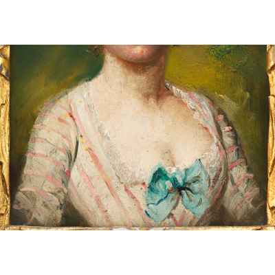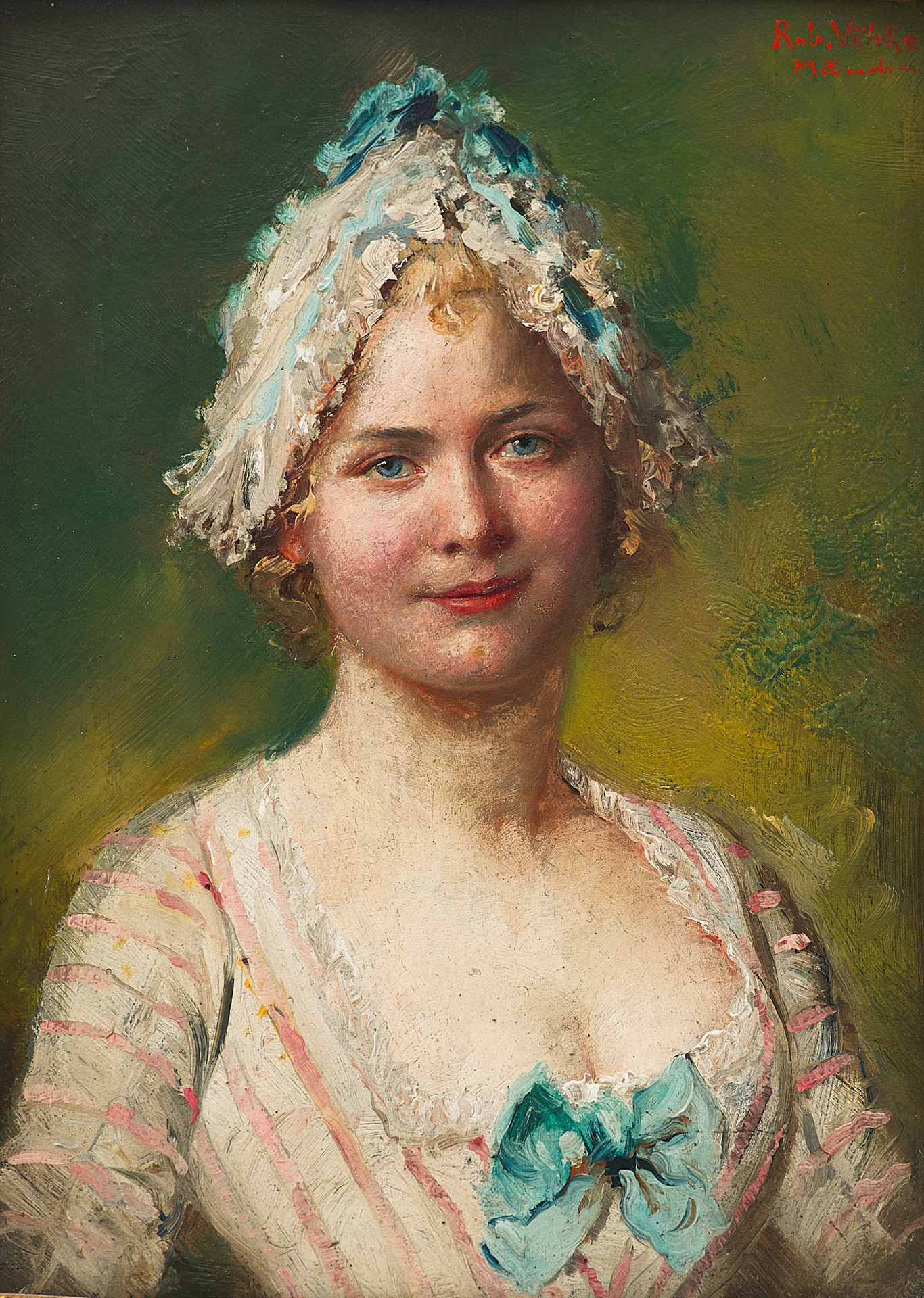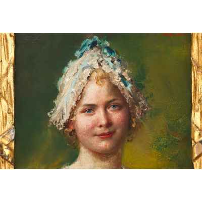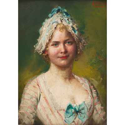 На портрете изображена молодая женщина в платье с голубым бантом и кружевном чепце, выполненная в стилистике, навеянной модой XVIII века. Композиция сосредоточена на лице и плечах модели: её взгляд мягкий, чуть загадочный, а поза — подчеркнуто изящна. Фон нейтральный, тёпло-зелёный, не отвлекает от главного — выразительного образа, насыщенного светом и жизнью. Работа написана на дереве маслом, в камерном формате 16 × 12 см, что придаёт ей интимный характер и декоративную завершённость.