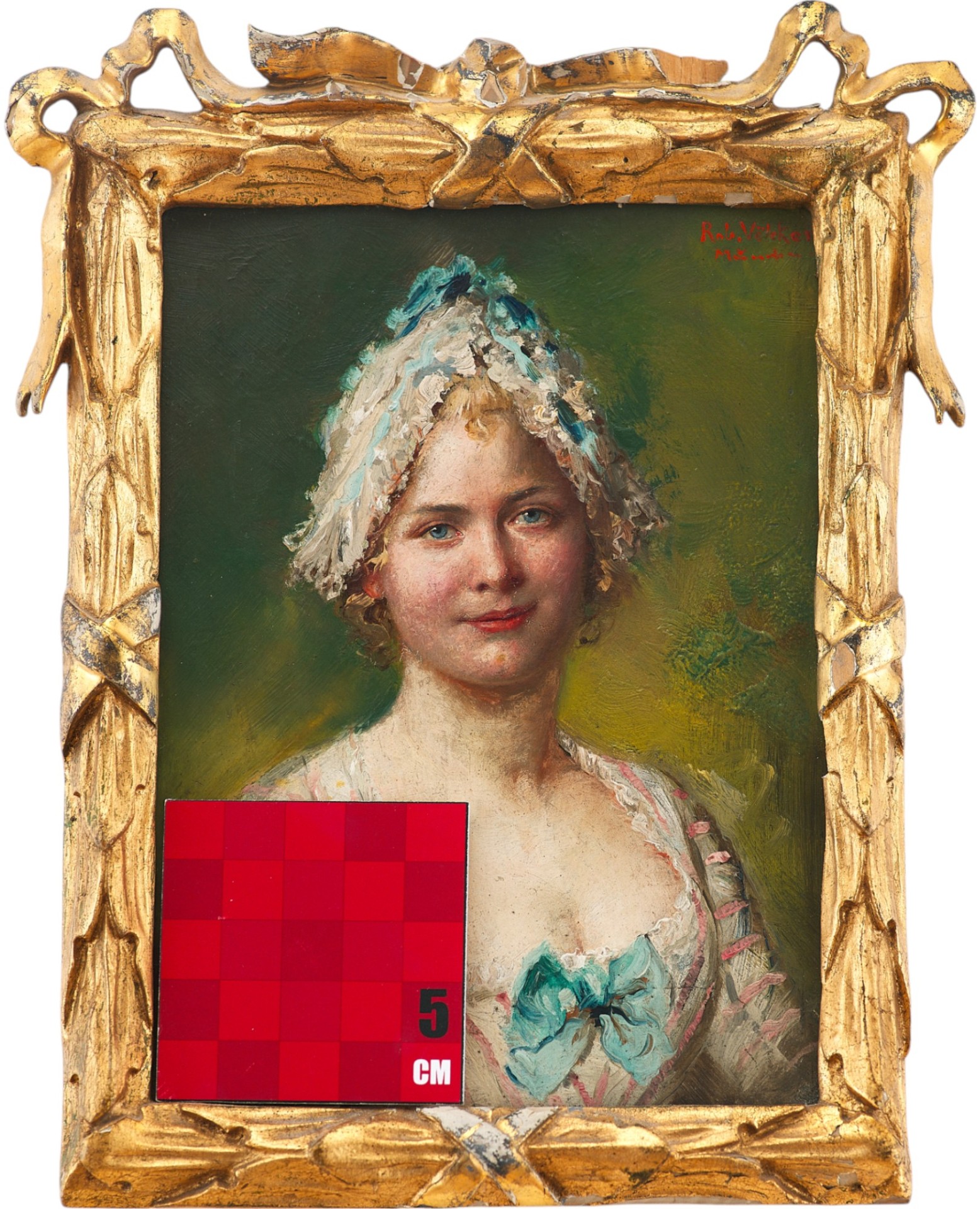 Автор произведения — Rob. Vötcker, художник, работавший в Мюнхене в конце XIX — начале XX века. Подпись «Rob. Vötcker München» расположена в верхнем правом углу и, по данным экспертизы, соответствует слою краски и признакам естественного старения. Работа исполнена в духе европейского ретроспективного портретного жанра, который активно развивался в период интереса к стилю рококо и его переосмыслению в рамках модерна (ар-нуво).