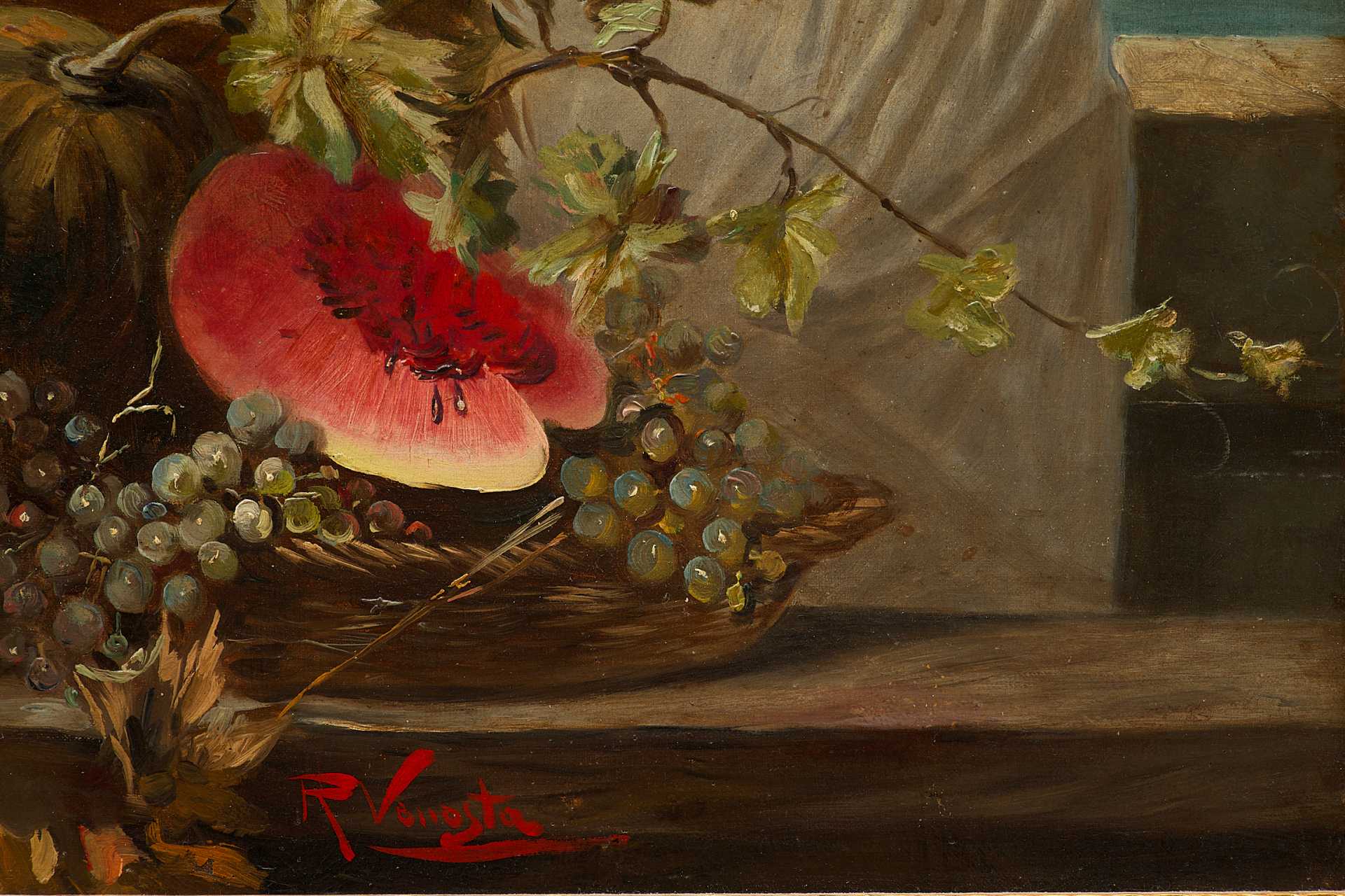 Произведение выполнено в технике масляной живописи по холсту, типичной для салонного искусства начала XX века. Автор работы — R. Vonosta, малоизвестный художник, но картина выдержана в стилистике, близкой к живописи Джона Уильяма Годуорда, британского художника-представителя неоклассицизма и позднего прерафаэлизма. Годуорд прославился изображениями идеализированных женских фигур на фоне мраморной архитектуры и южных пейзажей, в сочетании с натюрмортными элементами.