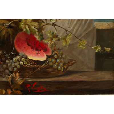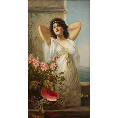 На картине изображена эффектная молодая женщина в античном одеянии, стоящая на террасе с видом на море. Её поза, с поднятыми руками и лёгким поворотом головы, подчёркивает расслабленную грацию и романтизированную чувственность образа. Рядом с ней размещён натюрморт с цветами, виноградом и разрезанным арбузом — элементы, символизирующие плодородие, изобилие и декоративное изящество.
