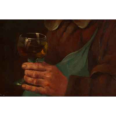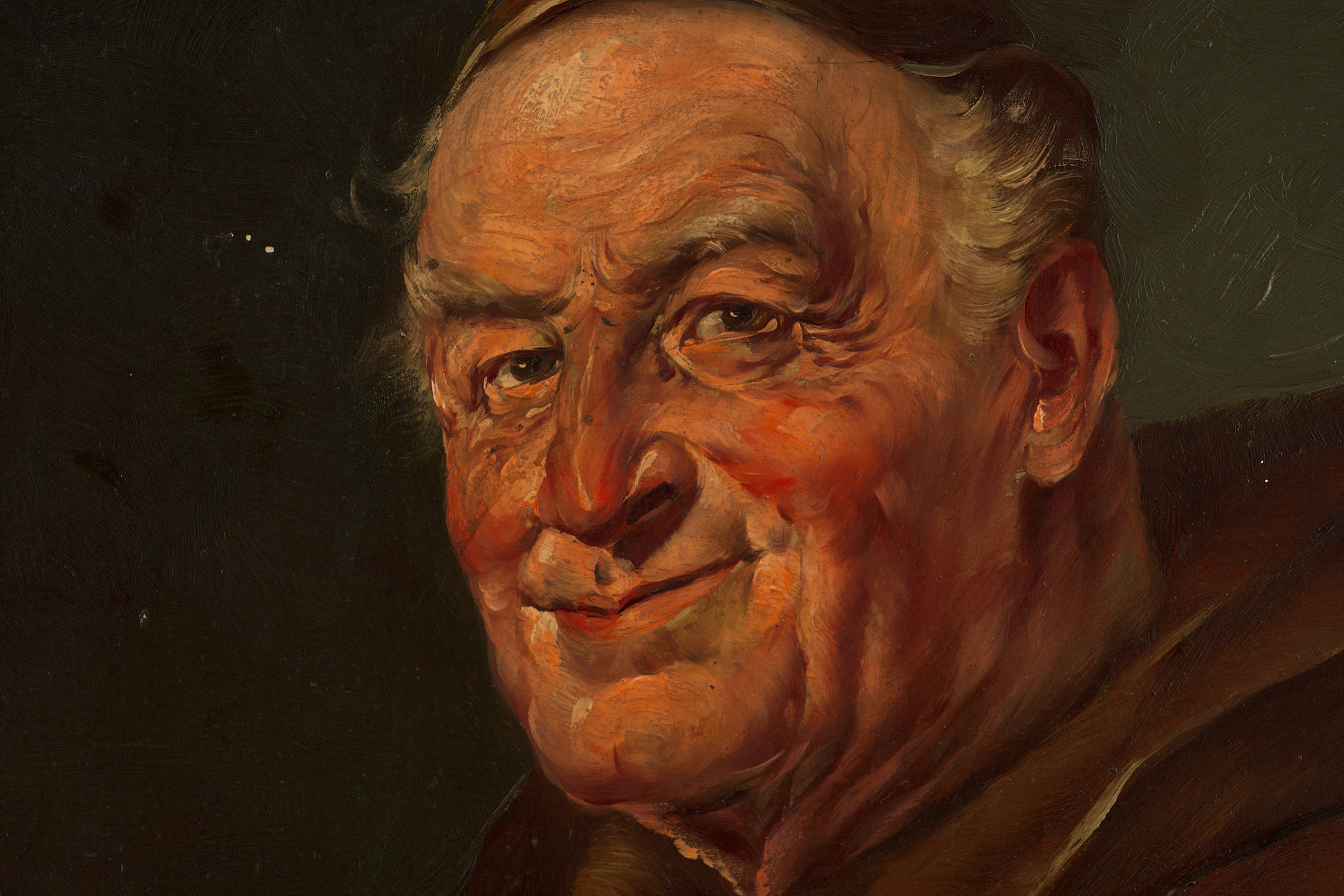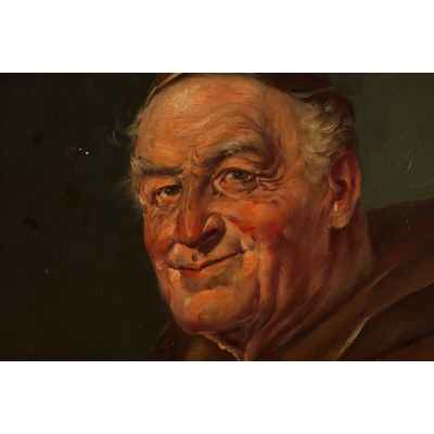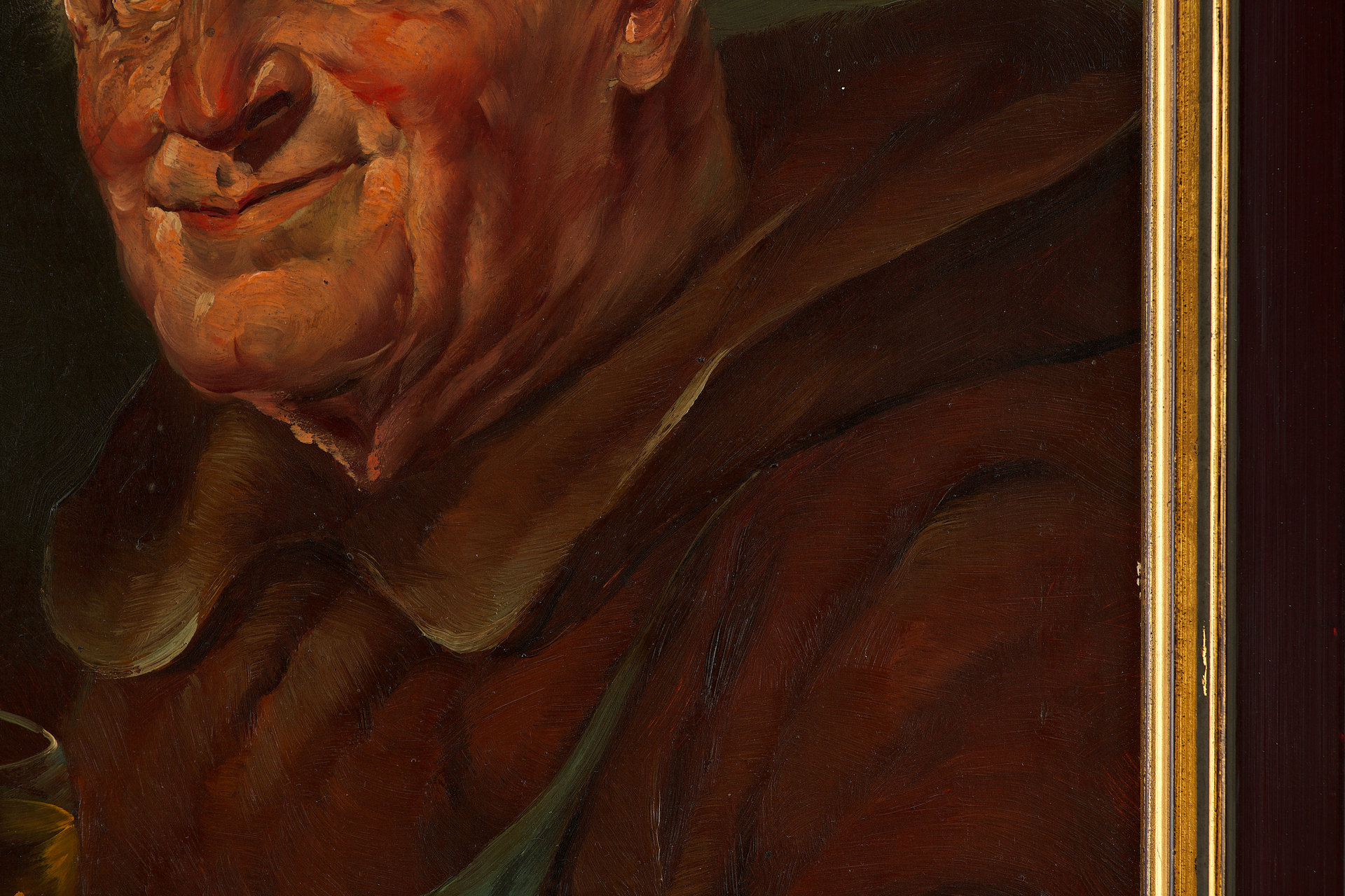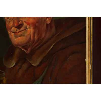На картине изображён поясной портрет монаха, одетого в традиционное коричневое монашеское облачение с капюшоном и повязанным поверх зелёным фартуком. В его руке — бокал с вином, а на лице играет ироничная, добродушная улыбка. Персонаж обращён к зрителю, что придаёт сцене эффект непосредственного контакта и лёгкой театральности. Фон картины тёмный и нейтральный, что акцентирует внимание на лице и руках фигуры.