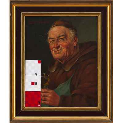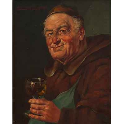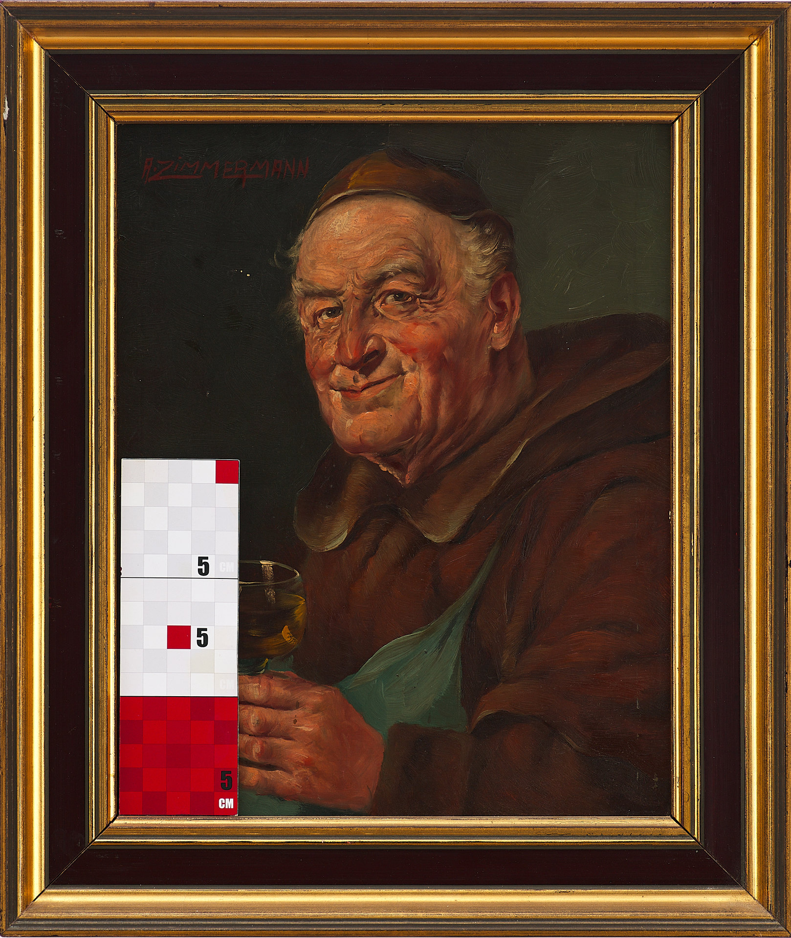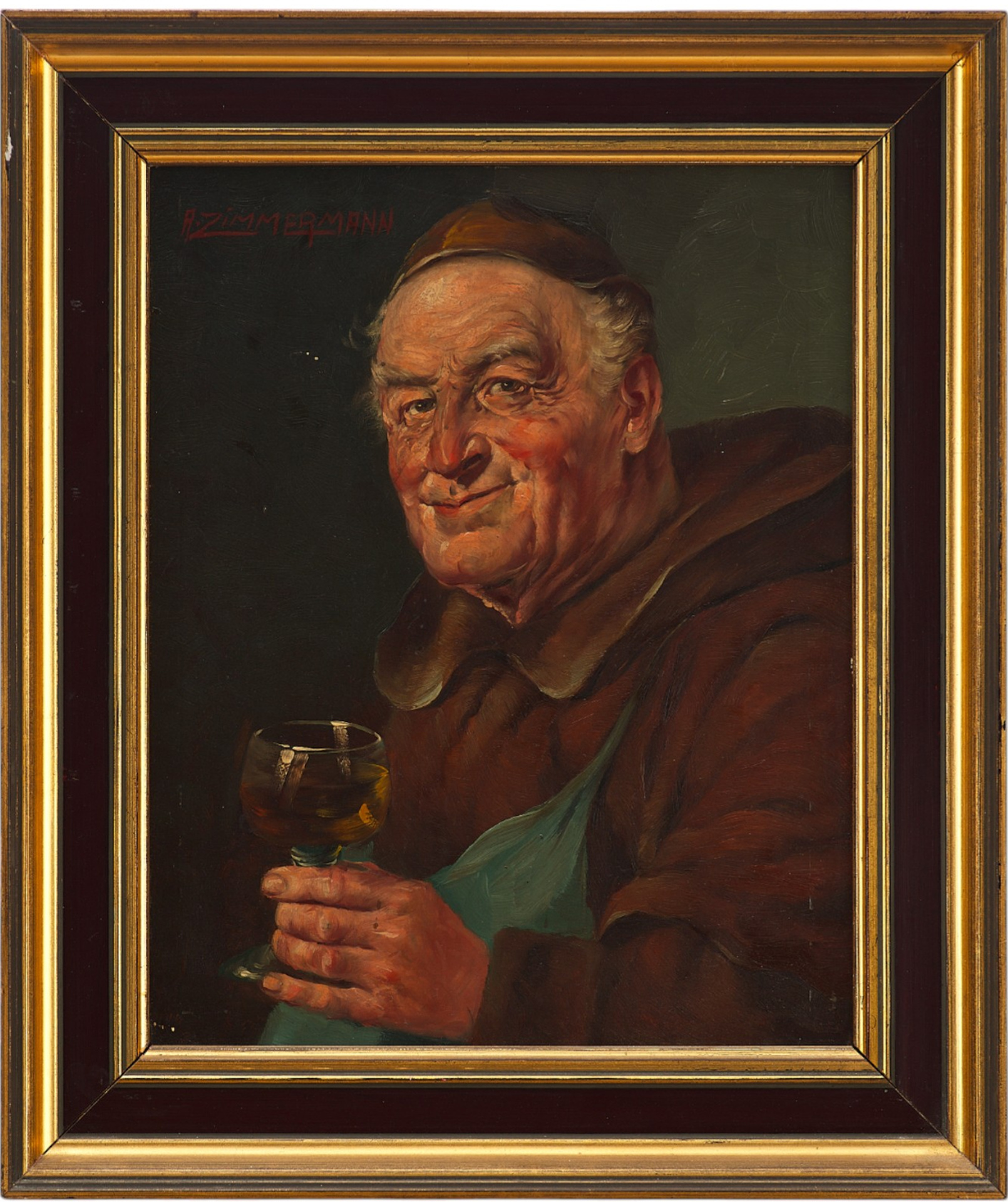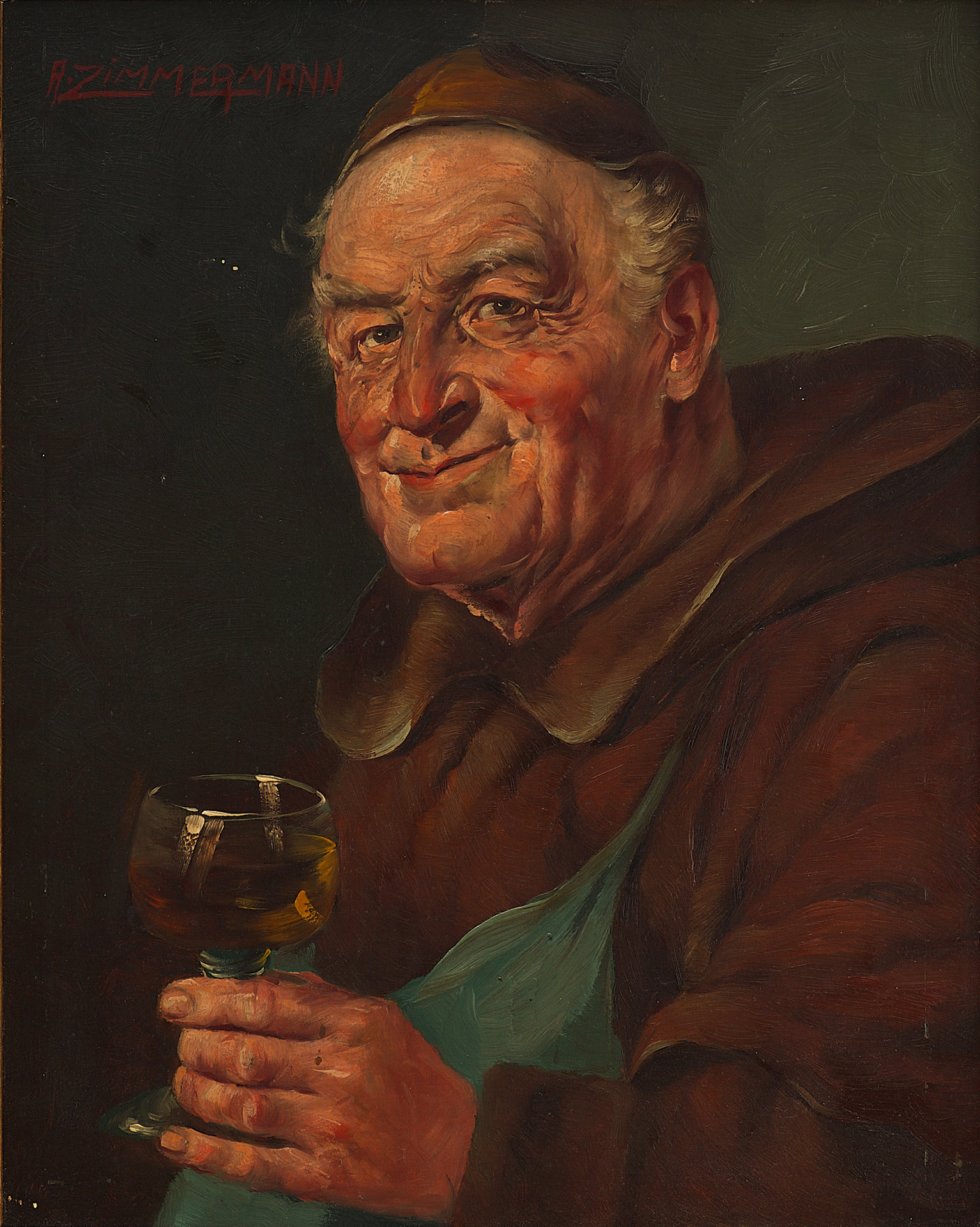 Произведение выполнено немецким художником А. Циммерманном (A. Zimmermann) в начале XX века, в технике масла по картону. Жанровая сцена вписывается в традиции мюнхенской школы живописи, тяготеющей к реалистической трактовке и выразительности индивидуальных характеров. Особенно популярен был в то время образ монаха в бытовой обстановке — как ироничный, но тёплый символ простой радости жизни, унаследованный от таких мастеров, как Эдуард фон Грютцнер и Эрнст Новак.