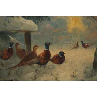 На картине изображён зимний лесной пейзаж, в котором группа фазанов собирается у небольшого деревянного укрытия, покрытого снегом. Деревья покрыты инеем, а рассветное или закатное солнце пробивается сквозь густую дымку и ветви, придавая сцене мягкое золотистое освещение. Композиция построена так, чтобы подчеркнуть гармонию природы и её обитателей: фазаны изображены с живописной точностью, а фон наполнен мягкими градациями цвета и света.