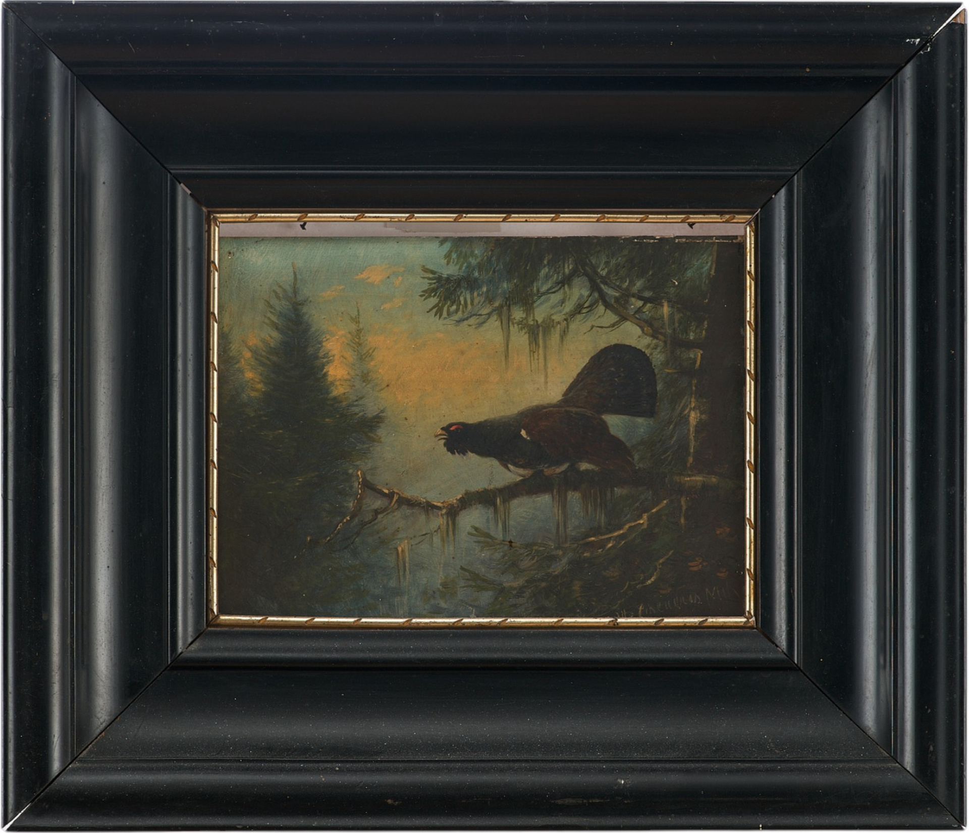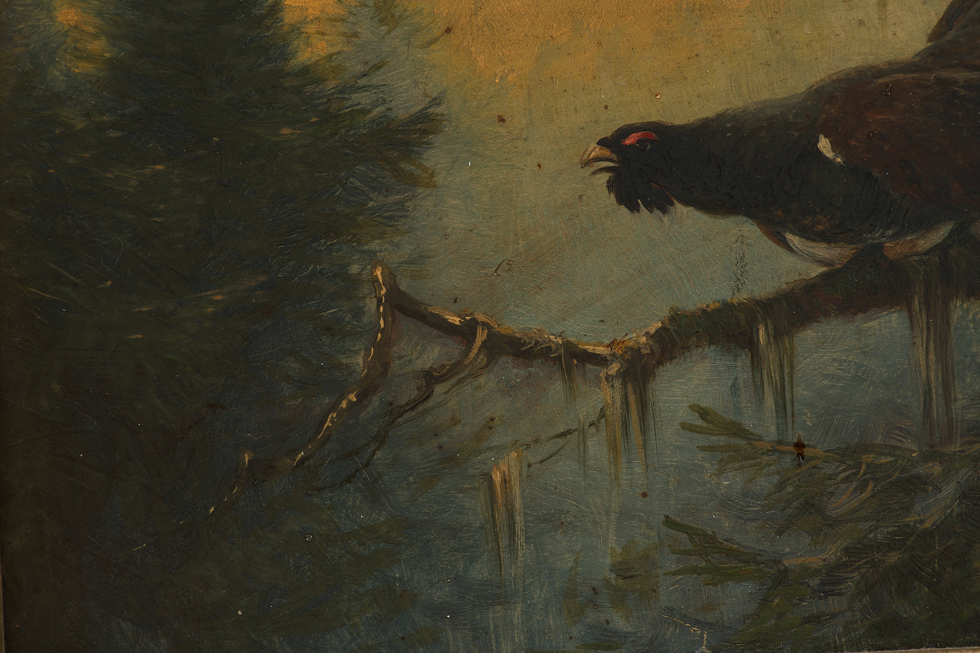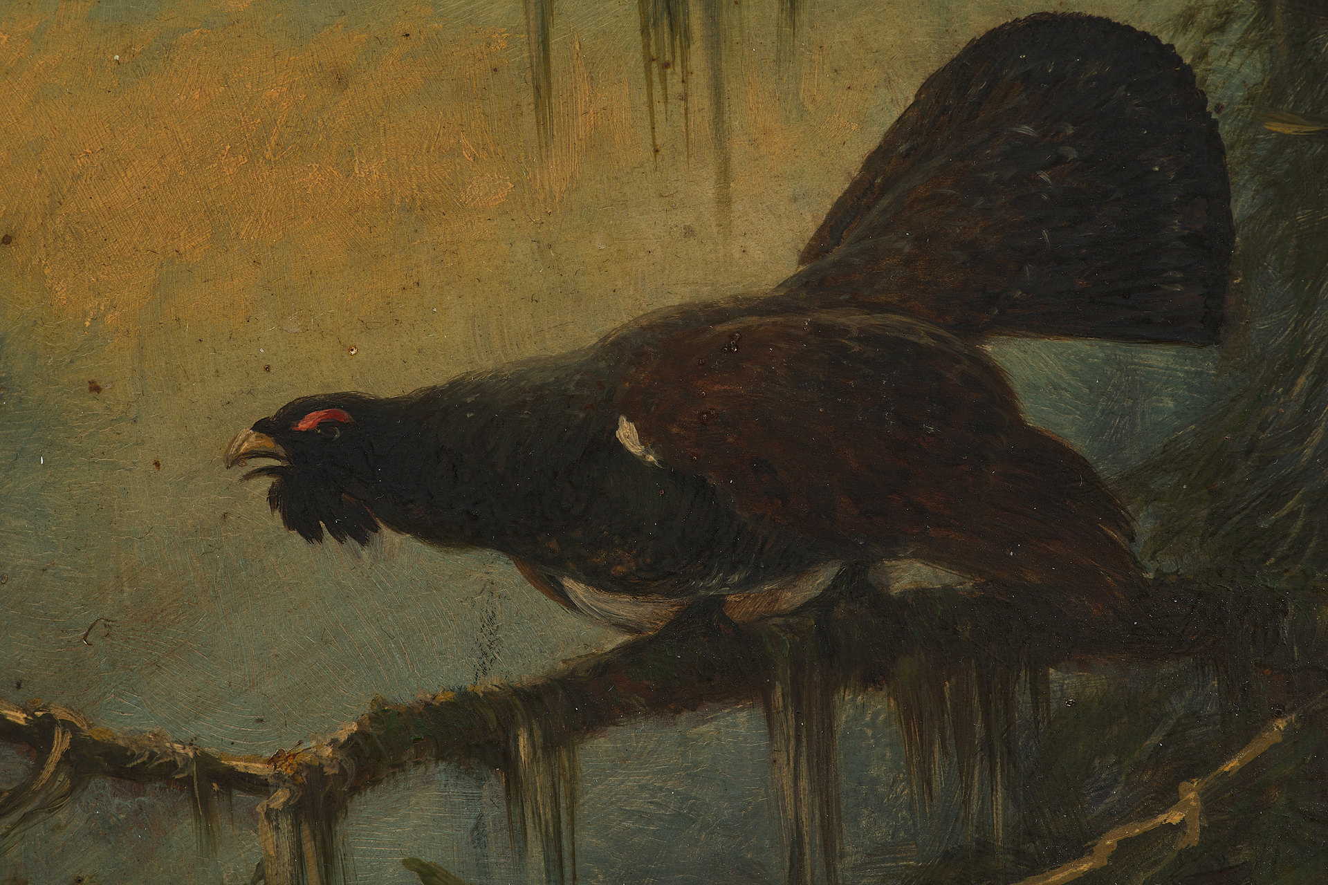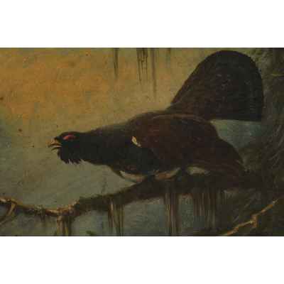 Изображённый глухарь — традиционный герой немецкой охотничьей и натуралистической живописи. Композиция передаёт напряжённую тишину утра и уединённость леса, в котором животное чувствует себя полноправным хозяином. Такая сцена могла быть как частью декоративного цикла в охотничьем зале, так и самостоятельной камерной работой для частной коллекции.