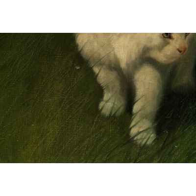 На картине изображены две белоснежные кошки, идущие по траве: взрослая кошка и котёнок, следующие в одном направлении. Их движения синхронны, хвосты высоко подняты, что придаёт сцене динамику и внутреннее единство. Фон — густая тёмно-зелёная трава, написанная широкой и плотной кистью, создающей эффект мягкого, колышущегося пространства. Кошки освещены боковым светом, что подчёркивает их шерсть и придаёт объём фигурам.
