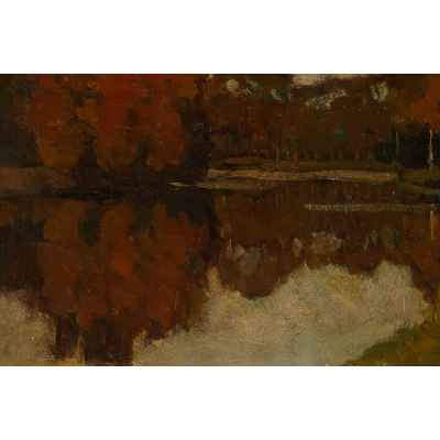 На картине изображён осенний лесной пейзаж с отражением деревьев в спокойной воде. Композиция построена на горизонтальном ритме: широкая гладь воды занимает нижнюю часть полотна, отражая группу деревьев с золотисто-красной листвой, возвышающихся на противоположном берегу. Облака рассекают вечернее небо, окрашенное мягким, приглушённым светом, создающим атмосферу умиротворённости и созерцания.