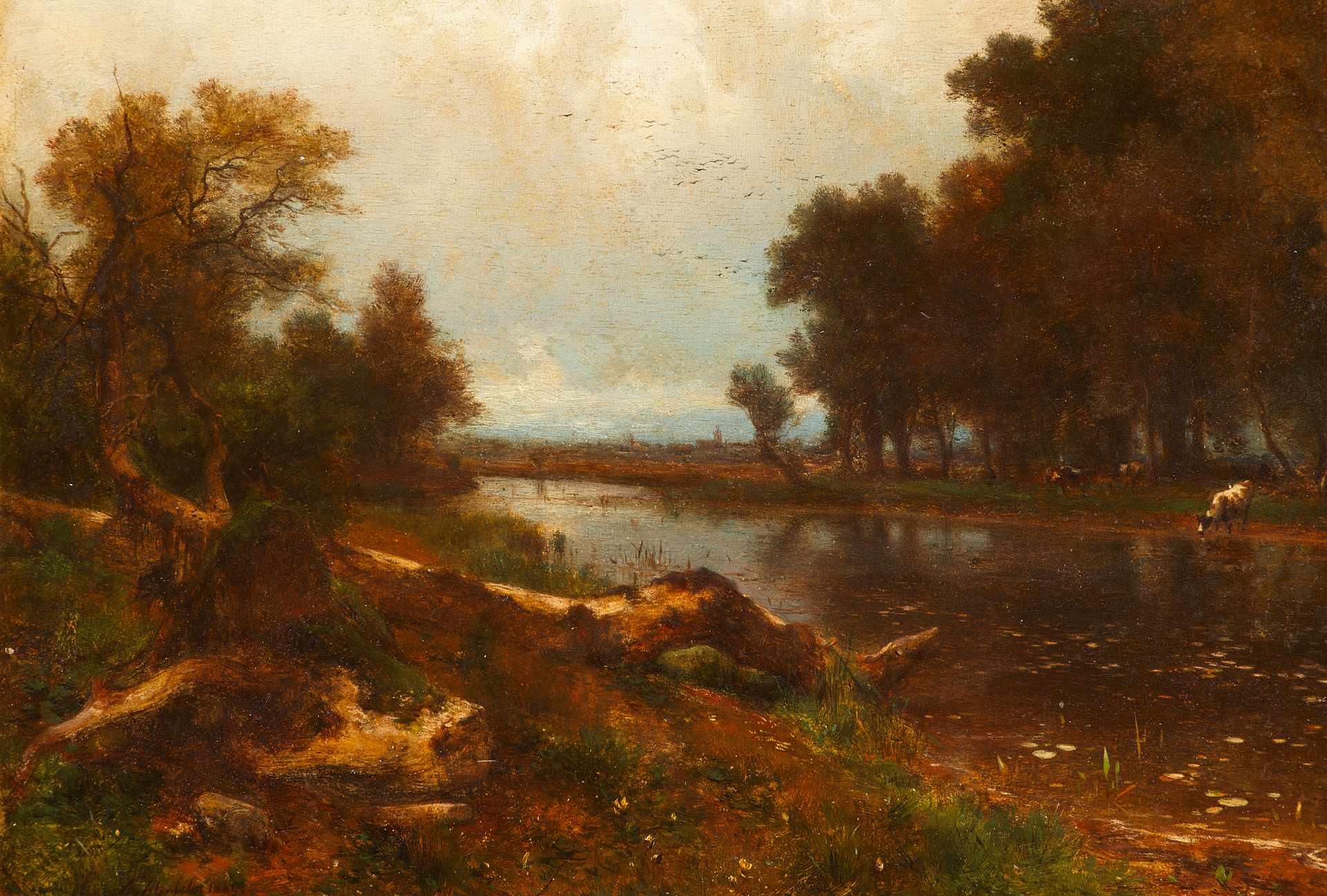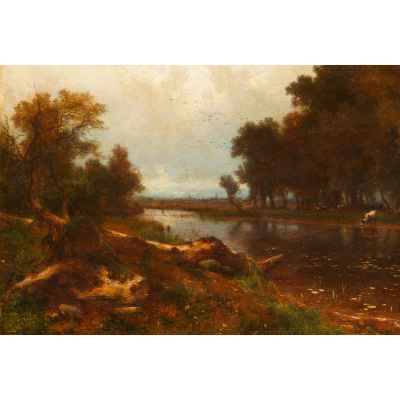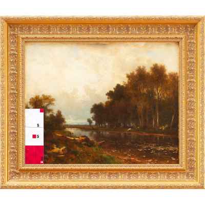 На картине изображена роща у реки на дальнем плане. Рядом пасется стадо коров. На переднем плане изображен ствол упавшего дерева. Мотив работы и принципы композиционного изображения предметов в пространстве картины совпадают с традициями барбизонской школы живописи. Впоследствии автор ещё не раз обращался к изображению вида этой местности. Слева внизу подпись и дата: «Е. Lihtenfel 1869». Анализ соотношения подписи с красочным слоем позволяет считать её подлинной, аналогичной подписям автора на других его произведениях.
