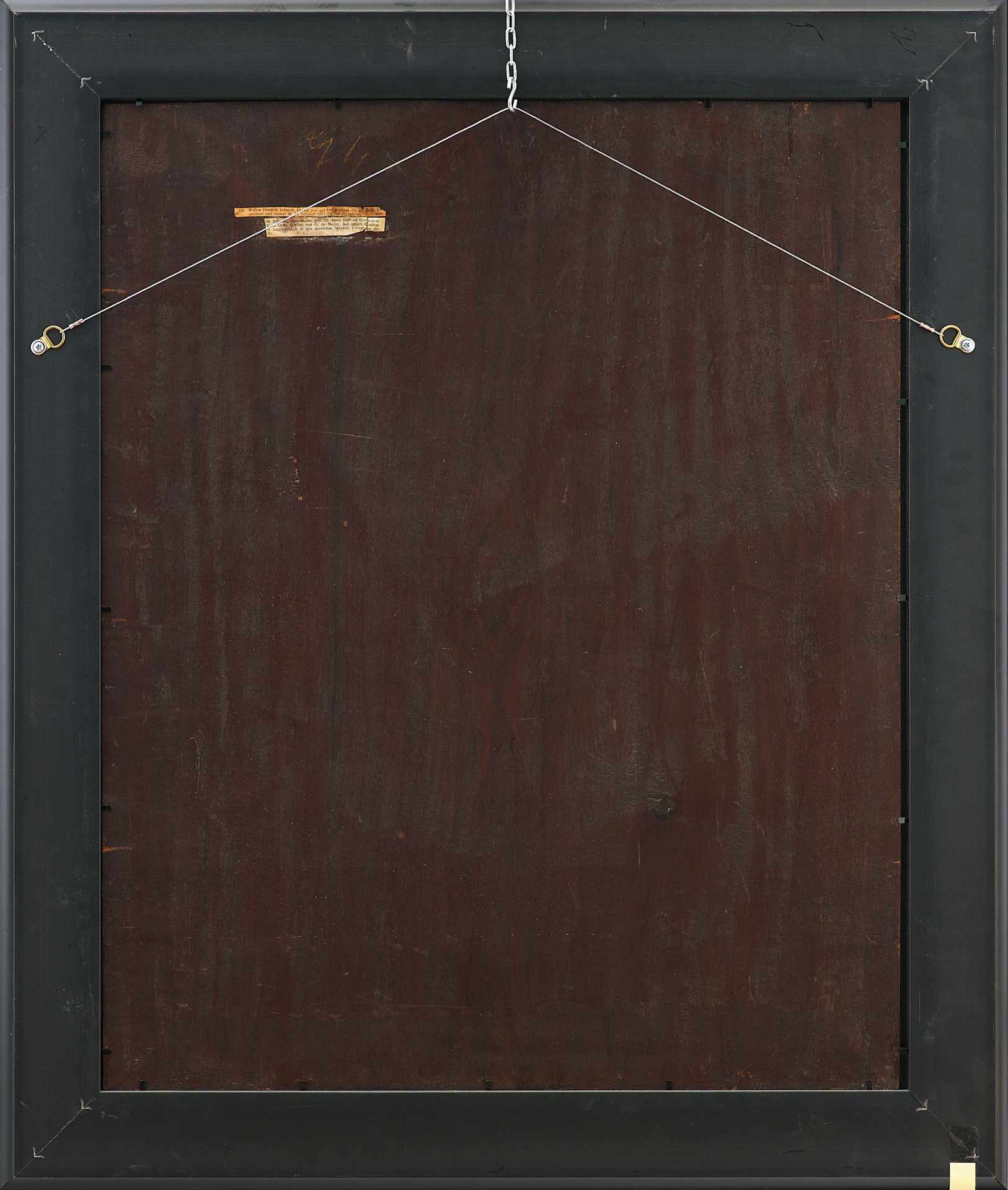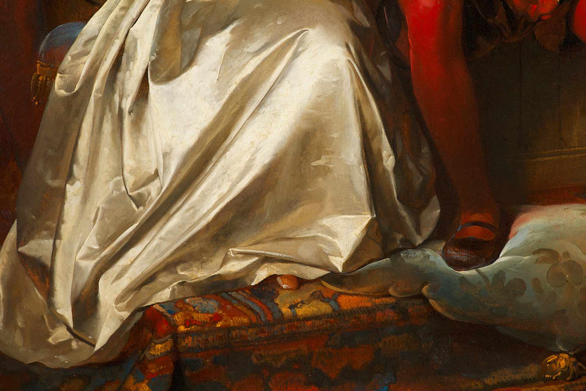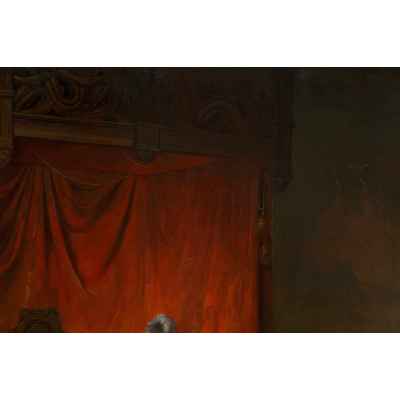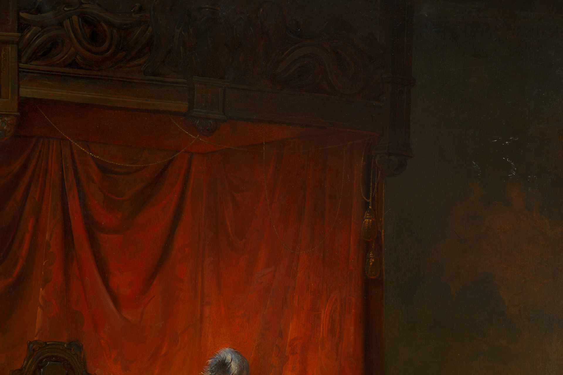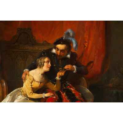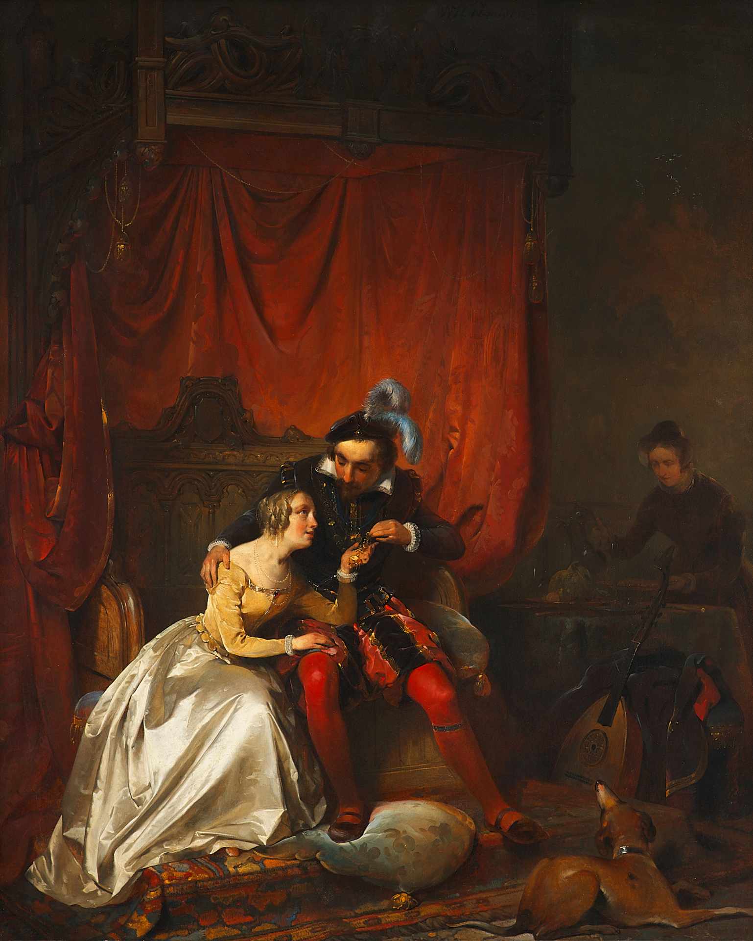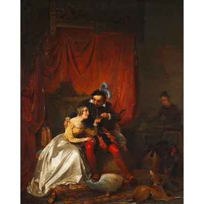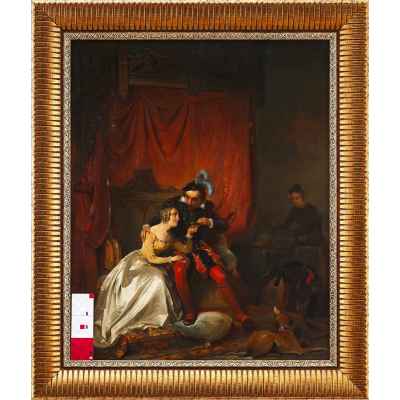 Представлена картина, где изображена сцена исторического жанра. Вероятнее всего, на картине изображен шотландский (будущий английский) король Яков I, дарящий своей возлюбленной (?) кулон на золотой цепи форме знака ордена Золотого руна, имеющегося у него самого. На его левой ноге старейший английский орден Подвязки. В центре по верхнему краю подпись и дата: «WH Schmidt 1837». Подпись имеет общий с живописью характер старения. На обороте имеются бумажные наклейки сообщающие данные о картине и её авторе. Использованные в картине материалы соответствуют указанному времени её создания. Композиция, мотив картины, общий колорит и приемы изображения соответствуют принципам живописи голландского художника Виллема Хендрика Шмидта. Подлинность исследуемой картины сомнений не вызывает. Работа выполнена на высоком профессиональном уровне и представляет интерес для частных собраний.