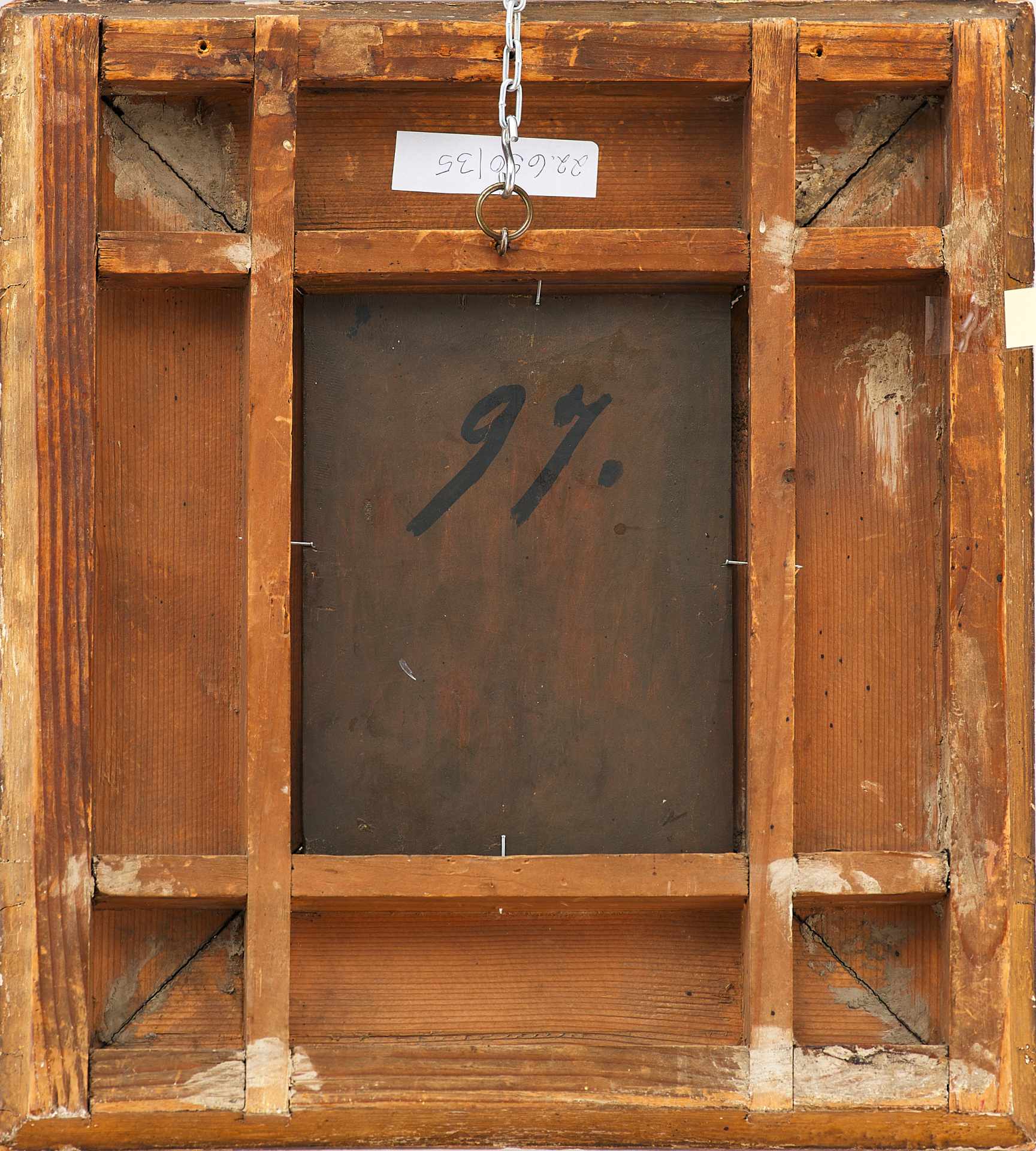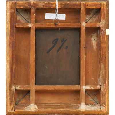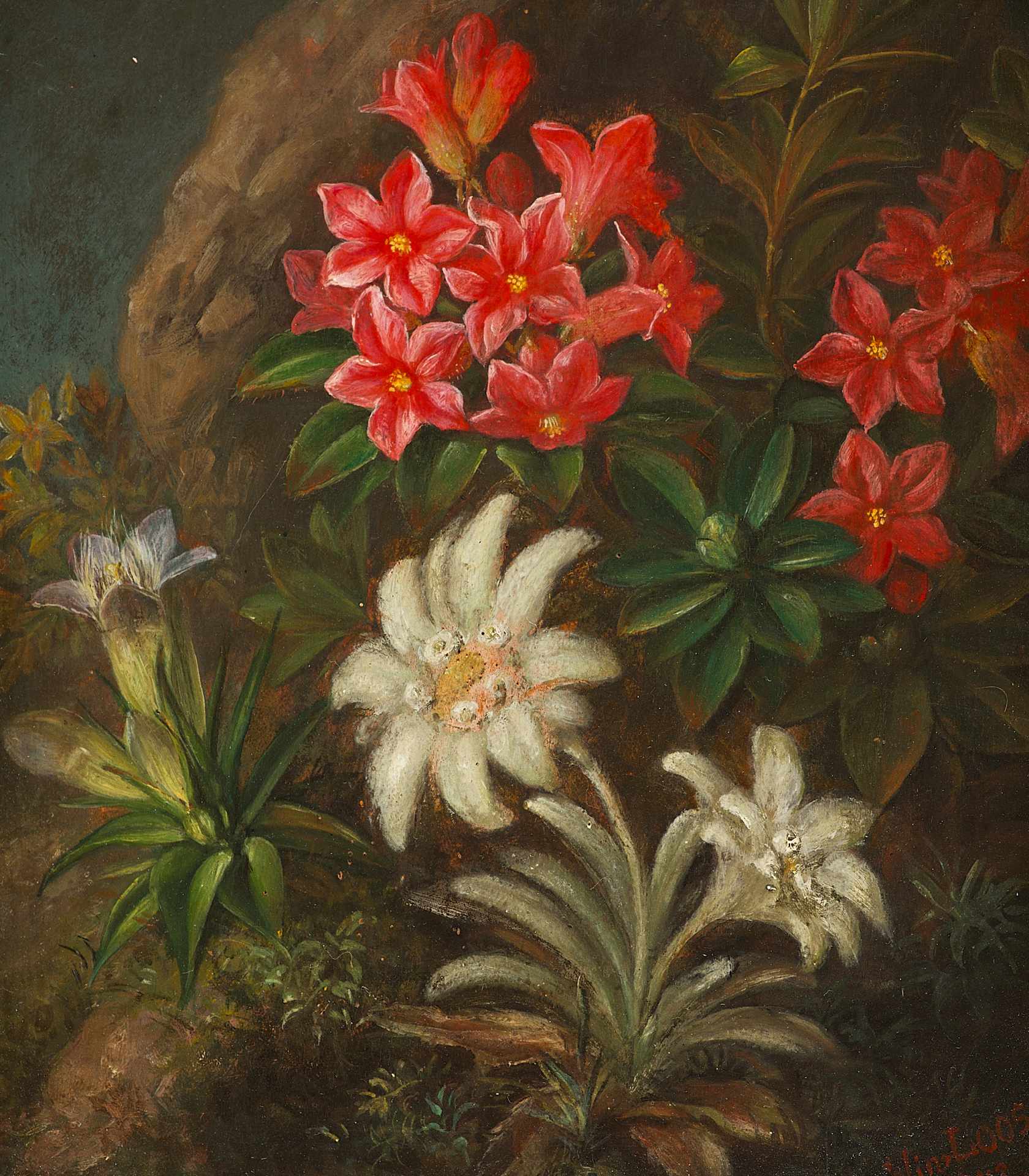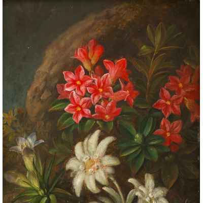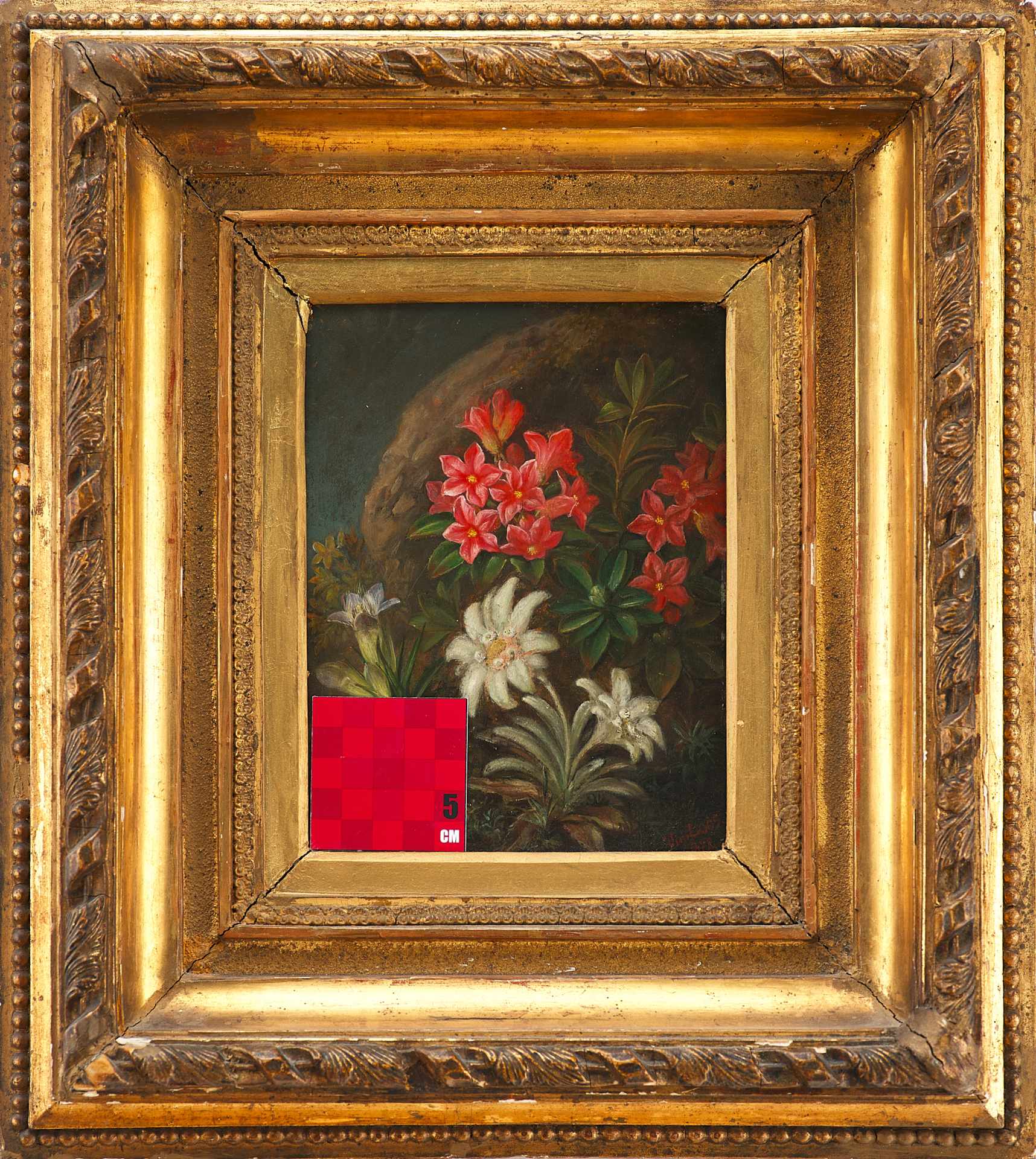 На картине представлена цветочная композиция: группа лилейников, растущих на земле и огороженных камнями, изображена сверху. На фоне ажурной зеленой листвы видны соцветия из мелких красных цветков, белые и голубые лилейники. Фон темный. Справа внизу на картине авторская подпись и дата: “Vin Loos 1872”. Авторская подпись полностью соотносится с красочным слоем произведения, что дает возможность считать ее подлинной. Подлинность работы не вызывает сомнений. Приемы изображения, манера письма, красочная палитра соответствует принципам живописи 1870-х гг. По состоянию живописных материалов время создания работы не противоречит указанной датировке. Произведение выполнено на профессиональном уровне и представляет интерес для частных собраний.