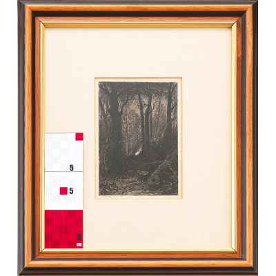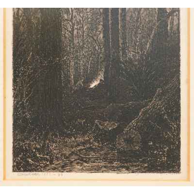 Слева внизу под офортом подпись и дата: «Шишкинъ 1873-00». По способу нанесения сомнений в подлинности не вызывает. По начертанию подпись имеет аналогии с автографами И.И. Шишкина того периода.