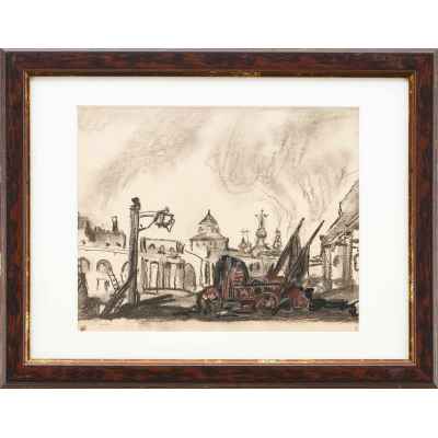 На рисунке представлен ночной пейзаж с жанровой сценой.