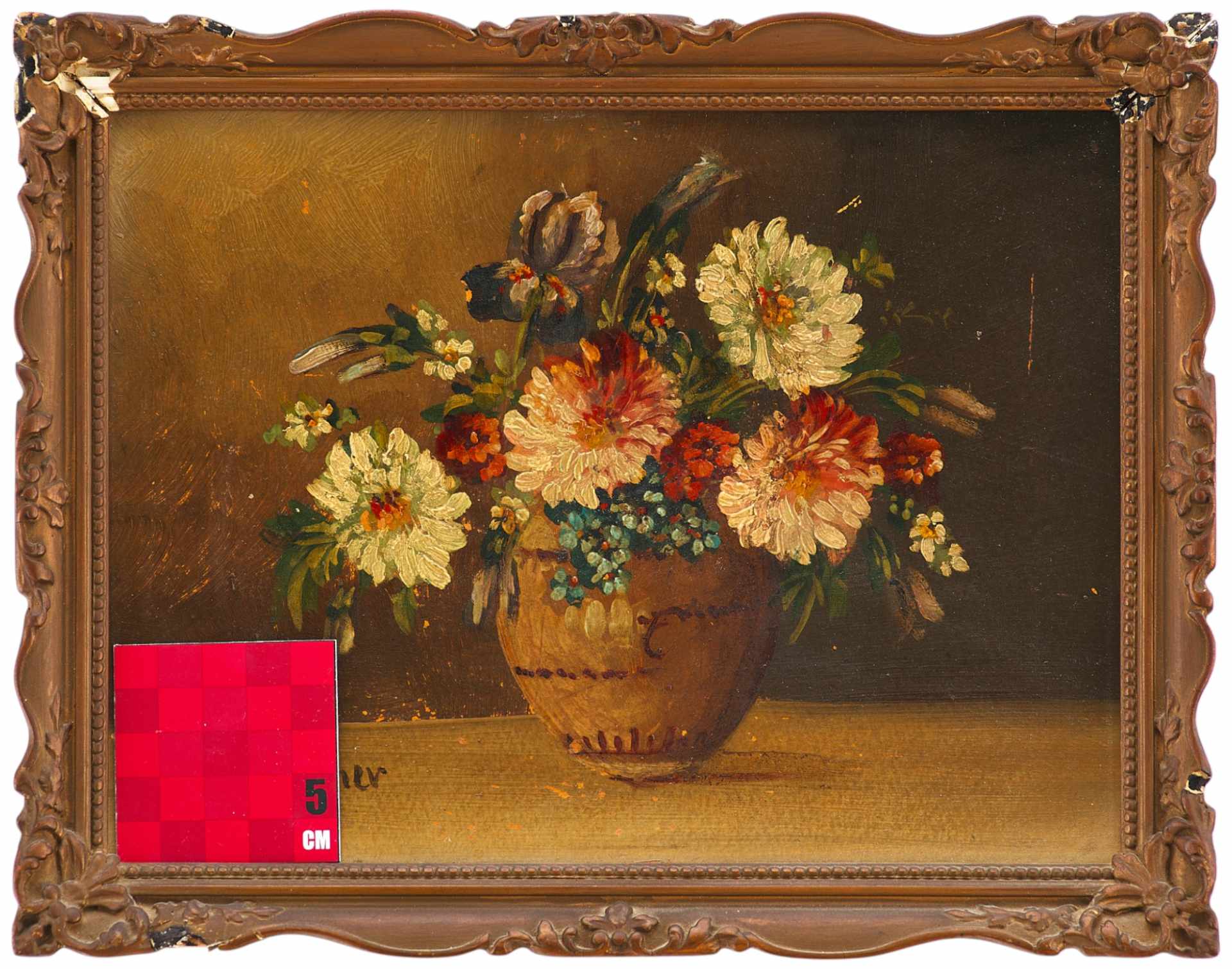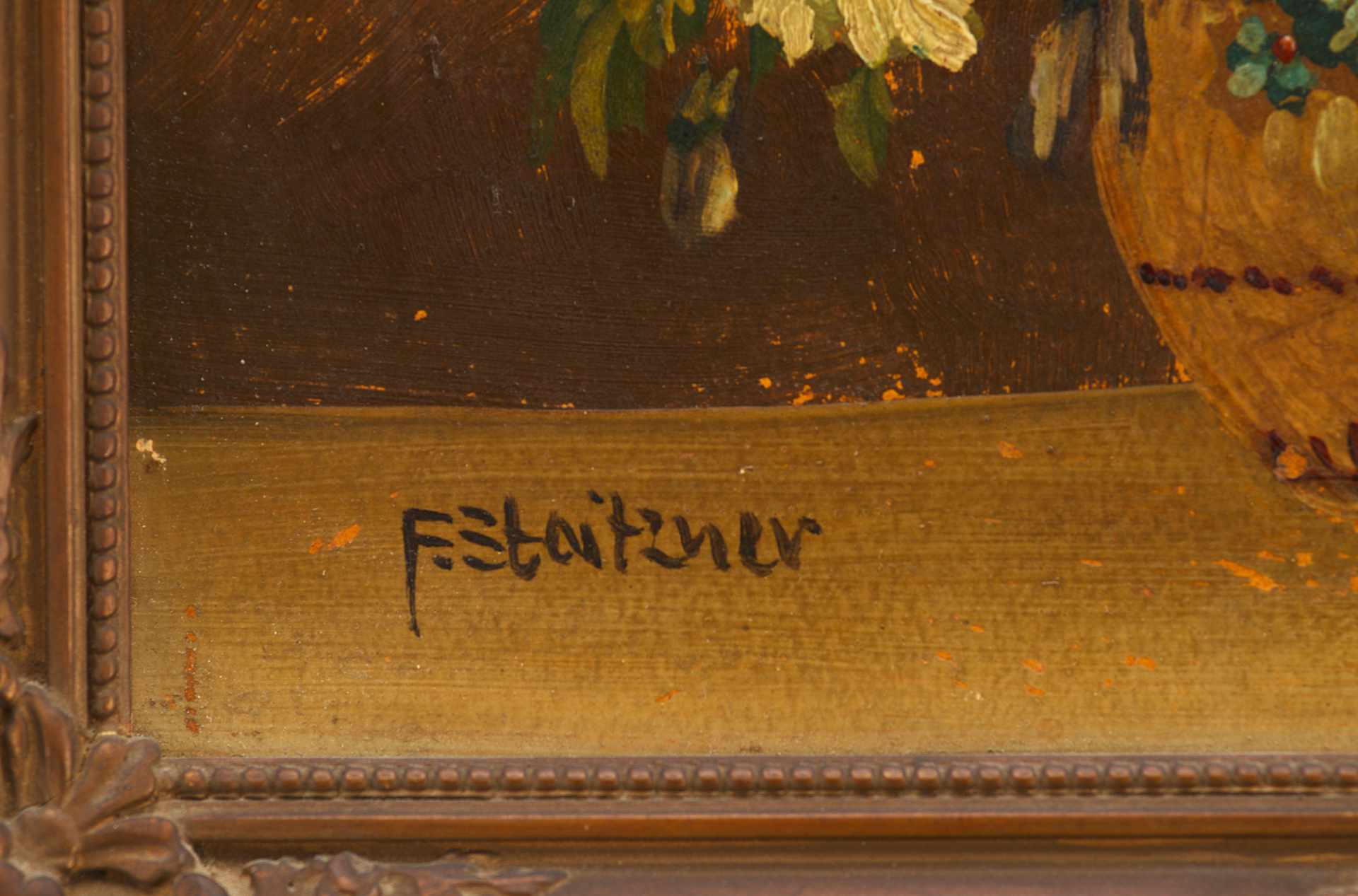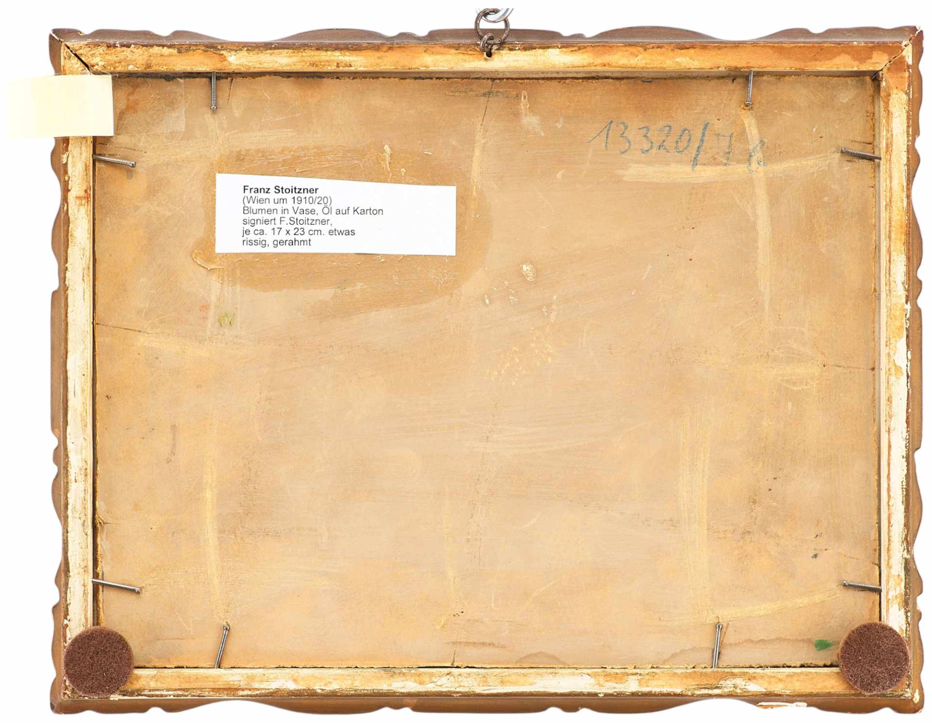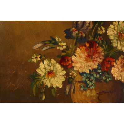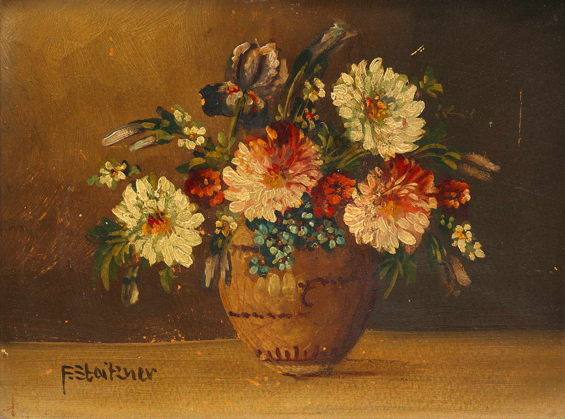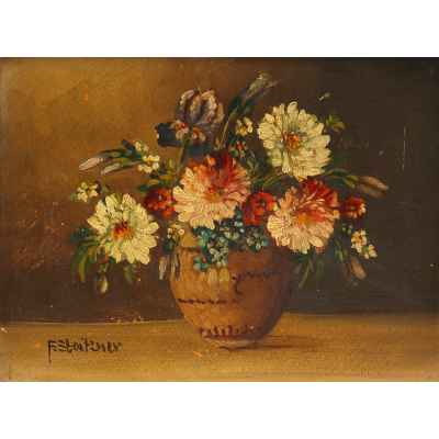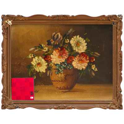 На светлой поверхности стола изображена ваза с букетом цветов. Ваза имеет формѵ бочонка светло-коричневого цвета с горизонтальными прерывающимися линиями, имитирующими обручи. Над вазой в обрамлении ярко-зеленых листочков склонились головки георгинов. Цветки нежных оттенков: бледно-желтые, розоватые. Среди них видны и другие цветы: ирис, незабудки и мелкие оранжево-красные цветочки. Слева внизу авторская подпись: “F. Stoitzner”. Авторская подпись полностью соотносится с красочным слоем произведения, что дает возможность считать ее подлинной. Сюжет, приёмы изображения, рисунок, палитра типичны для F.Stoitzner. Состояние материала живописная манера автора соответствует датировке - 1910/20-е годы. Работа выполнена на профессиональном уровне и представляет интерес для частных собраний.