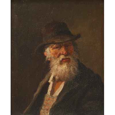 На картине на темном фоне погрудный портрет пожилого мужчины. Слегка наклонив голову. Он смотрит на зрителя. Из-под фетровой шляпы, натянутой на лоб, видны седые волосы, его лицо обрамляют усы и окладистая борода. Глаза мужчины слегка прищурены, отчего взгляд становится пристальным. На нем темный сюртук, из-под которого видна светлая рубаха. Справа вверху авторская подпись: "Bassarab”. Анализ соотношения подписи с красочным слоем позволяет считать ее подлинной. По начертанию соответствует почерковой манере подписи Л.Бассараба.