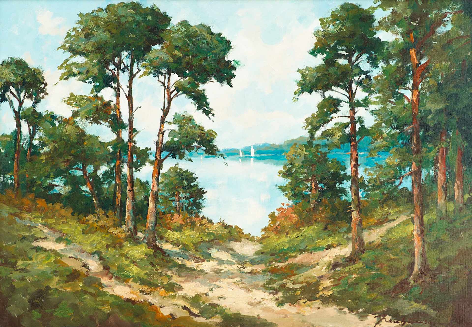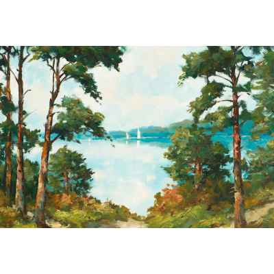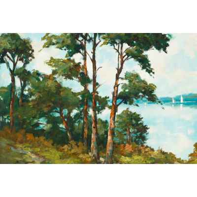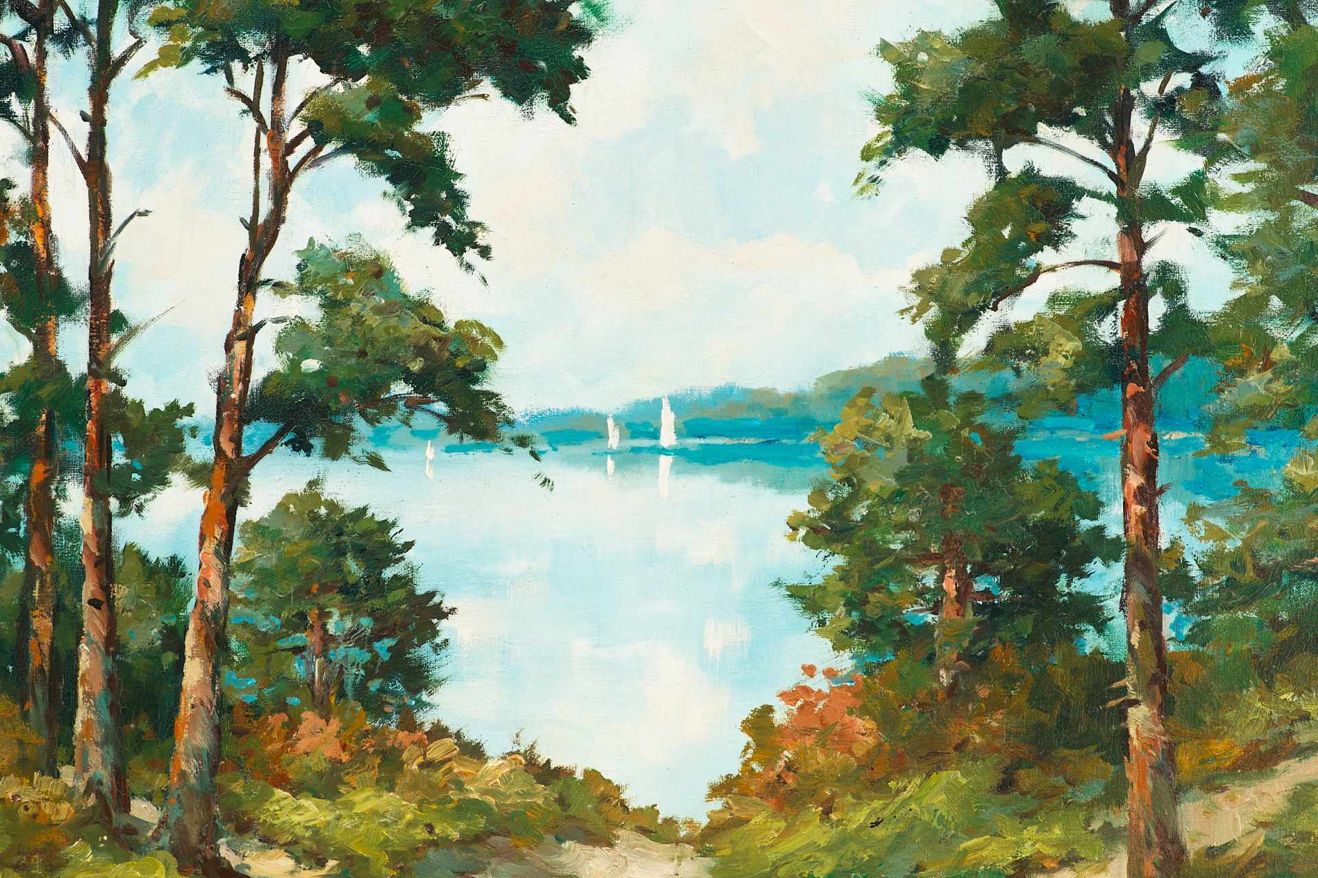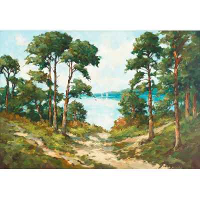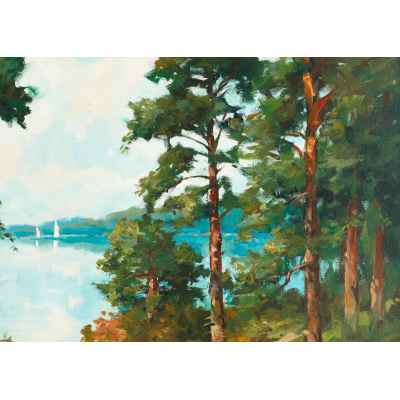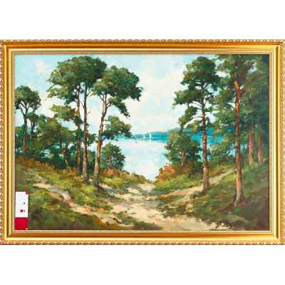 Сосны окружают грунтовую тропу, ведущую к голубому озеру. Тишину пейзажа оживляет присутствие трех яхт на глади воды. Живопись выполнена в академической манере, на профессиональном уровне. Все детали композиции прописаны тщательно, при этом не теряя свежесть восприятия. Непосредственность впечатления дополняется пастозной техникой живописи. Этими чертами славилась живопись галерей и салонов, ориентированных на интерьерные произведения в XX в.