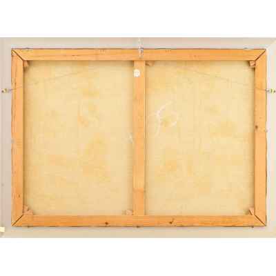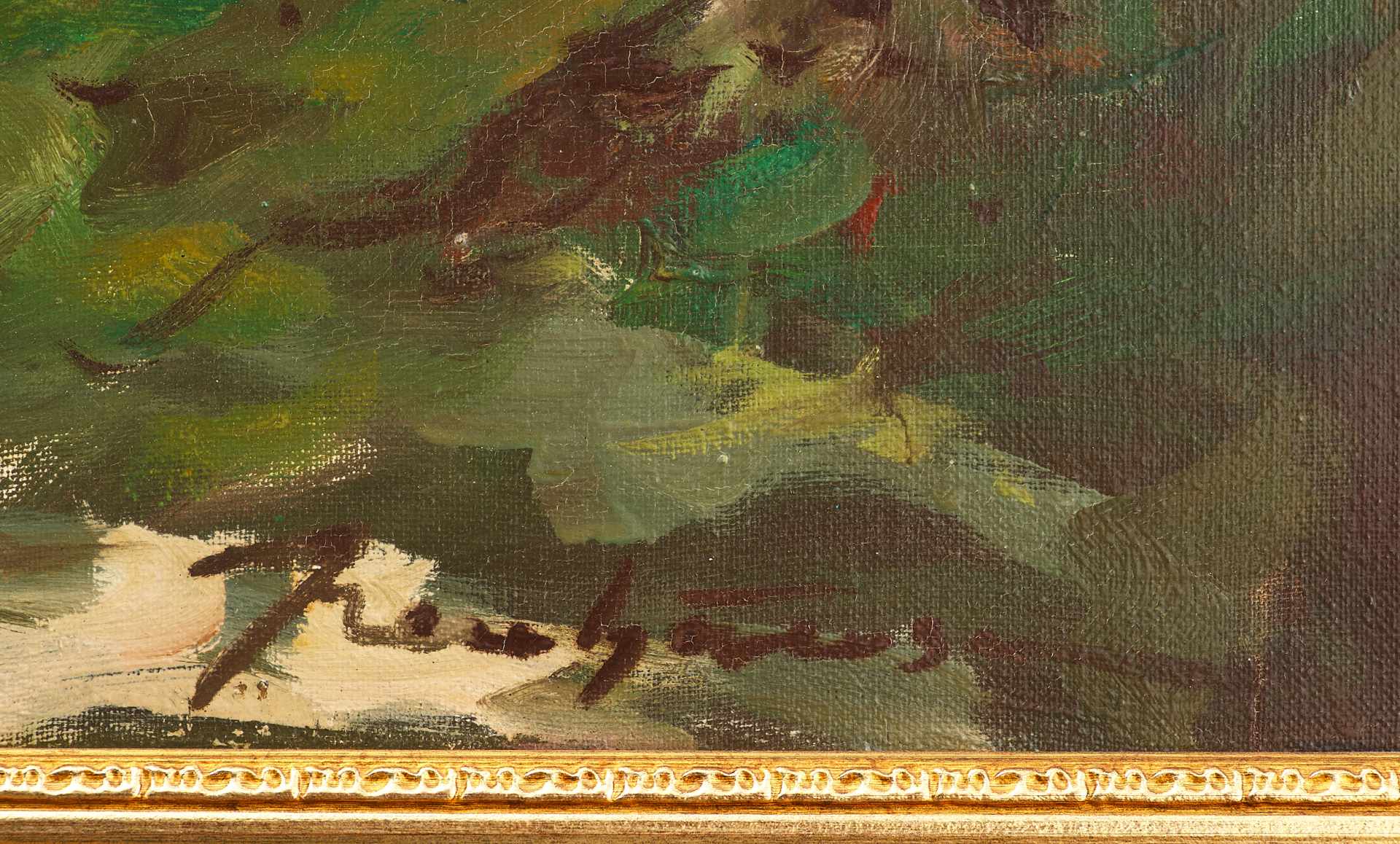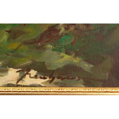 Справа внизу подпись «в тесте» авторской живописи. Подпись неразборчива. Судя по композиции и уровню живописной проработки можно предположить, что автор получил специальное художественное образование, и писал аналогичные пейзажи. Основной упор пейзажа такого типа делался на внешний эффект и декоративность. Состояние живописных материалов исследуемой работы не противоречит указанному времени её создания.