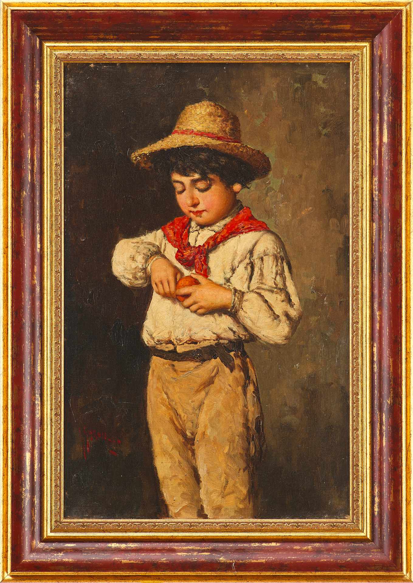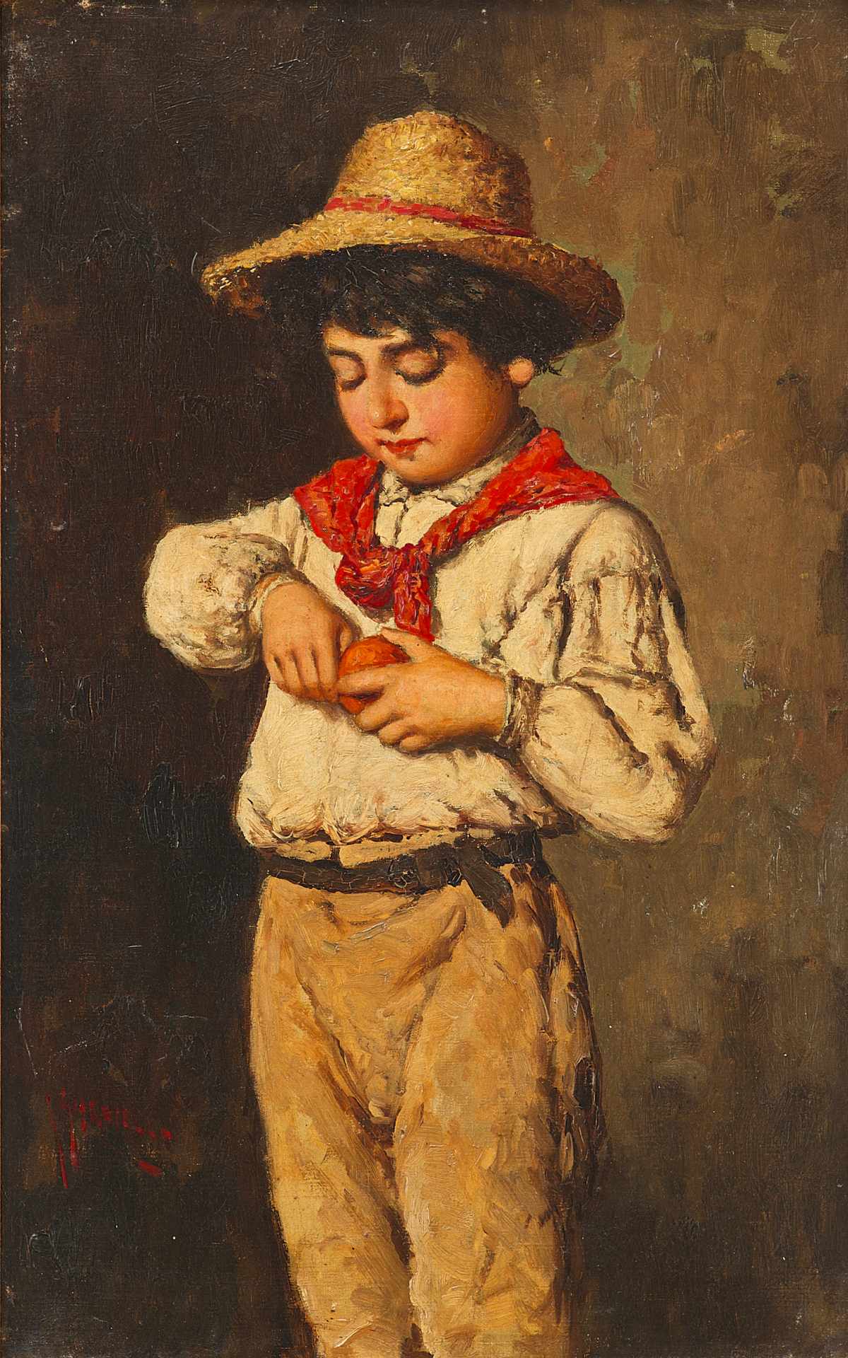 На картине изображён мальчик, чистящий апельсин. Он стоит, держа в руках фрукт и опустив глаза, сосредоточенно смотрит на сладкий плод. Кучерявые темные волосы ребенка покрывает соломенная шляпка с широкими полями. поверх белой рубашки повязан красный шейный платок, запылившиеся брючки затянуты темным пояском. Фон серовато-зеленый. На картине слева внизу авторская подпись: “С Giardiello”.