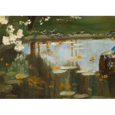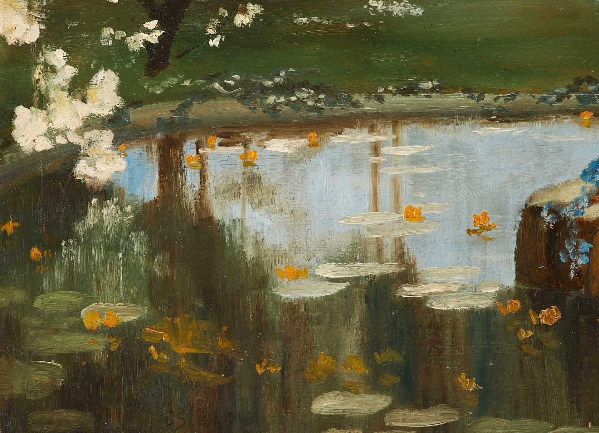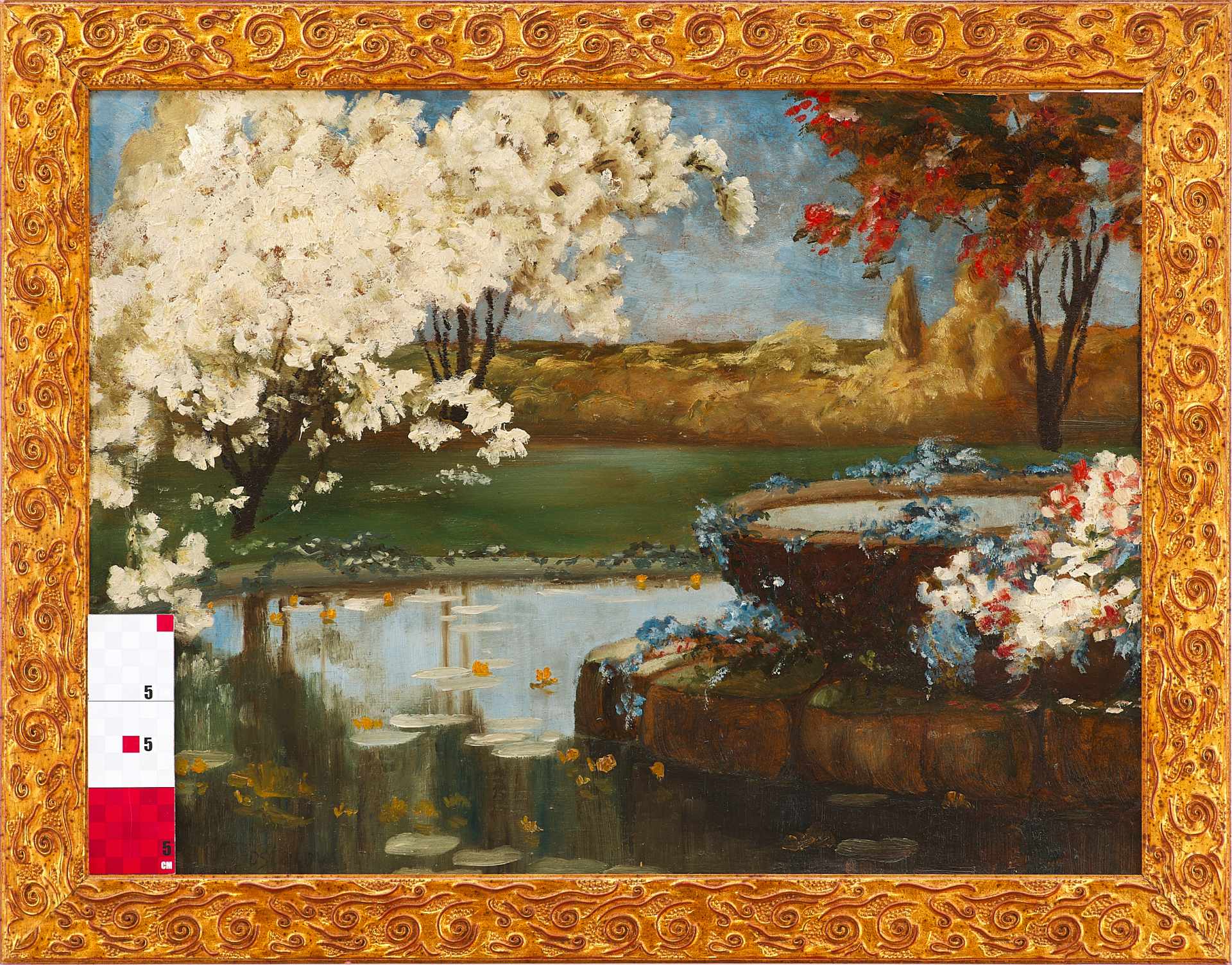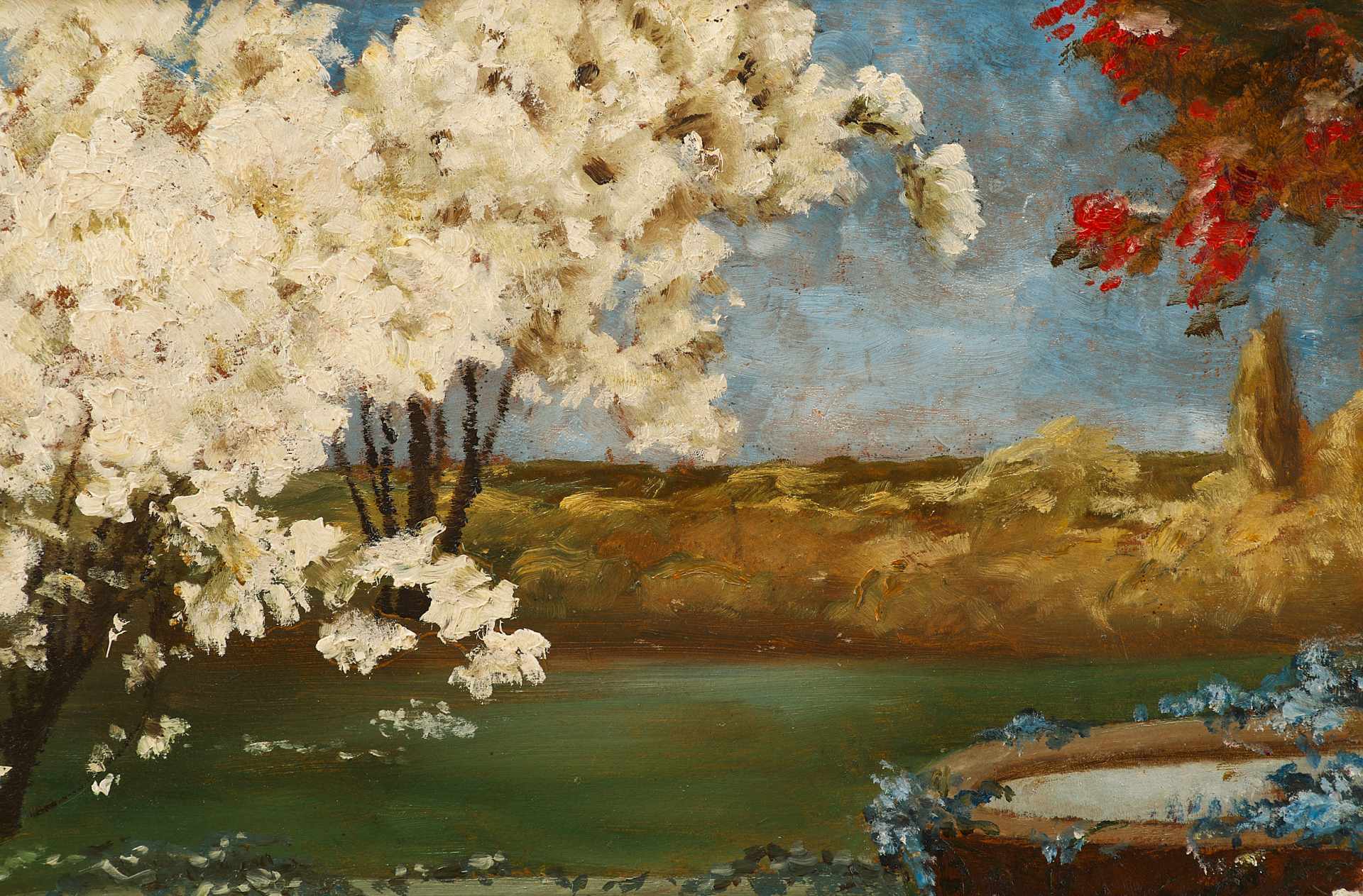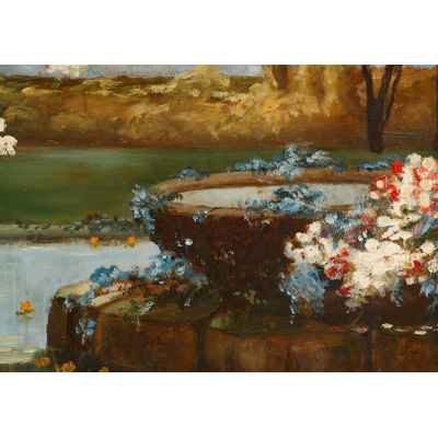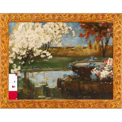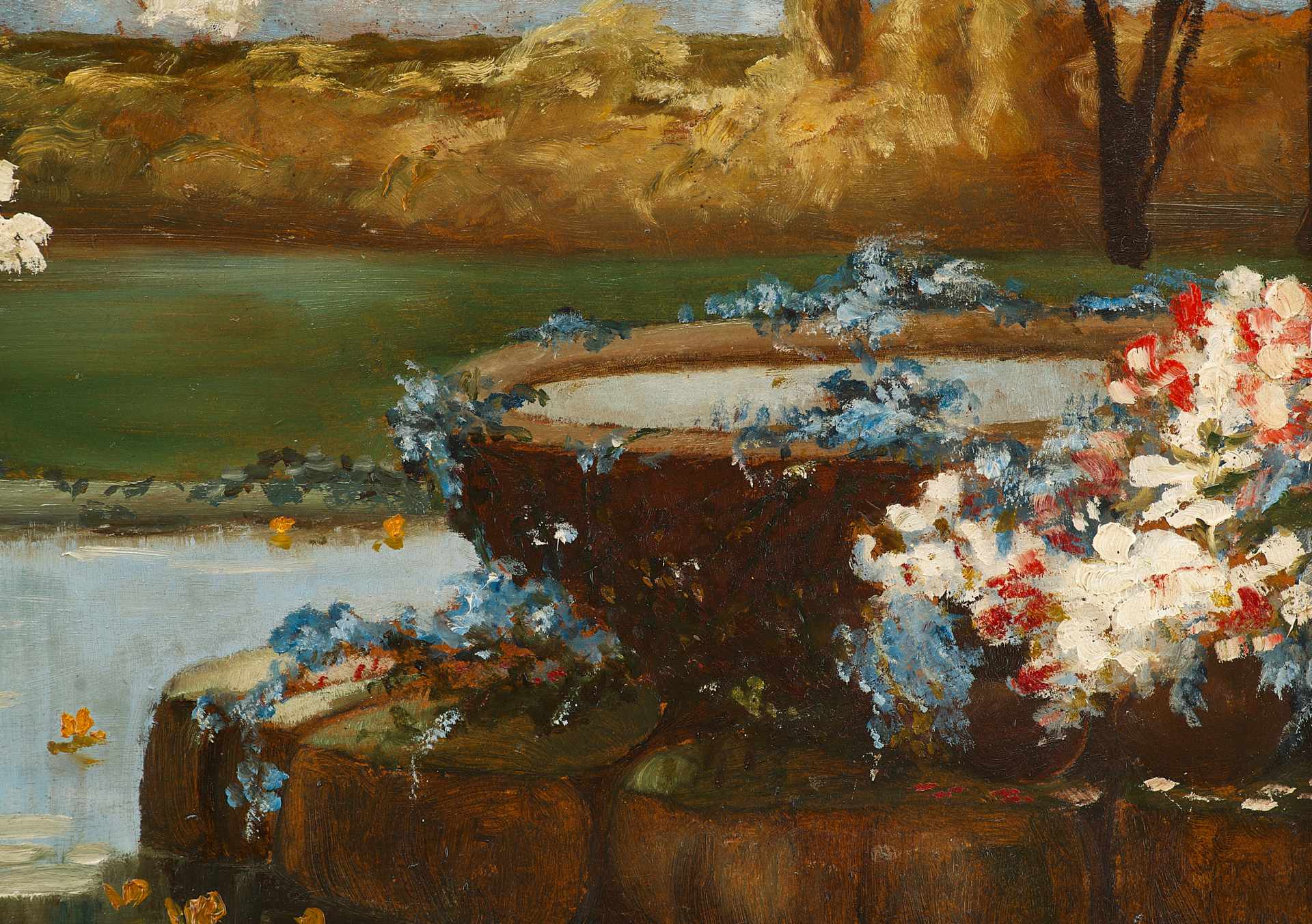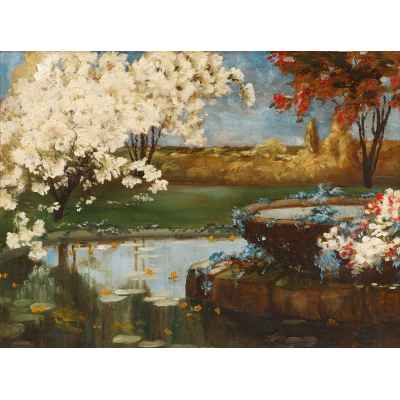 На картине изображён идиллический садовый пейзаж: в центре — круглый каменный водоём, окружённый цветами, рядом раскидистые деревья с белыми и алыми цветущими кронами. На заднем плане открывается просторный ландшафт с зелёным лугом и зарослями, а в отражении водной глади угадываются листья и лепестки. Живописная манера наполнена мягкими мазками, светлым колоритом и декоративной выразительностью.