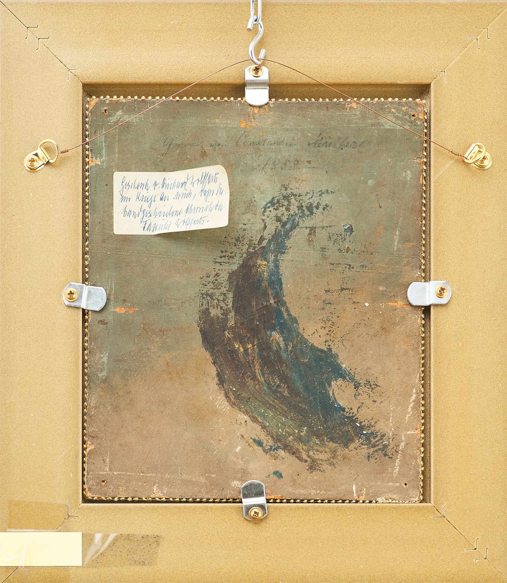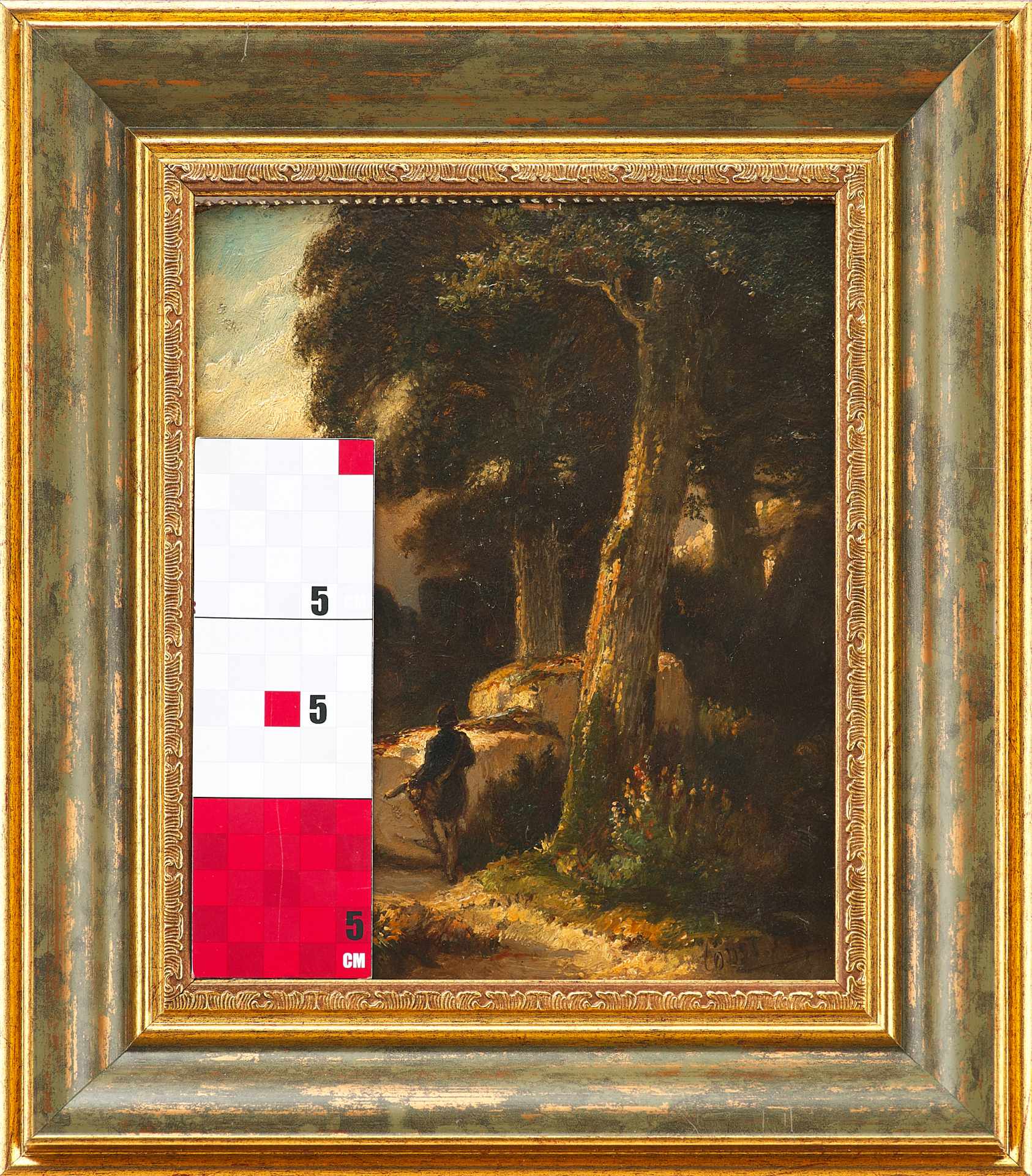 Изображён горный пейзаж в горах, поросших густым лесом, спиной к зрителю стоит путешественник. За его спиной дорожная сумка, а в руках подзорная труба. Мужчина всматривается вдаль. Справа внизу на картине авторская подпись: “Const Mull”, выполнена кистью черным пигментом по полупросохшему красочному слою. Подпись одновременна живописи, является авторской. На обратной стороне картона надпись: “Constantin Muller 1858”. Красочная палитра, приемы изображения, техника исполнения работы соответствуют особенностям живописи Константина Мюллера. Состояние и характер использованных материалов позволяет датировать произведение 1858-м годом. Работа выполнена на высоком профессиональном уровне и представляет интерес для частных собраний.