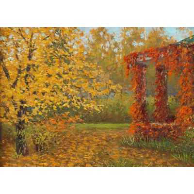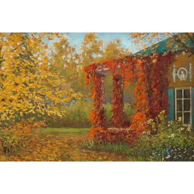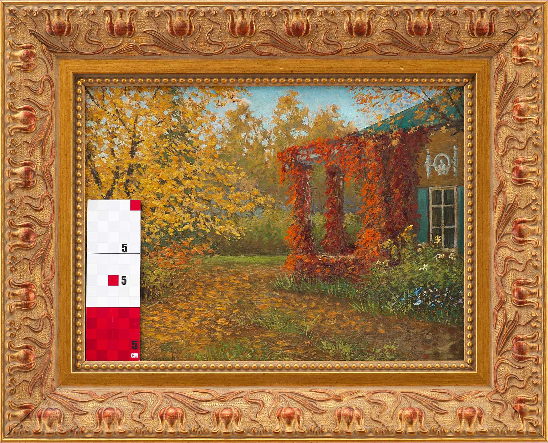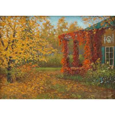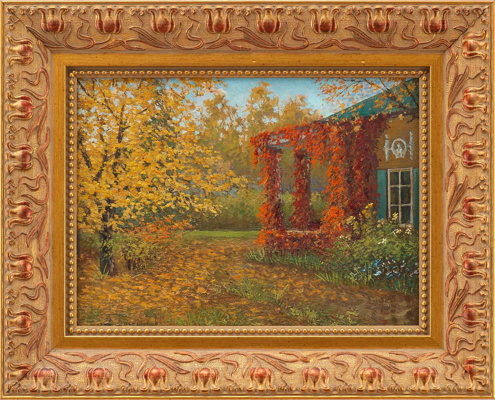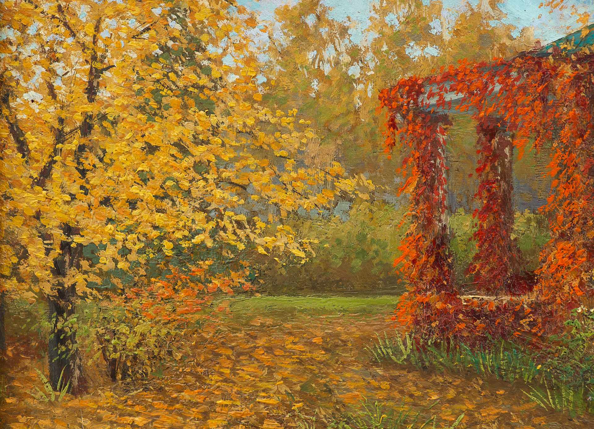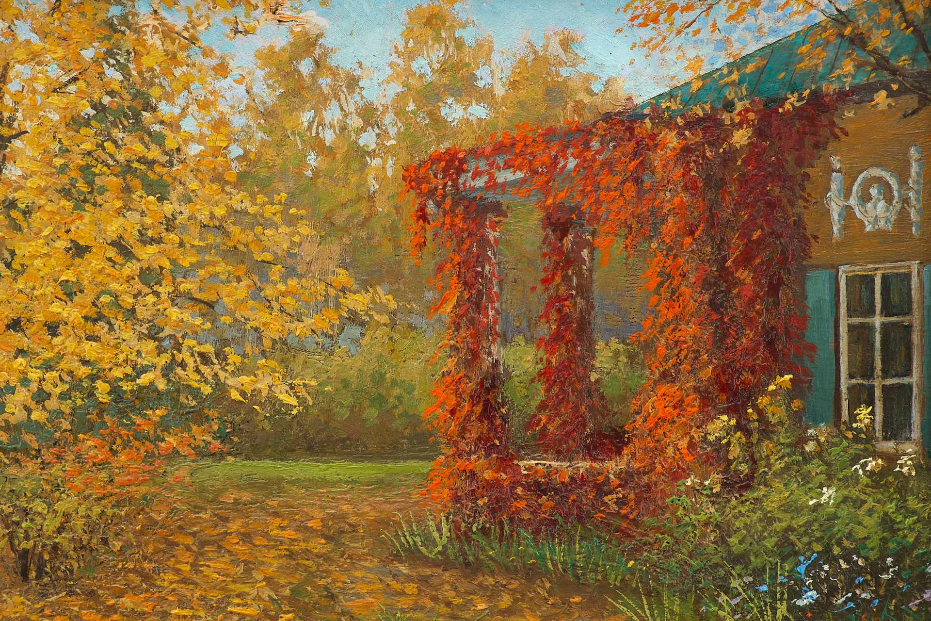 Картина с изображением вида на небольшой осенний дворик и фрагмент усадьбы с верандой. Веранда увита краснеющим от осени плющом. Стилистика и настроение картины соответствуют популярному в этот период времени европейскому стилю - модерн.