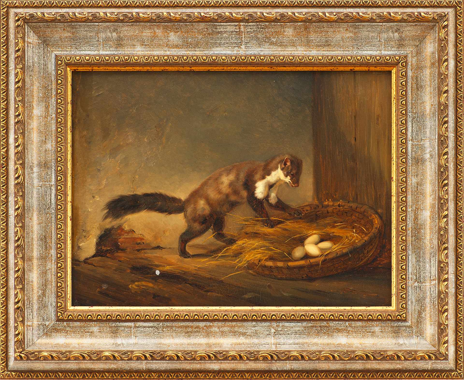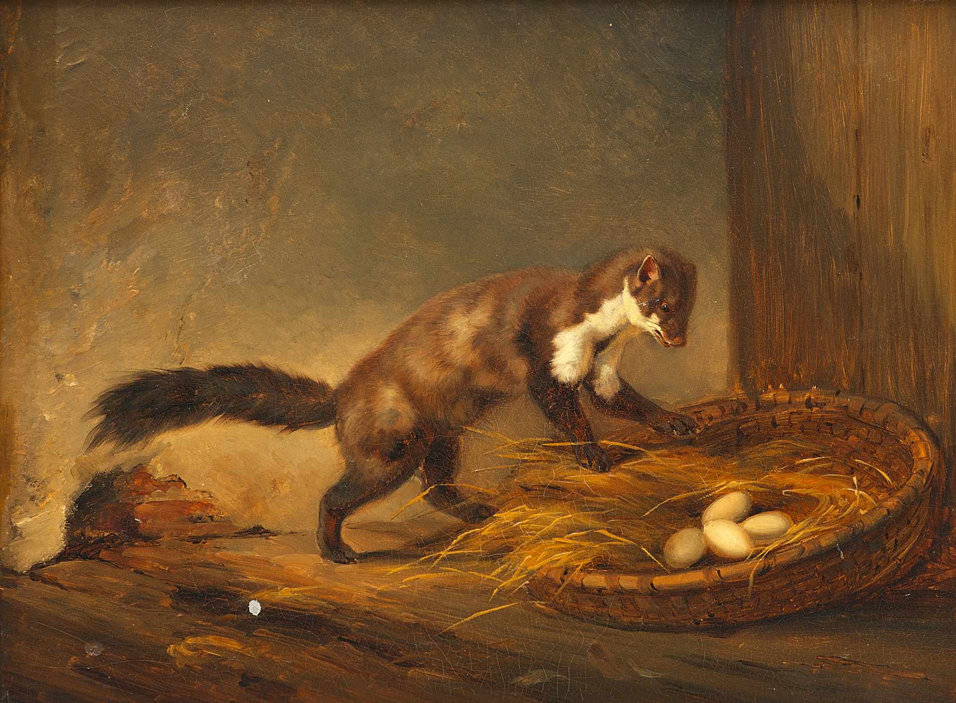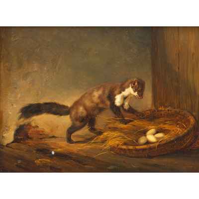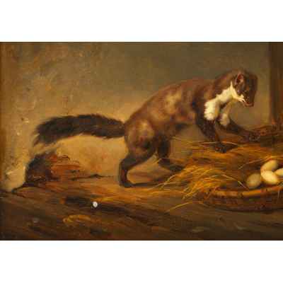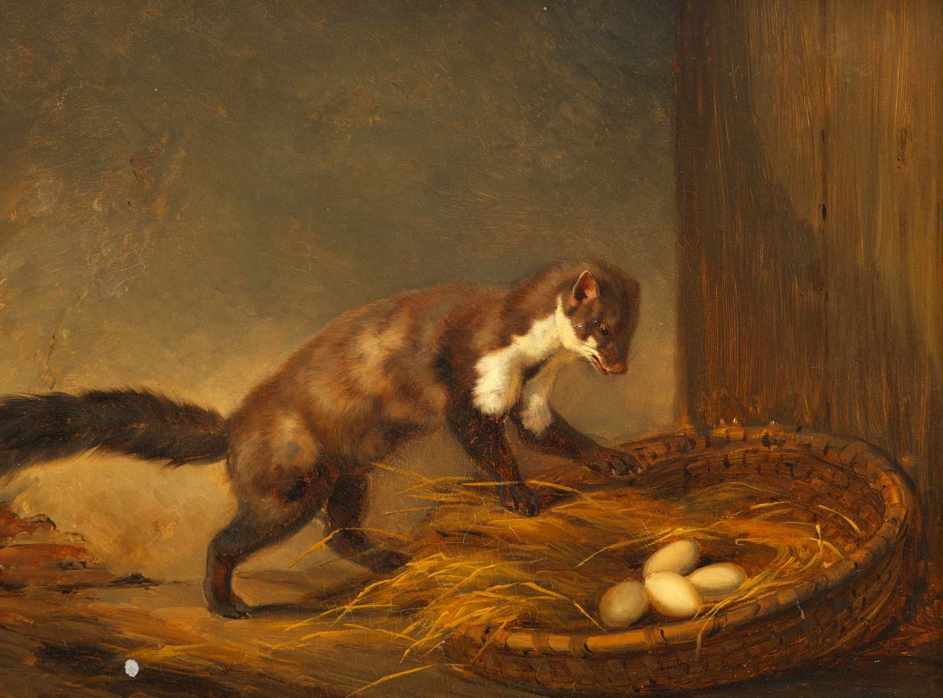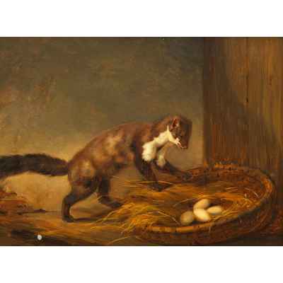 На картине изображена сцена, которую можно классифицировать как жанровая анималистика, где название произведения поясняет смысловой (социальный, бытовой или природный) контекст изображенной сцены - ласка, забравшись в курятник, находит свою добычу.