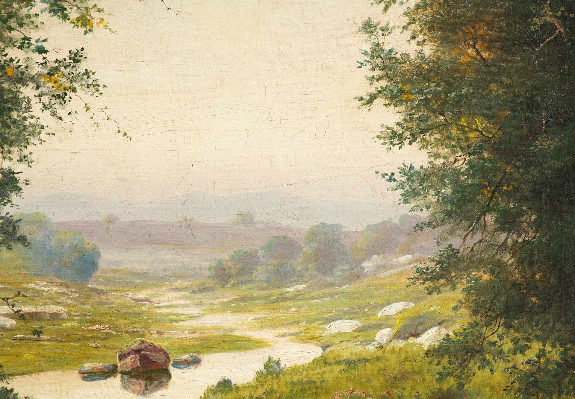 Изображён летний пейзаж. В центре узкая извилистая река, уходящая вдаль. На реке лежат большие камни. Такие же камни видны на правом берегу, поросшем ярко-зеленой травой. На переднем плане, справа и слева, высокие деревья с густой кроной. На горизонте, словно в тумане, видны очертания невысоких гор.