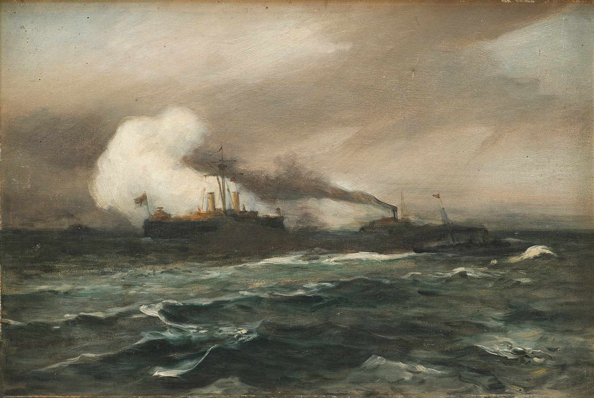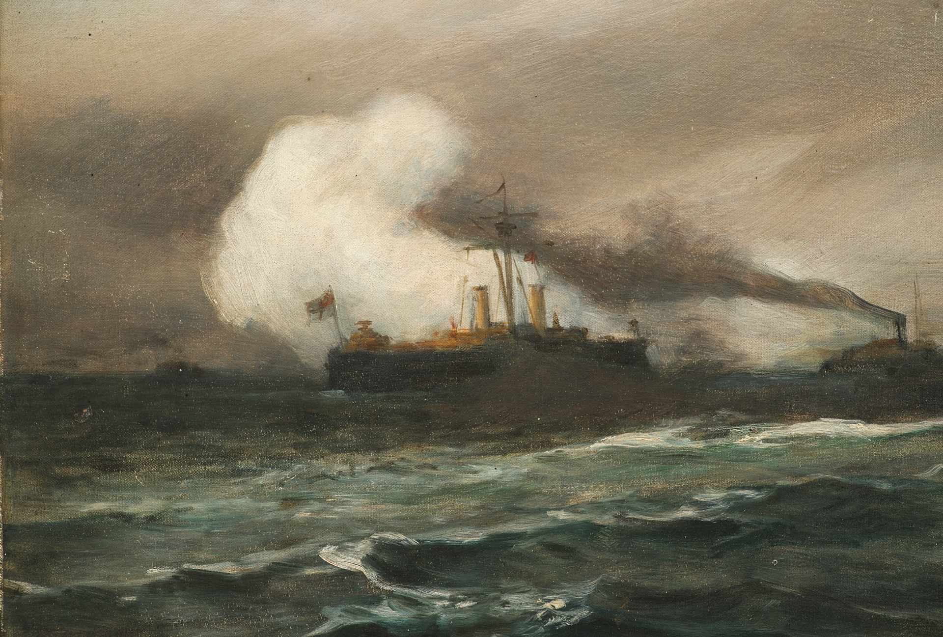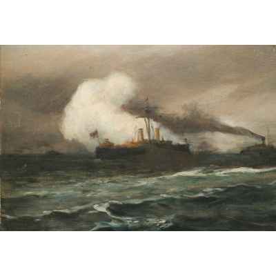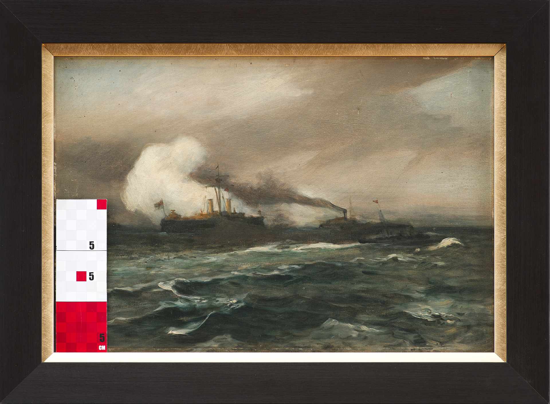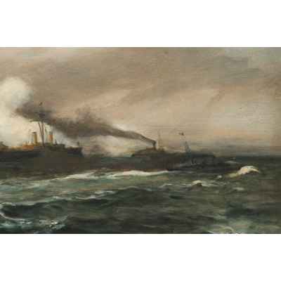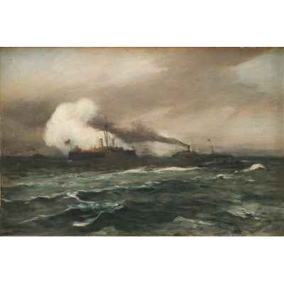 На обратной стороне картины слева внизу подпись: “CH.G”. На картине изображен морской пейзаж с пароходами. Половину полотна занимает море, подернутое мелкими серо-голубыми волнами с белыми гребешками пены. На горизонте изображены пароходы с высокими трубами, из которых клубится густой пар. Небо пасмурное, затянутое пеленой.облаков. Мотив, колорит и приемы изображения соответствуют принципам живописи австрийского художника Кристиана Грипенкерля. Работа выполнена на высоком профессиональном уровне и представляет интерес для частных собрании. Кристиан (Христиан) Грипенкерль (Christian Gripenkerl, 17 марта 1839, Ольденбург22 марта 1912, Вена) — австрийский художник, педагог, профессор венской Академии изобразительных искусств (с 1874 года). С 1855 года учился в частной рисовальной школе Карла Раля. Участвовал в создании живописных фресок для народной лестницы Музея оружия (Военноиетсрическиймузей) Вена, дворца Тодеско, а также венского дворца семейства фонСйна.
