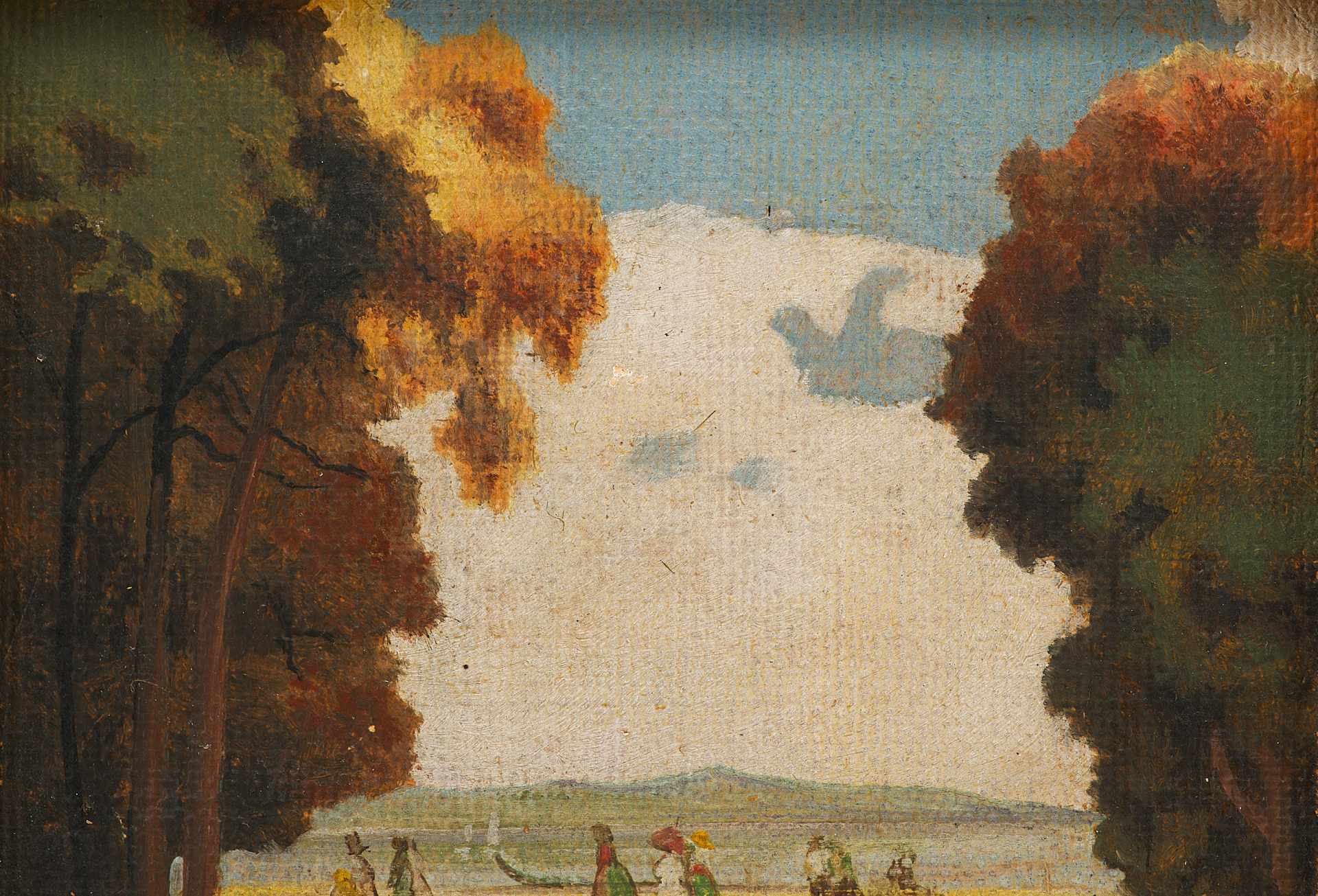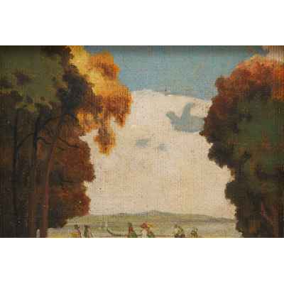 На картине изображен летний пейзаж. На переднем плане ровная зеленая полянка, по обеим сторонам которой возвышаются деревья с густой разросшейся кроной. Между ними светлое небо с пеленой облаков. На полянке около озера гуляют дамы с кавалерами: женщины в пышных платьях с кринолинами, мужчины в шляпах; На озере видна лодка с поднятым носом. Неровная полоска гор тянется на горизонте.