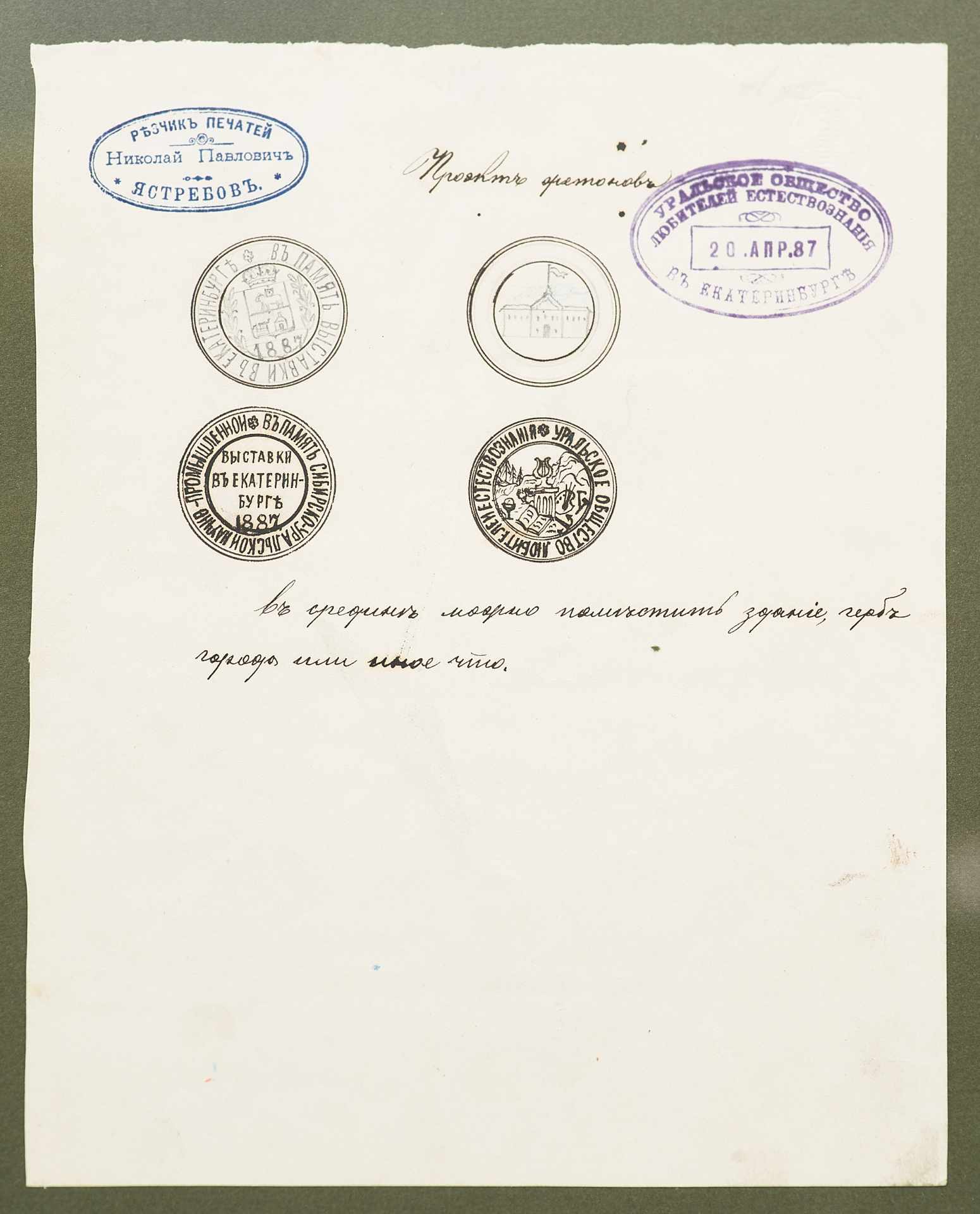 Подготовка к сибирско-уральской научно-промышленной выставке велась три года, устроителями выступило Уральское Общество Любителей Естествознания (одна из крупнейших организаций в Российской империи). Торжественное открытие выставки состоялось 14 июня 1887 года. За три месяца работы выставку посетило 80 тысяч человек, это при том, что в самом Екатеринбурге в то время проживало всего 35 тысяч жителей. Из надписей на печатях видно, что проект жетонов разрабатывал гравер Николай Павлович Ястребов, а утвердило УОЛЕ 20 апреля 1887 года.