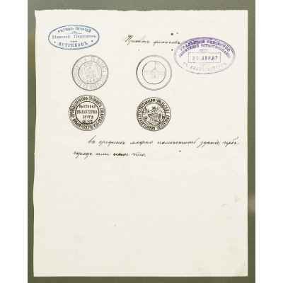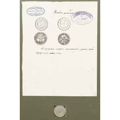 Лист бумаги с нарисованными тушью изображениями четырех круглых жетонов и двух овальных печатей. Вверху