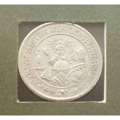 Под проектом жетон Уральского общества любителей естествознания (диаметр 27,9 мм, медно-никелевый сплав). На лицевой стороне в центре изображение лиры, глобуса, палитры, якоря, книги, по окружности “Уральское общество
