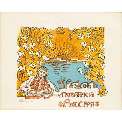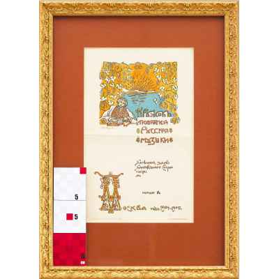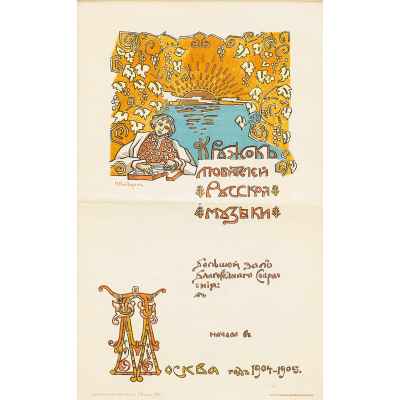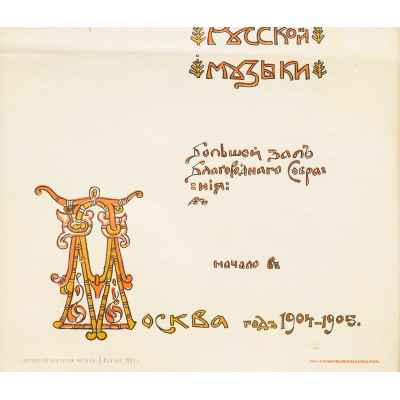 Приглашение Кружка любителей русской музыки: “Большой зал Благородного.Собрания”. Москва год 1904-1905. Вверху рисунок художника И.Бондаренко. Внизу по краю надпись: “Дозволено цензурою Москва 3 ноября, 1904 г. лит. І.И. Пашкова, Москва, Кузнец. Мост.”