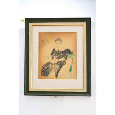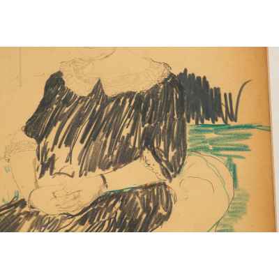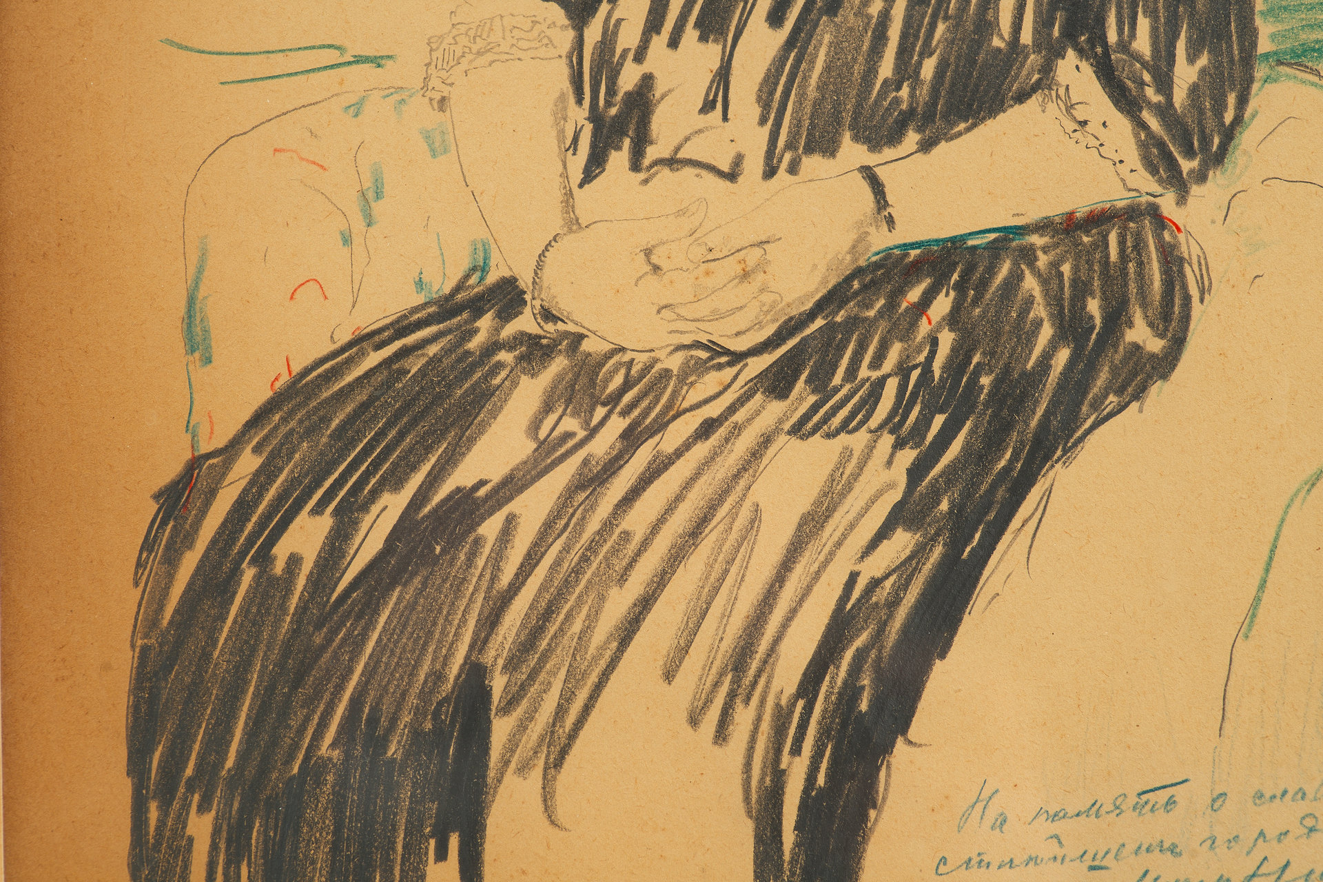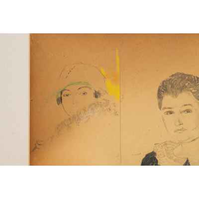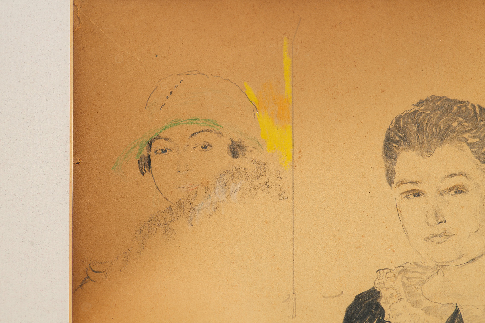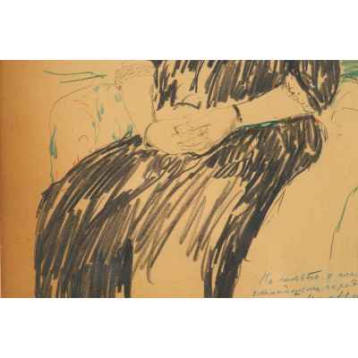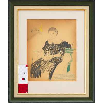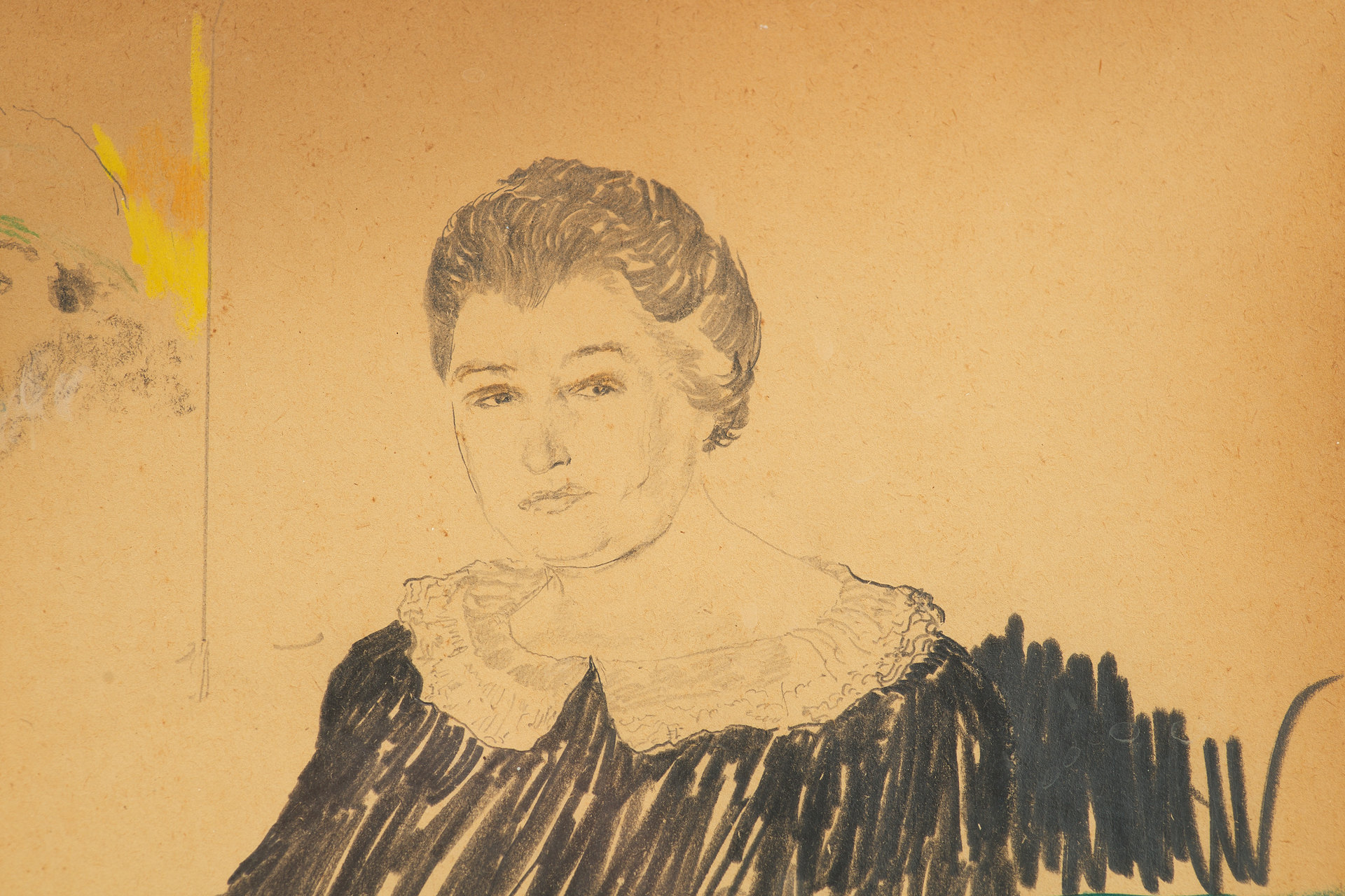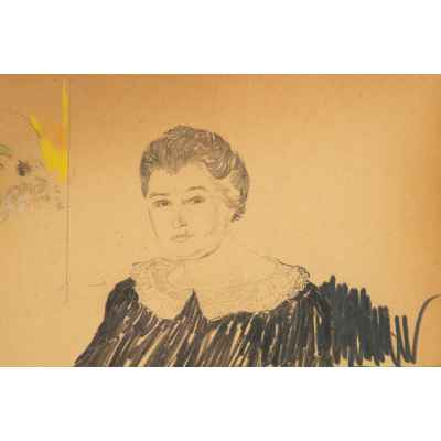 На изображении представлена работа графического характера — портрет женщины, выполненный в смешанной технике на тонированной бумаге. Основная фигура — сидящая женщина в тёмном платье с белым воротником — выполнена с помощью карандаша и туши или цветного фломастера. Особенностью композиции является незавершённость второго плана: за женщиной лишь намечены силуэты двух других фигур, одна из которых — мужской профиль, другая — женский в шляпе, почти исчезающие в фоне. Такая приём придаёт работе эффект наброска и подчёркивает акцент на главной героине.