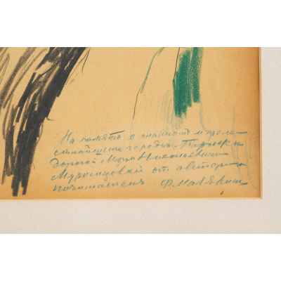 В нижнем правом углу — авторская надпись с подписью: "На память о весёлом утре...". Эта дарственная надпись указывает на личный характер рисунка и, возможно, связывает его с частной историей — дружеским кругом или культурной средой.