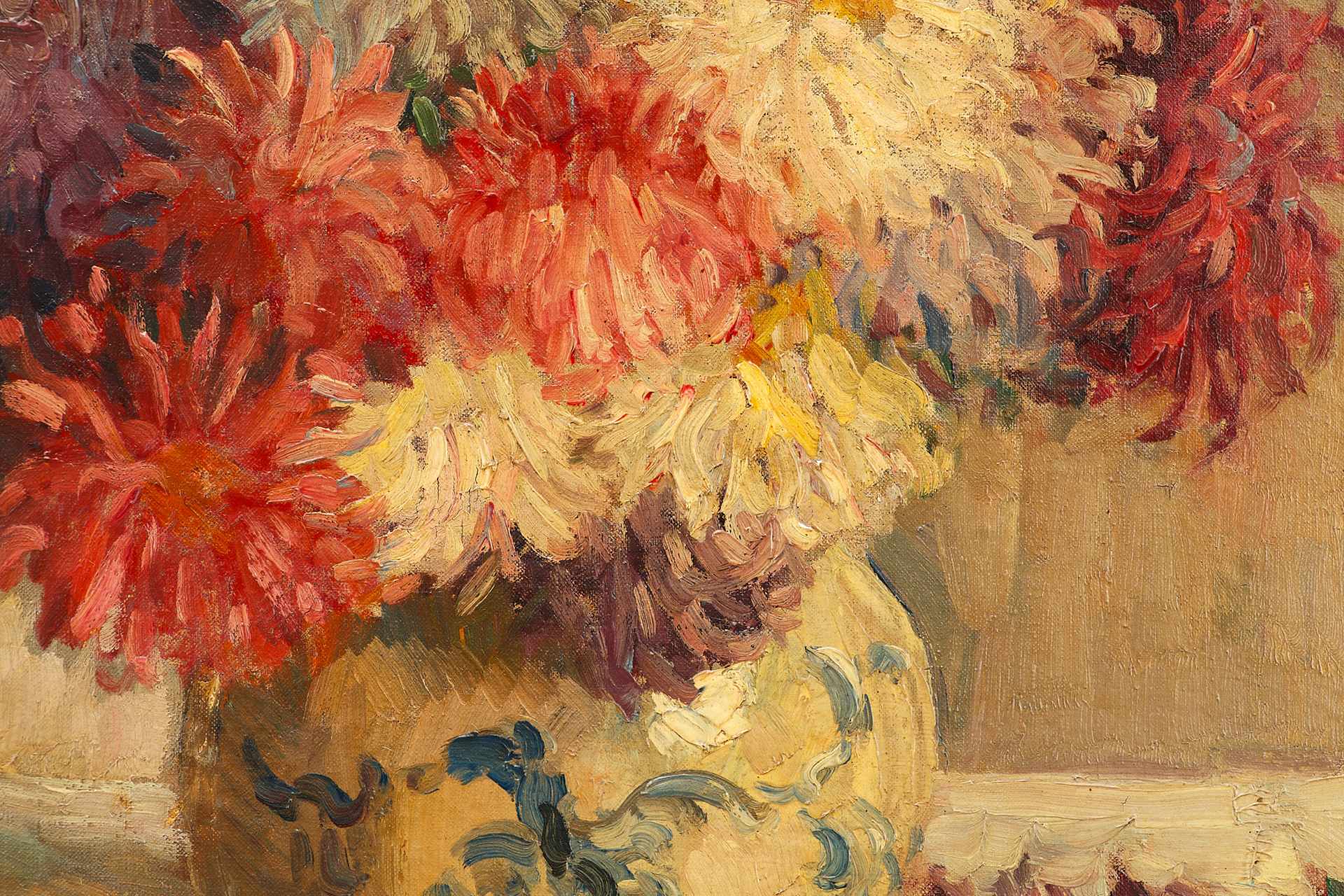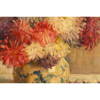 Произведение с изображением цветов написано в характерной для этого периода времени манере, широким мазком в русле импрессионистической живописи.