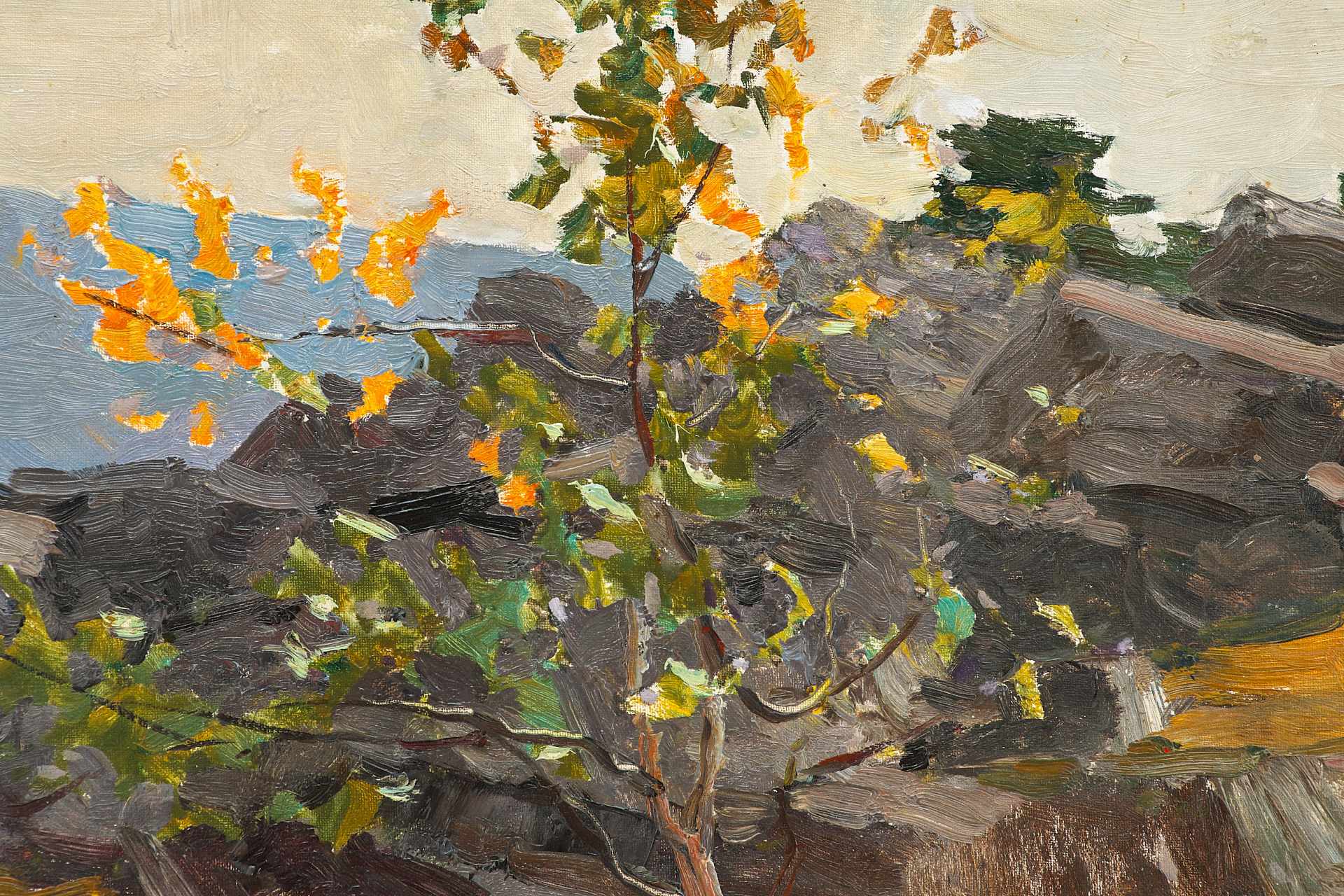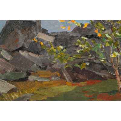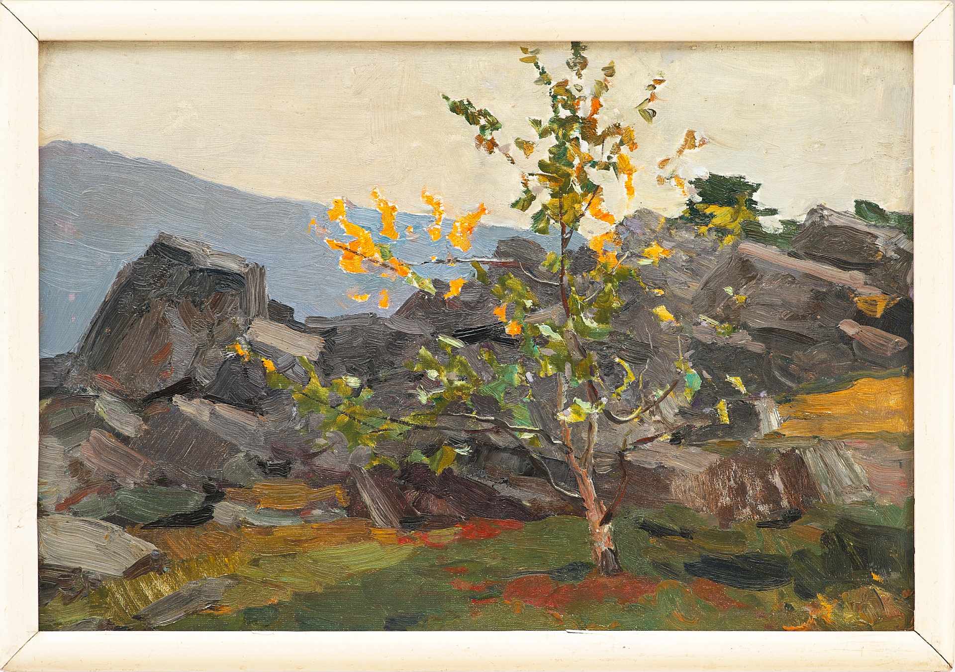 На переднем плане изображена каменистая вершина горы. Среди огромных серых камней, на скудной почве растет невысокая березка с искривленными стволом и ветвями. Несмотря на это, её веточки с редкими листьями, наполовину желтыми, тянутся к светлому небу.