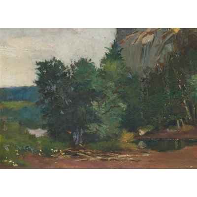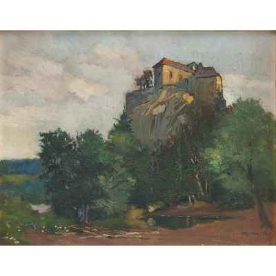 В центре пейзажа высокая скала с ровной площадкой, на которой стоит замок. У подножия скалы деревья с густой зеленой кроной и заводь.