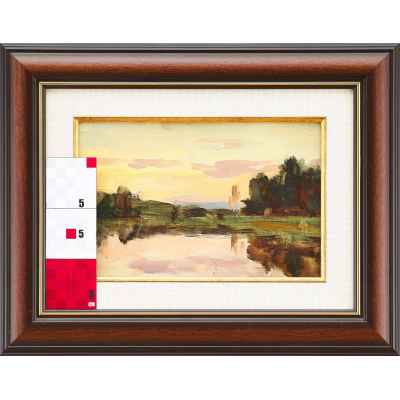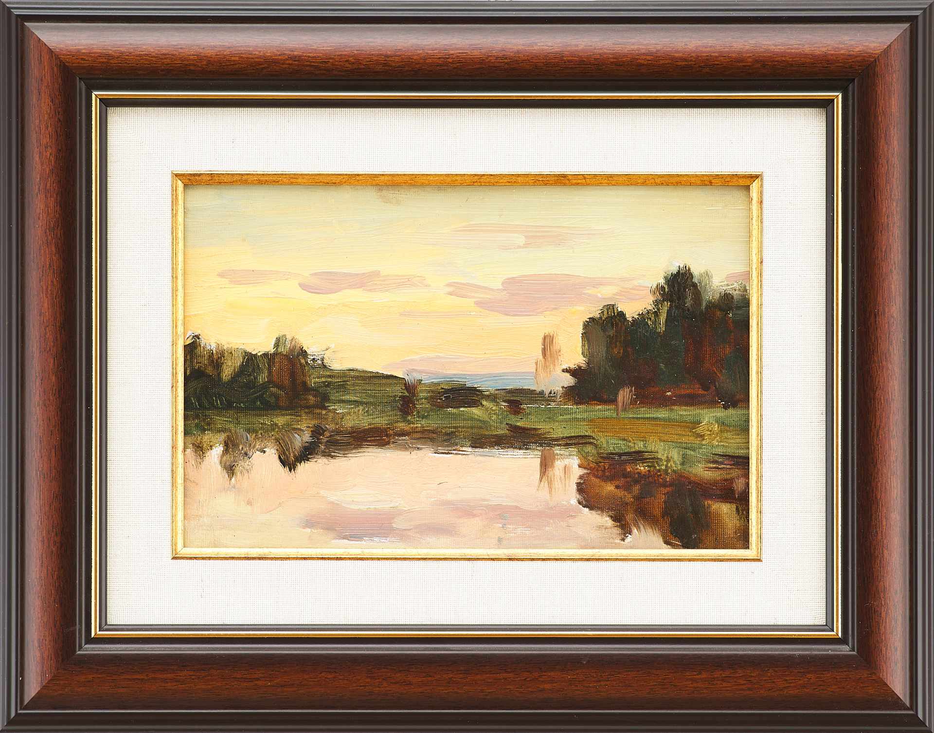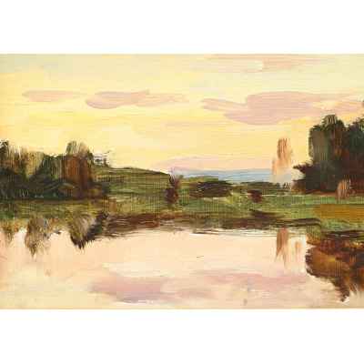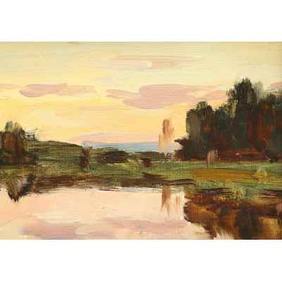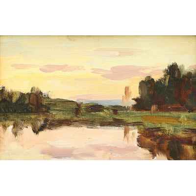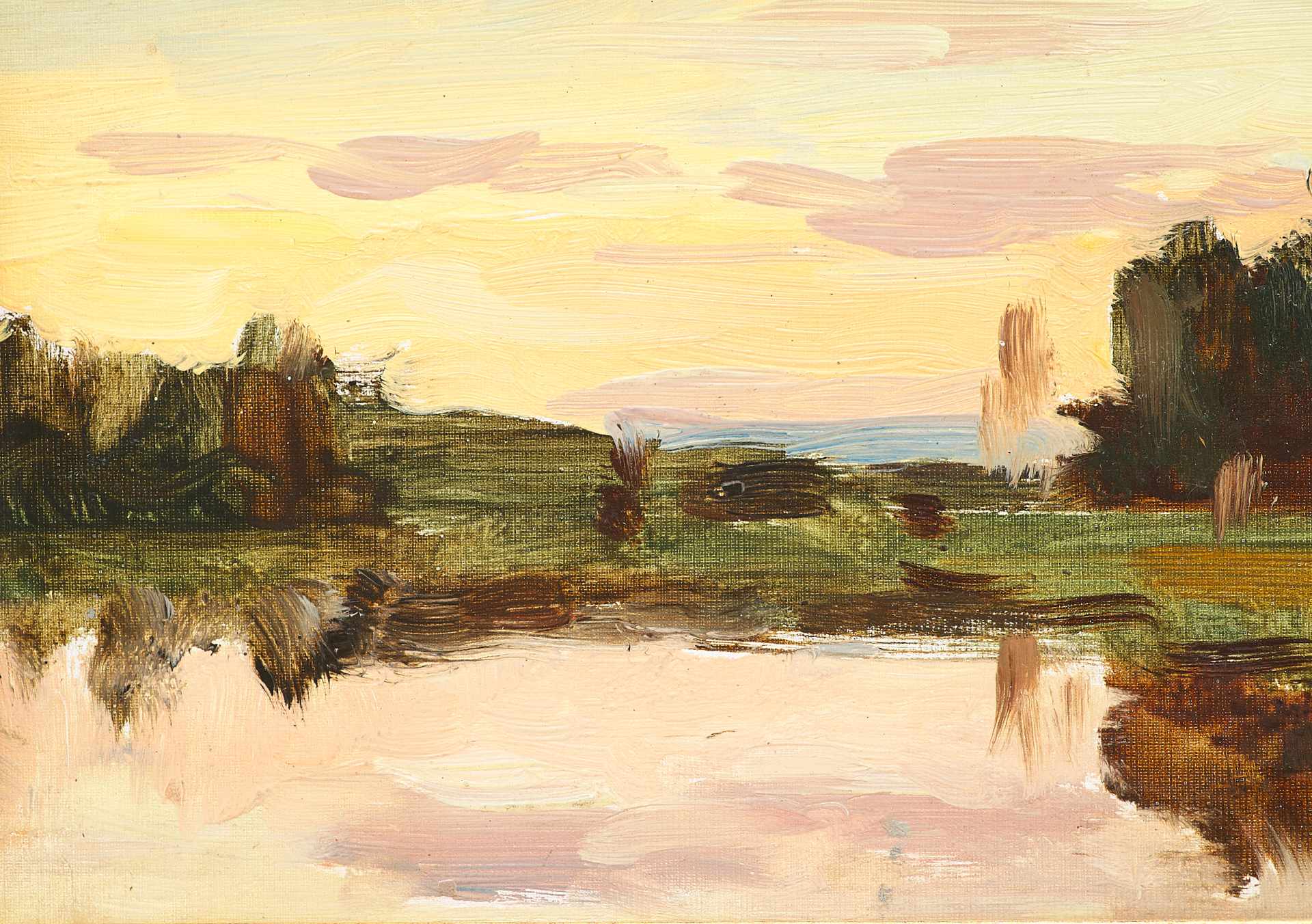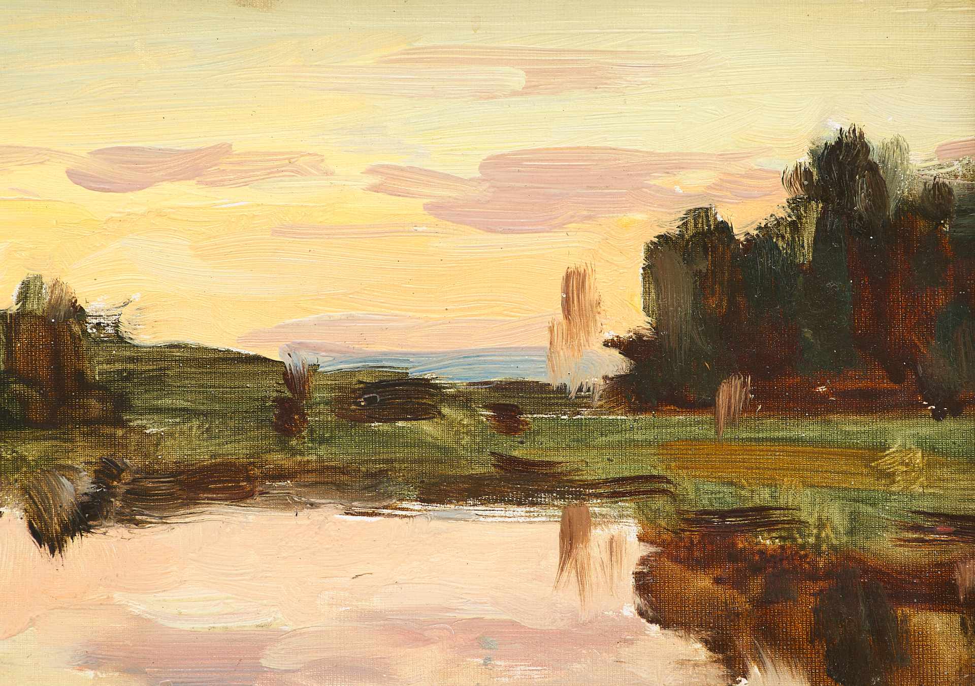 Летний этюд, написанный в технике «алла прима» (за один сеанс). Приемы изображения, палитра, композиция работы, авторская манера письма характерны для особенностей живописи О.Э. Бернгарда и имеют аналогии в других его этюдах. На обороте картона имеется подпись и датировка: «О.Б. 1954 г.». Подпись соответствует почерковой манере автора и соотносится с его автографами на других работах.