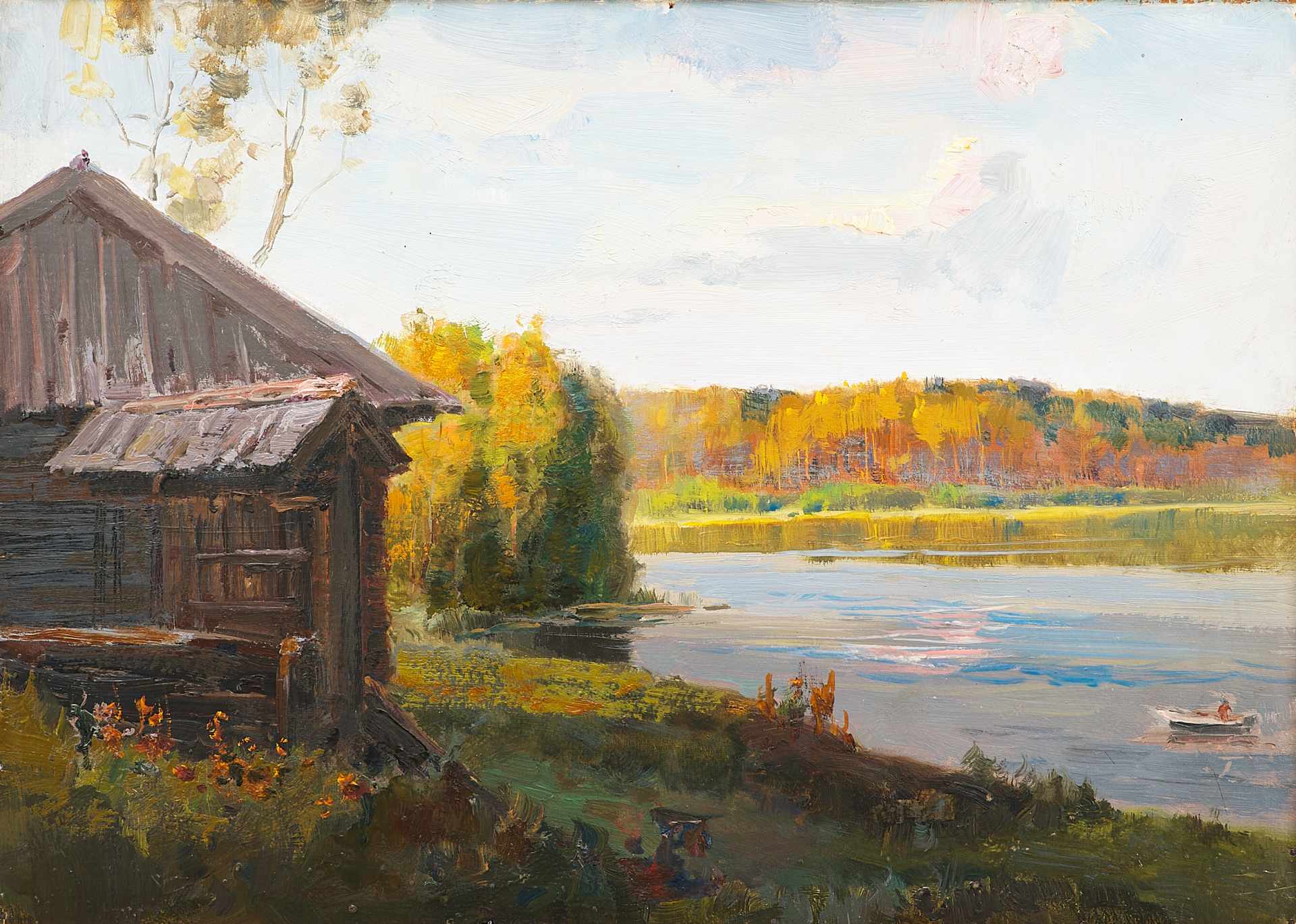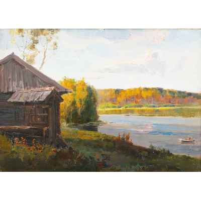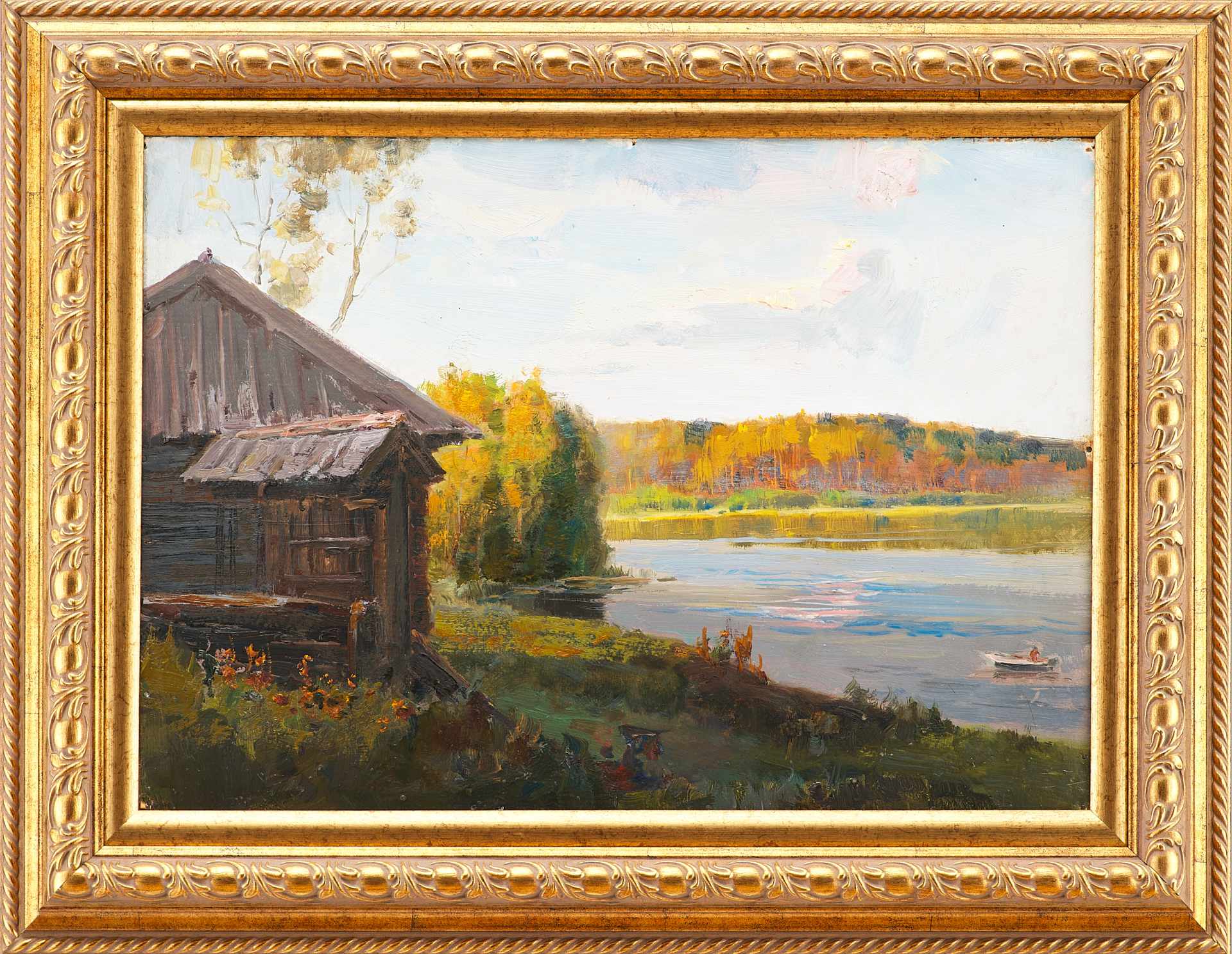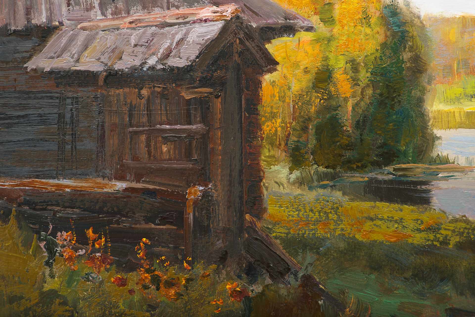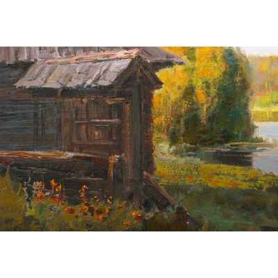 Изображен пейзаж с видом на озеро. На переднем плане изображен фрагмент старой избы с воротами. В правом нижнем углу композиции, на озере покачивается лодка.