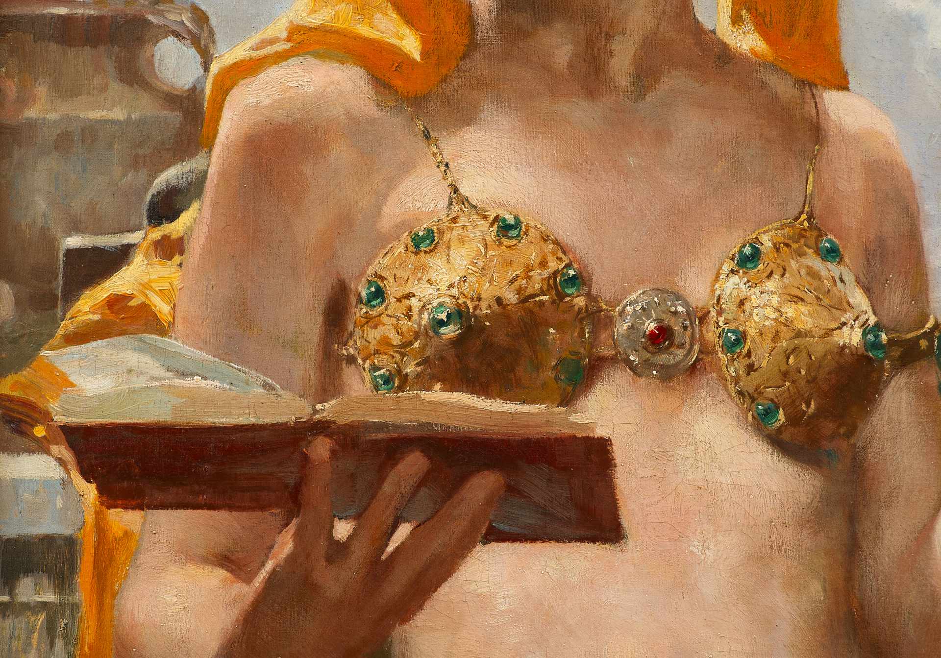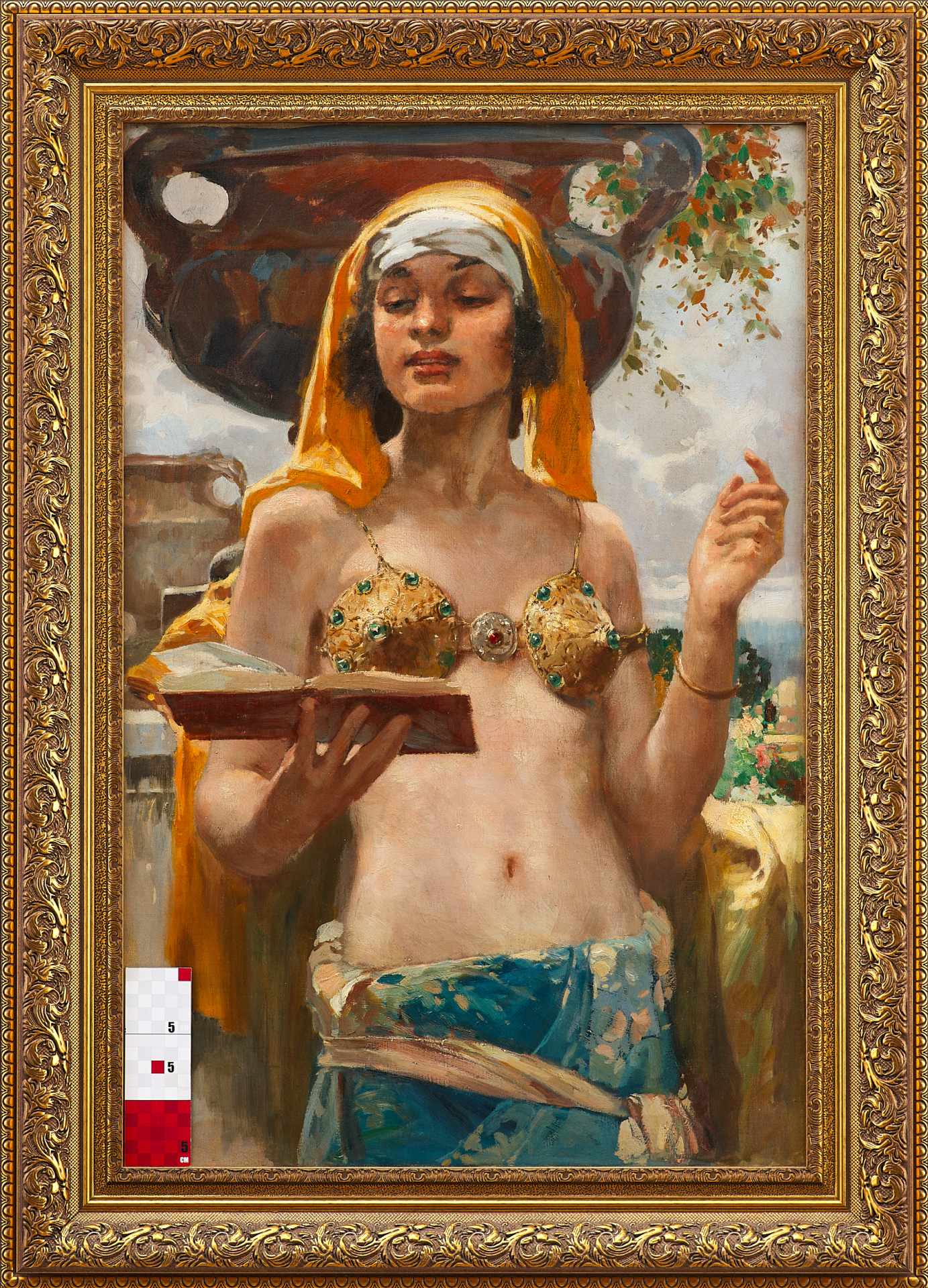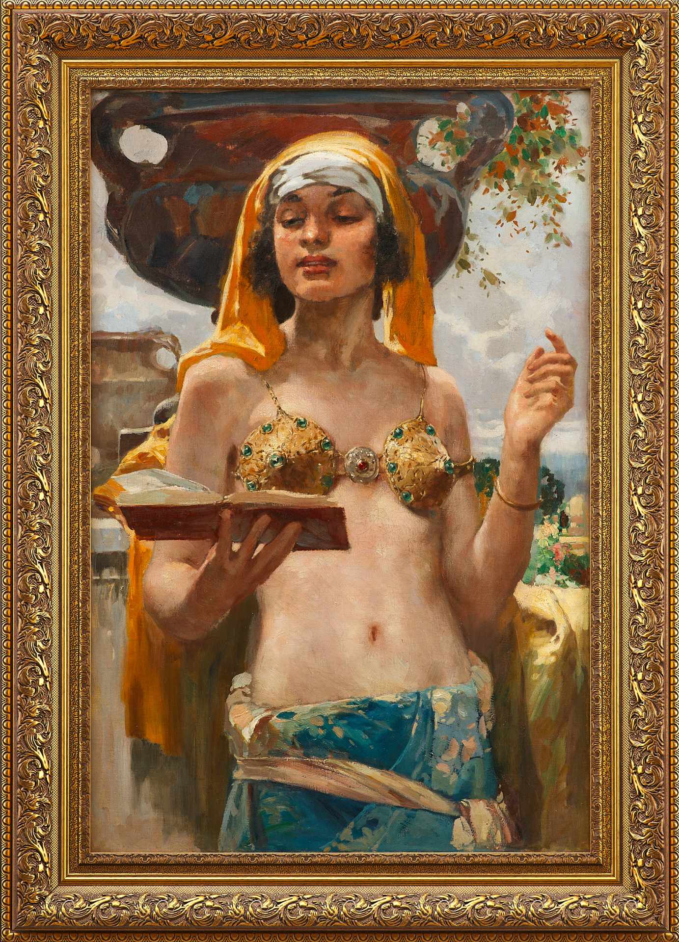 Изображена восточная красавица, полуобнаженная, в золотом лифе, украшенном драгоценными камнями и в набедренной повязке, облегающей её стройную фигуру. На голове платок, подвязанный по-восточному и прикрывающий лоб. Из-под неё видны черные кудрявые волосы. Женщина манерно держит книгу стихов перед собою. Она изображена на