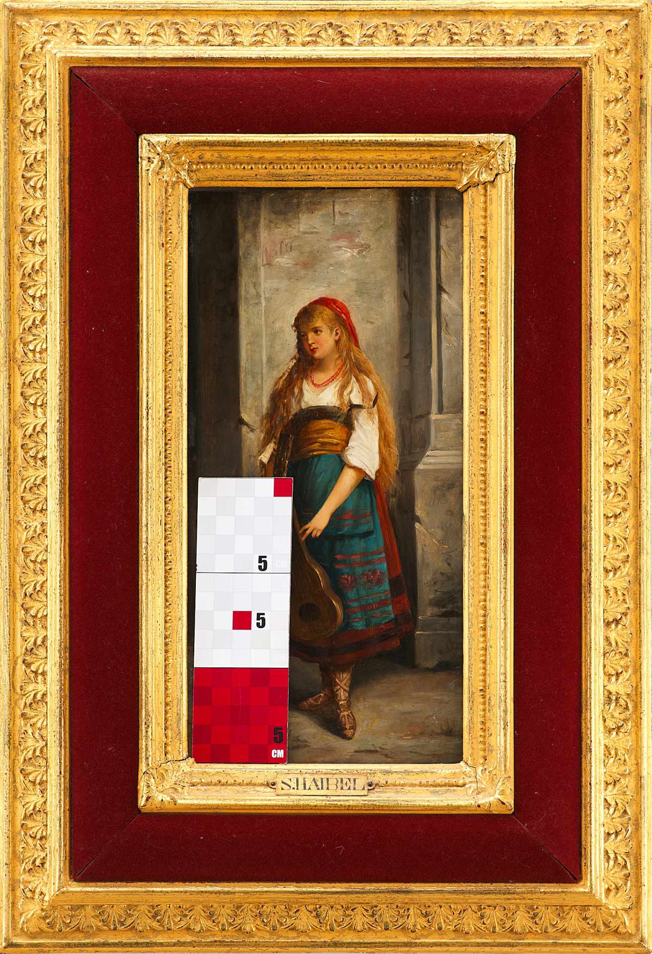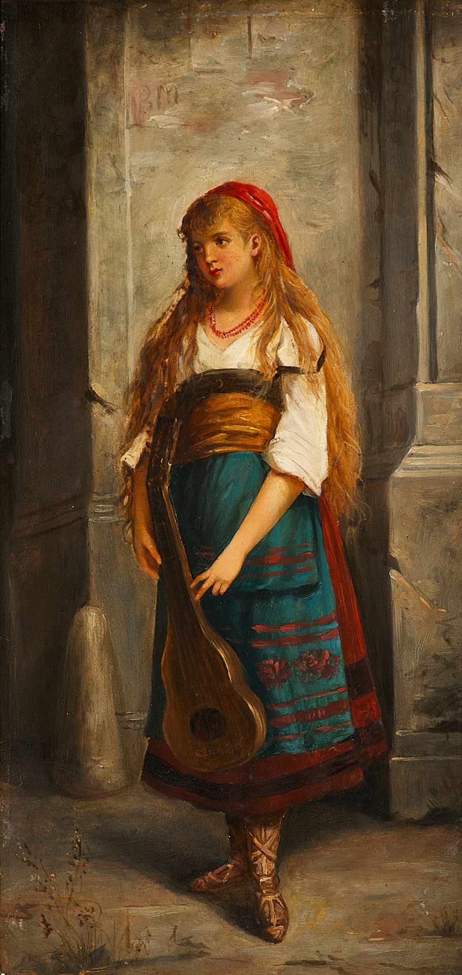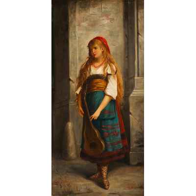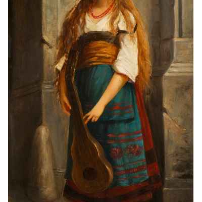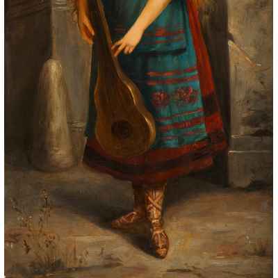 Изображена, стоящая на фоне городской стены, девочка с мандолиной в руках, одетая в нарядный цыганский костюм.