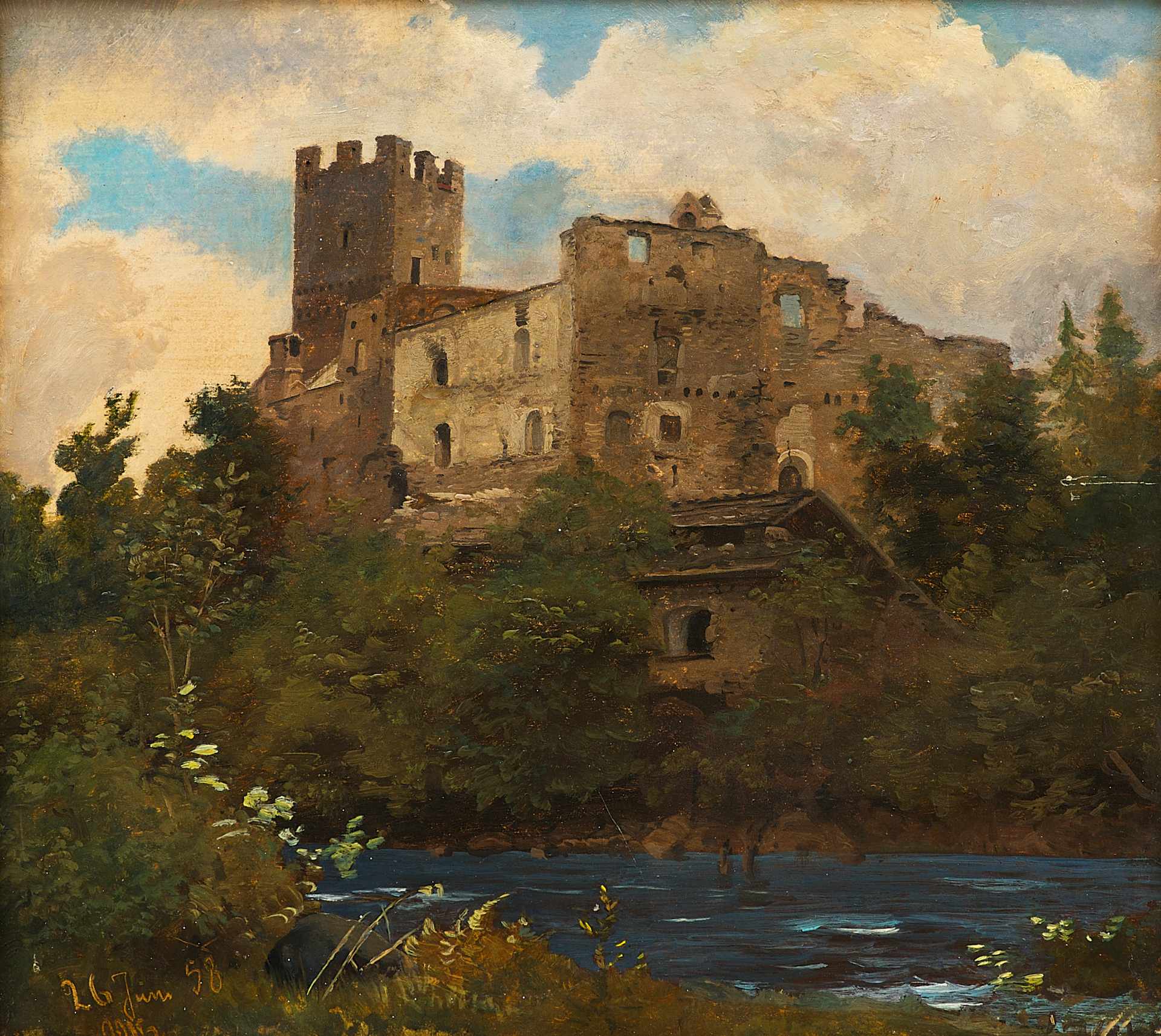 Старинный замок на высоком берегу небольшой реки, своды замка устремлены к светлому небу, затянутому легкими облаками. Небо видно сквозь зияющие отверстия окон замка.