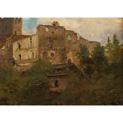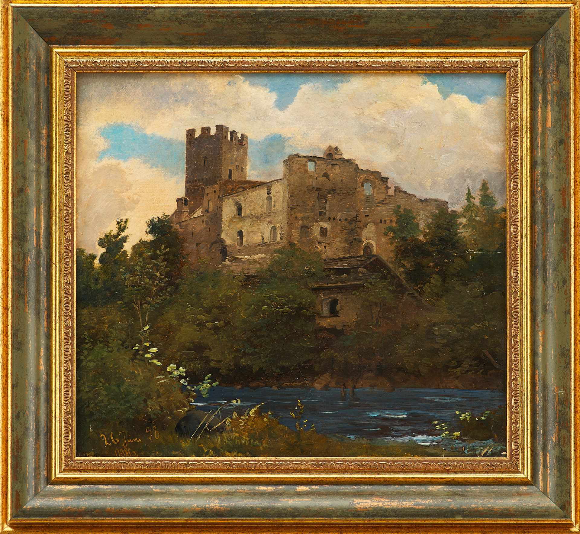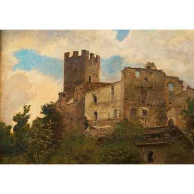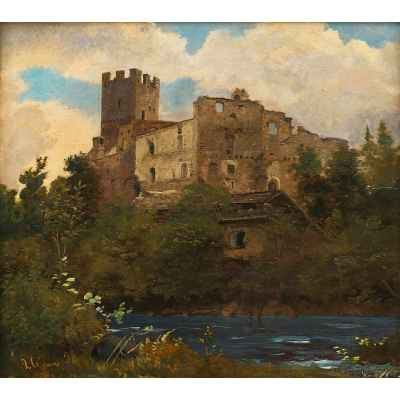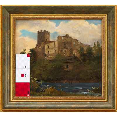 “ Пейзаж с замком”“ оригинальное произведение художника Joli, профессионала. Время создания картины “ 1958 год. Совокупность идентифицированных материалов, использованных в работе, характерны для живописи: 50-х годов XX века, что не противоречит предполагаемой дате.