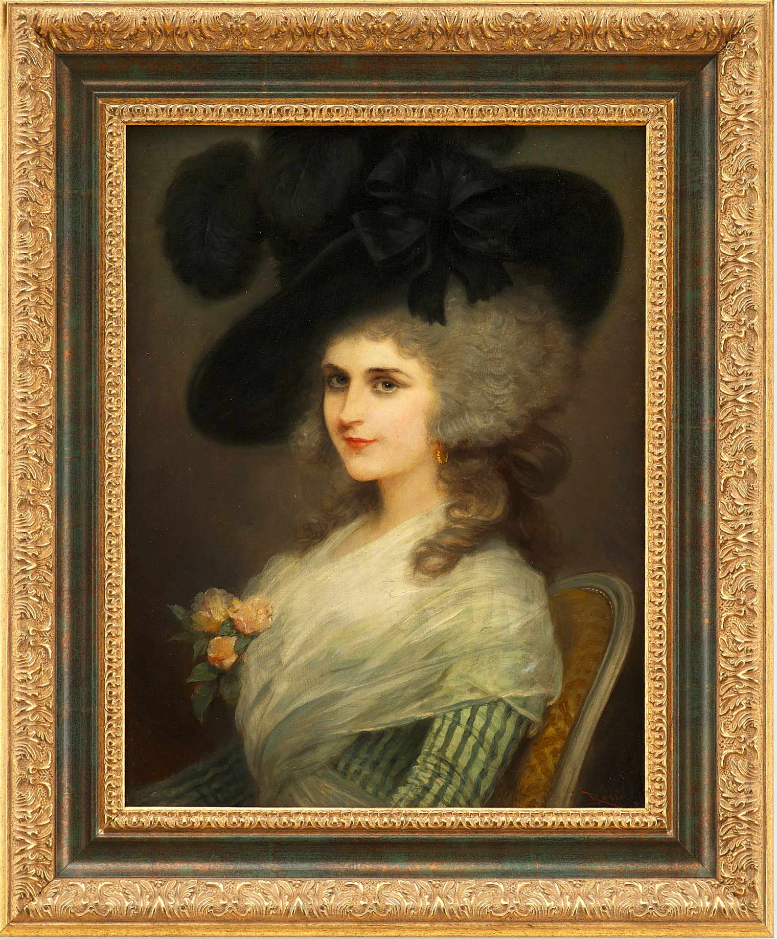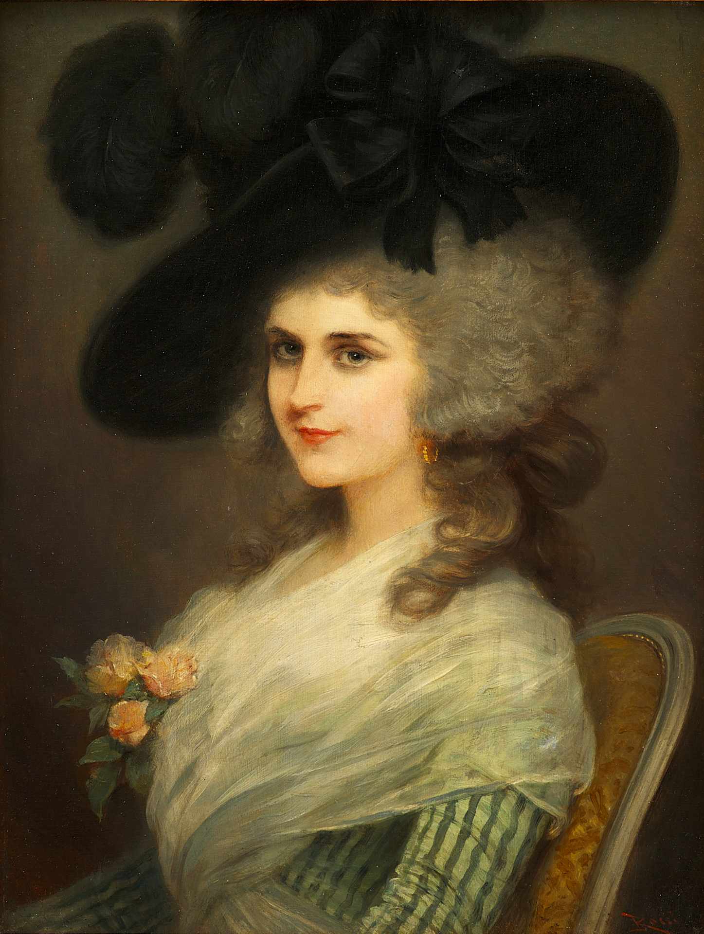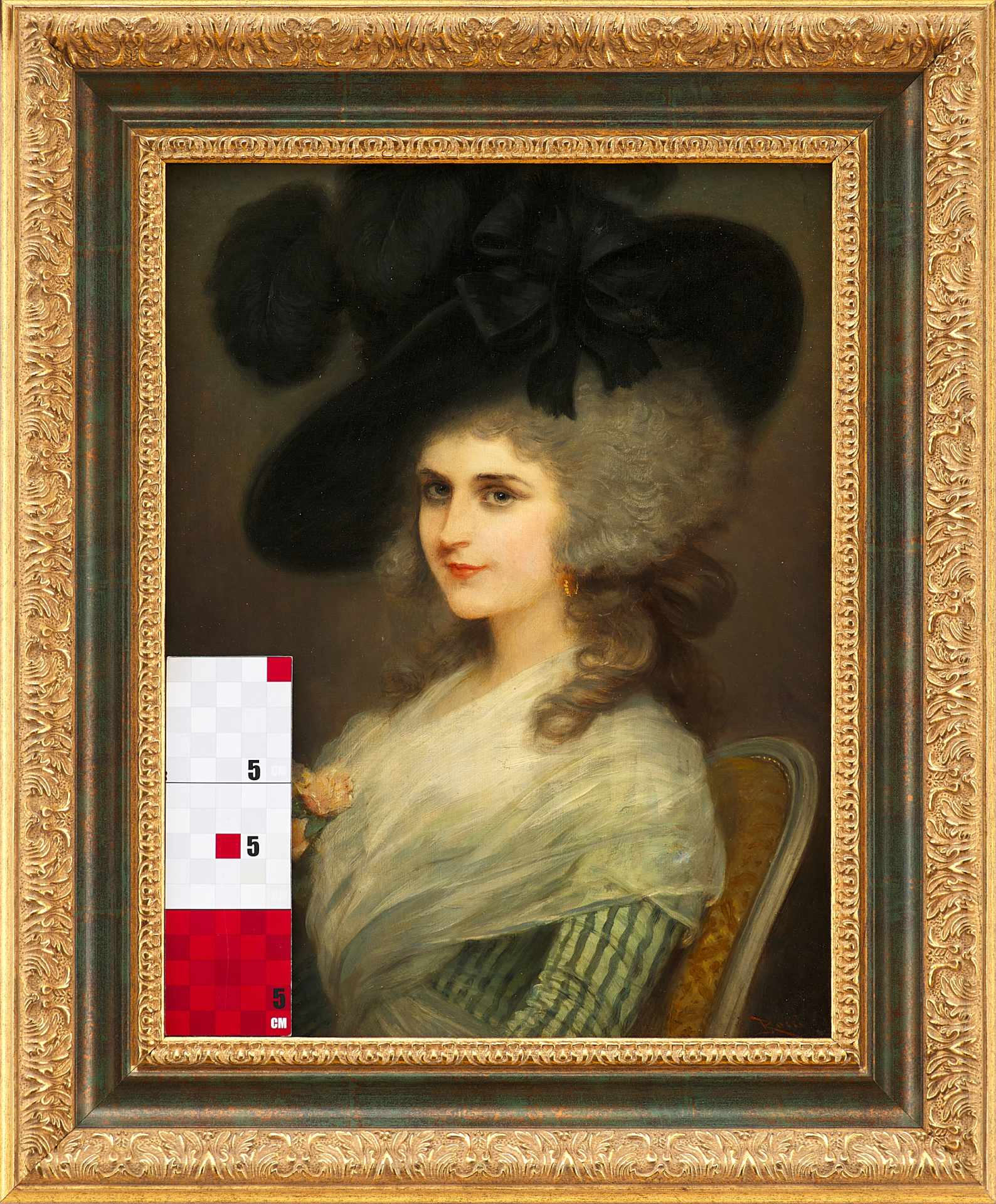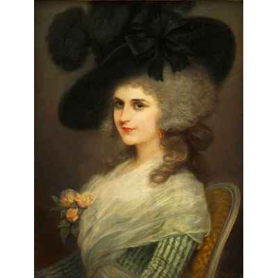 Поясной портрет молодой женщины-аристократки. Дама сидит на стуле, слегка повернув голову к зрителю. Её украшает большая черная шляпа с высокой тульей и широкими полями. На шляпе перья и черный атласный бант. Из-под шляпы виден пышный седой парик с локонами, падающими на плечи У дамы очень тонкая светлая кожа. Женщина слегка улыбается, её темные глаза смотрят прямо на зрителя. На даме полосчатое платье, плечи покрыты прозрачным белым шарфом, перетягивающим её талию. Справа на груди приколоты розы.