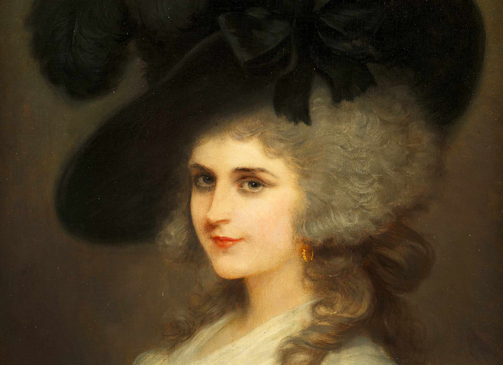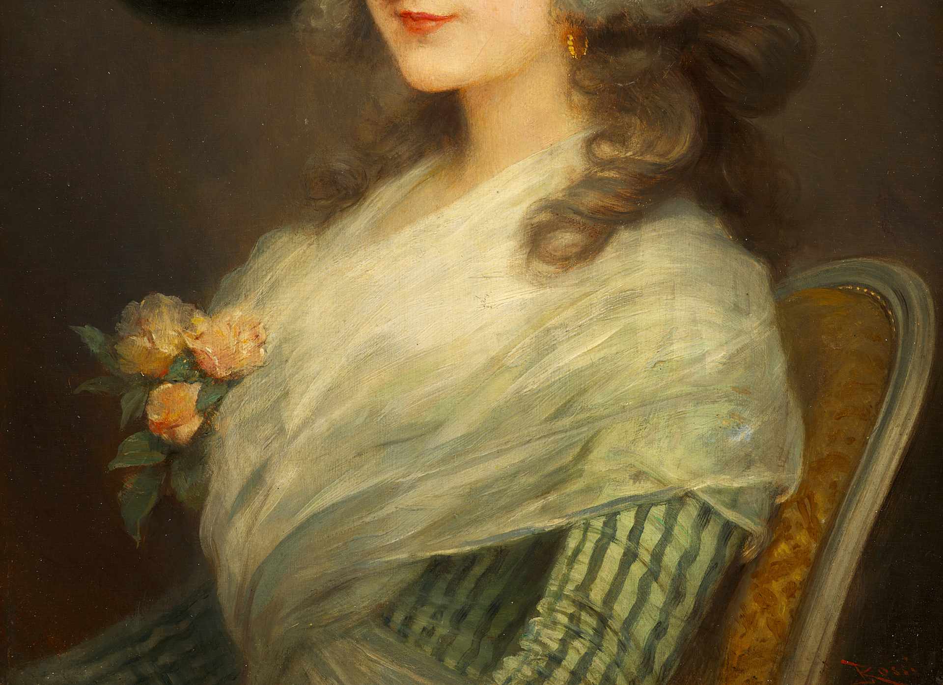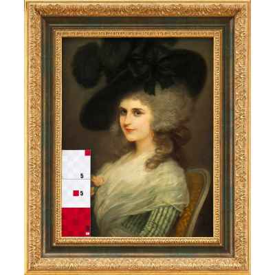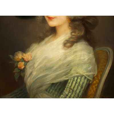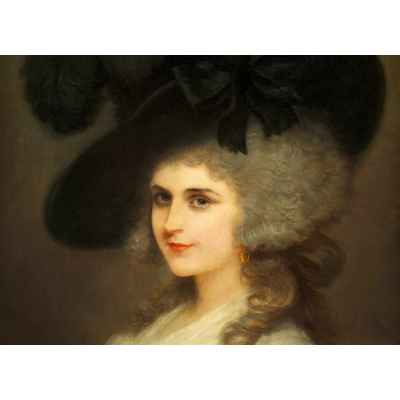 Поясной портрет молодой женщины-аристократки. Дама сидит на стуле, слегка повернув голову к зрителю. Её украшает большая черная шляпа с высокой тульей и широкими полями. На шляпе перья и черный атласный бант. Из-под шляпы виден пышный седой парик с локонами, падающими на плечи У дамы очень тонкая светлая кожа. Женщина слегка улыбается, её темные глаза смотрят прямо на зрителя. На даме полосчатое платье, плечи покрыты прозрачным белым шарфом, перетягивающим её талию. Справа на груди приколоты розы.
