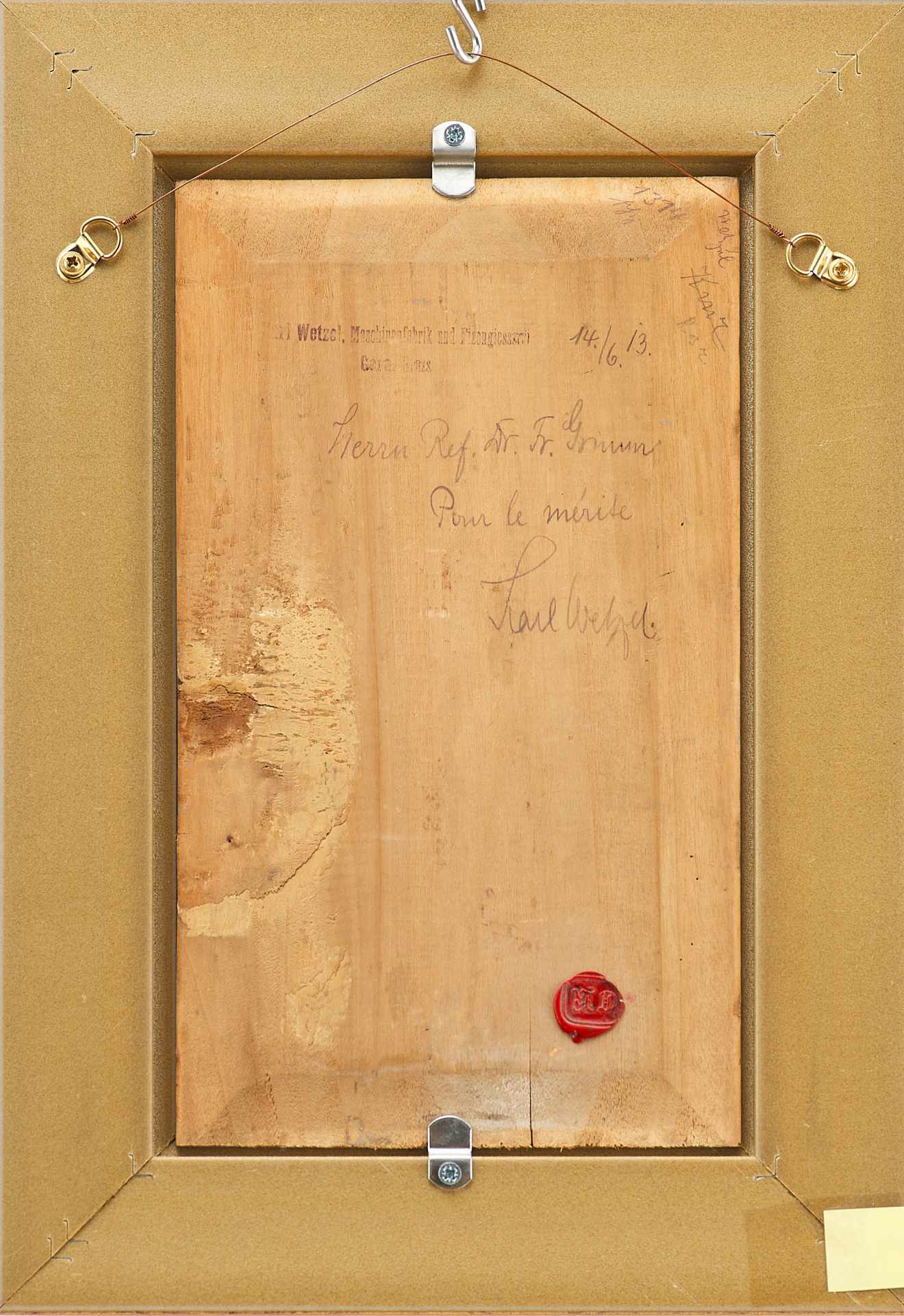 На обратной стороне основы штамп фабрики Карла Ветцела (Karl Wetzel) и владельческая овальная сургучная печать.