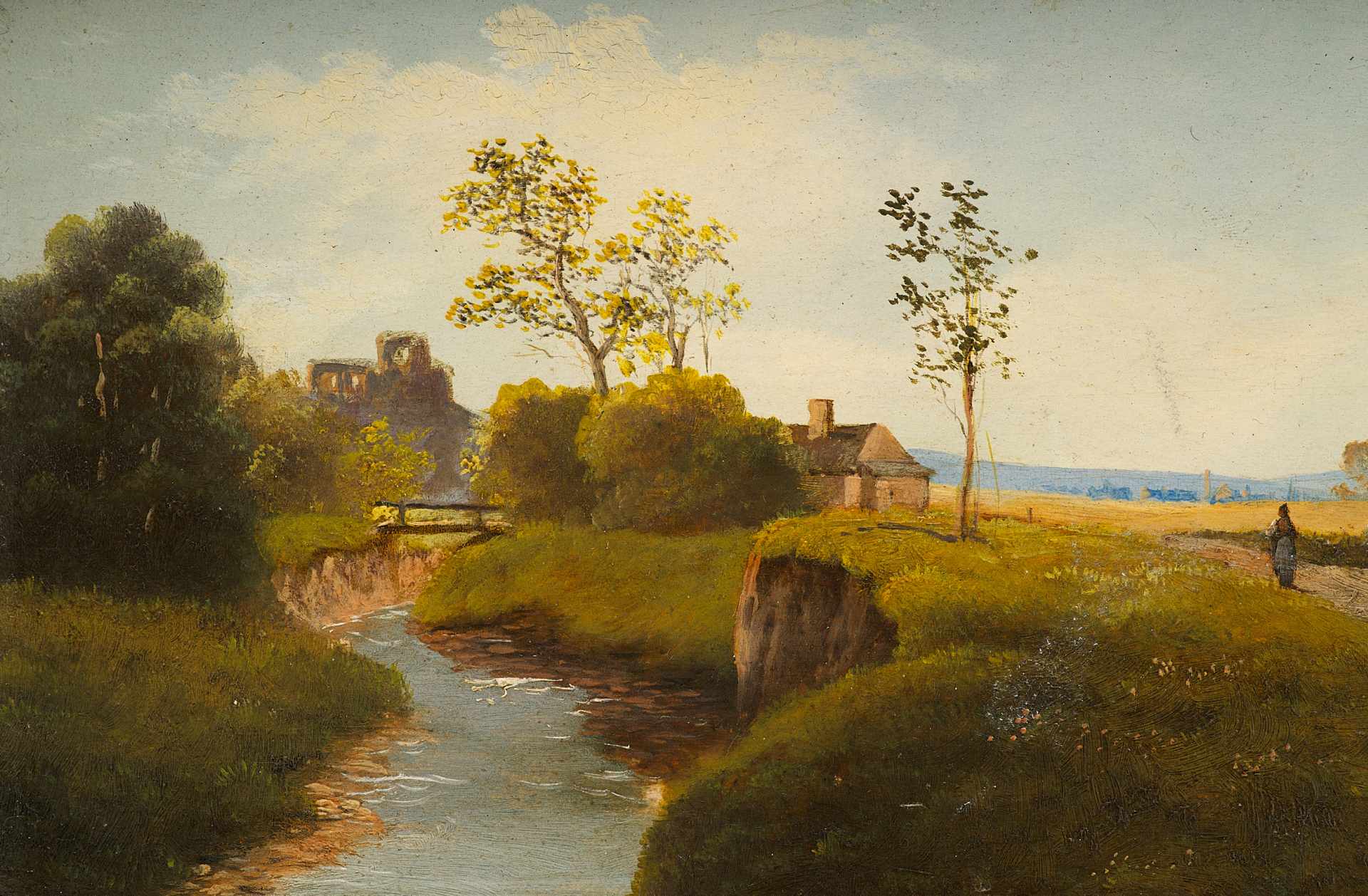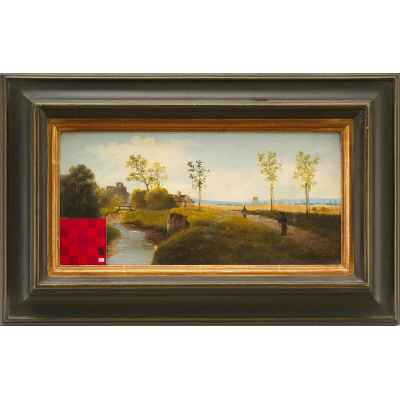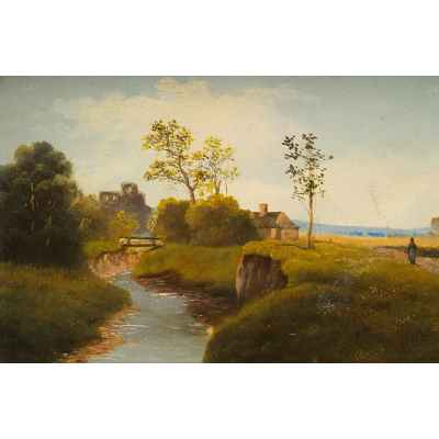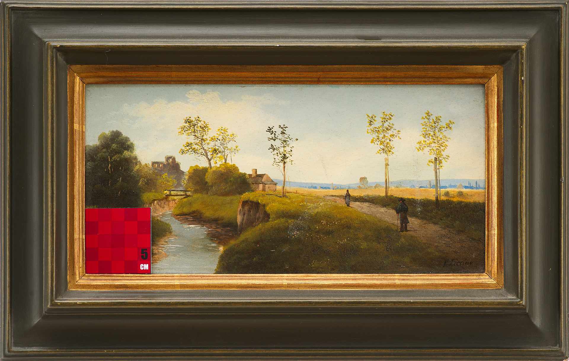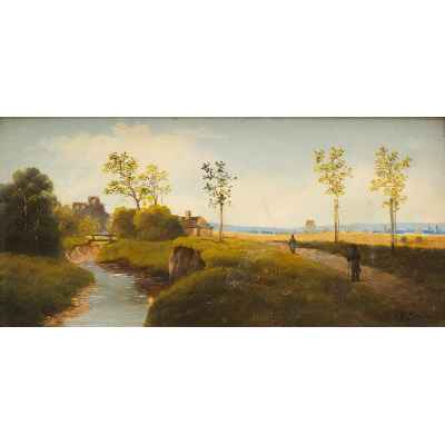 Летний европейский пейзаж, средней климатической полосы. Представлена вытянутая по горизонтали небольшая панорама проселочной дороги с путниками. По краям посаженные деревья, о чем свидетельствую опорные колышки, к которым они подвязаны. Дорога уходит к деревенскому домику у моста, через речку в овраге. Далее — руины замка.