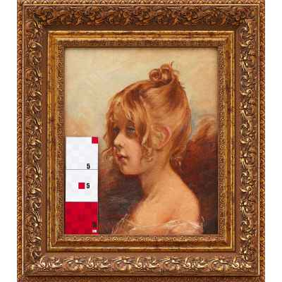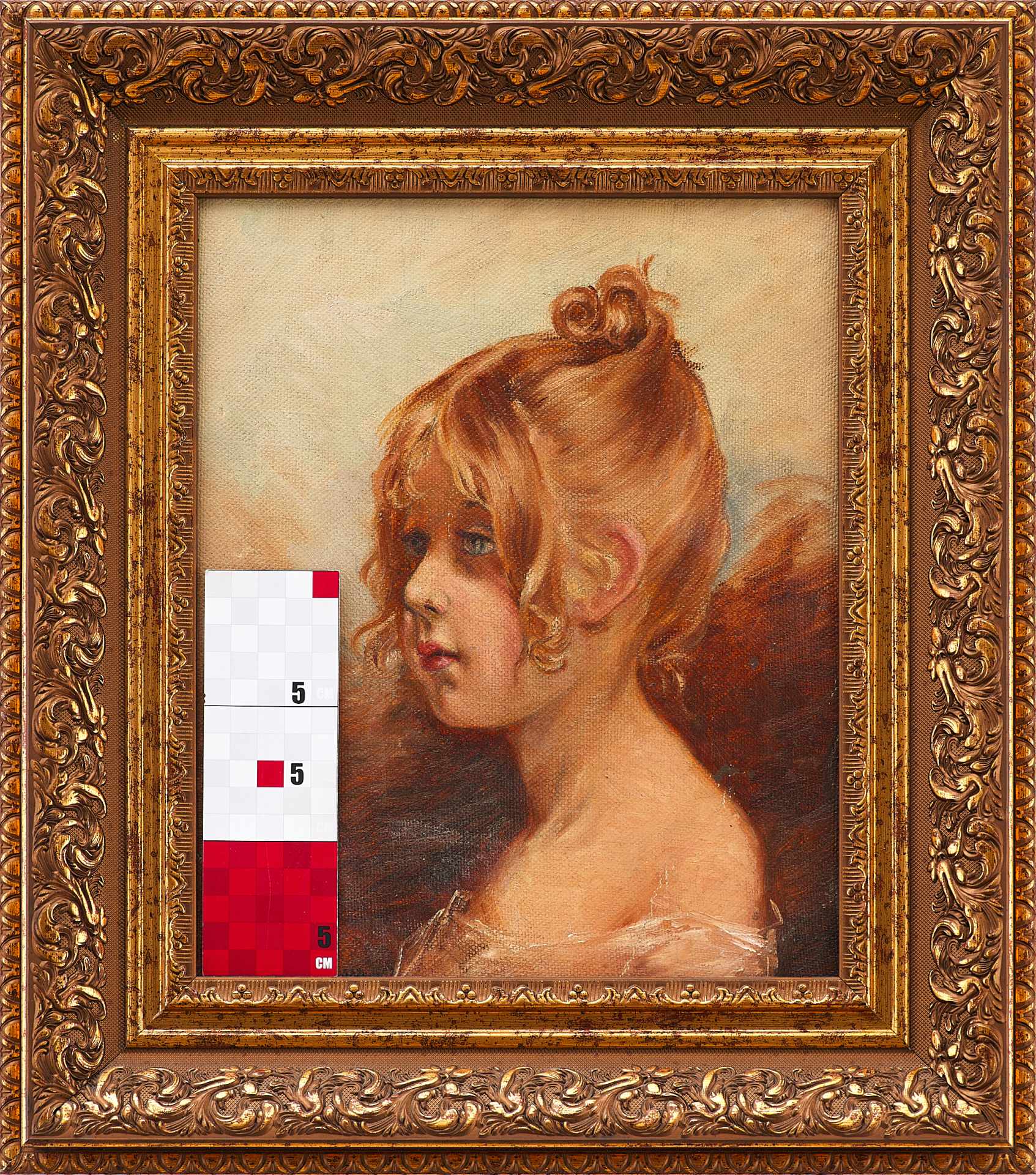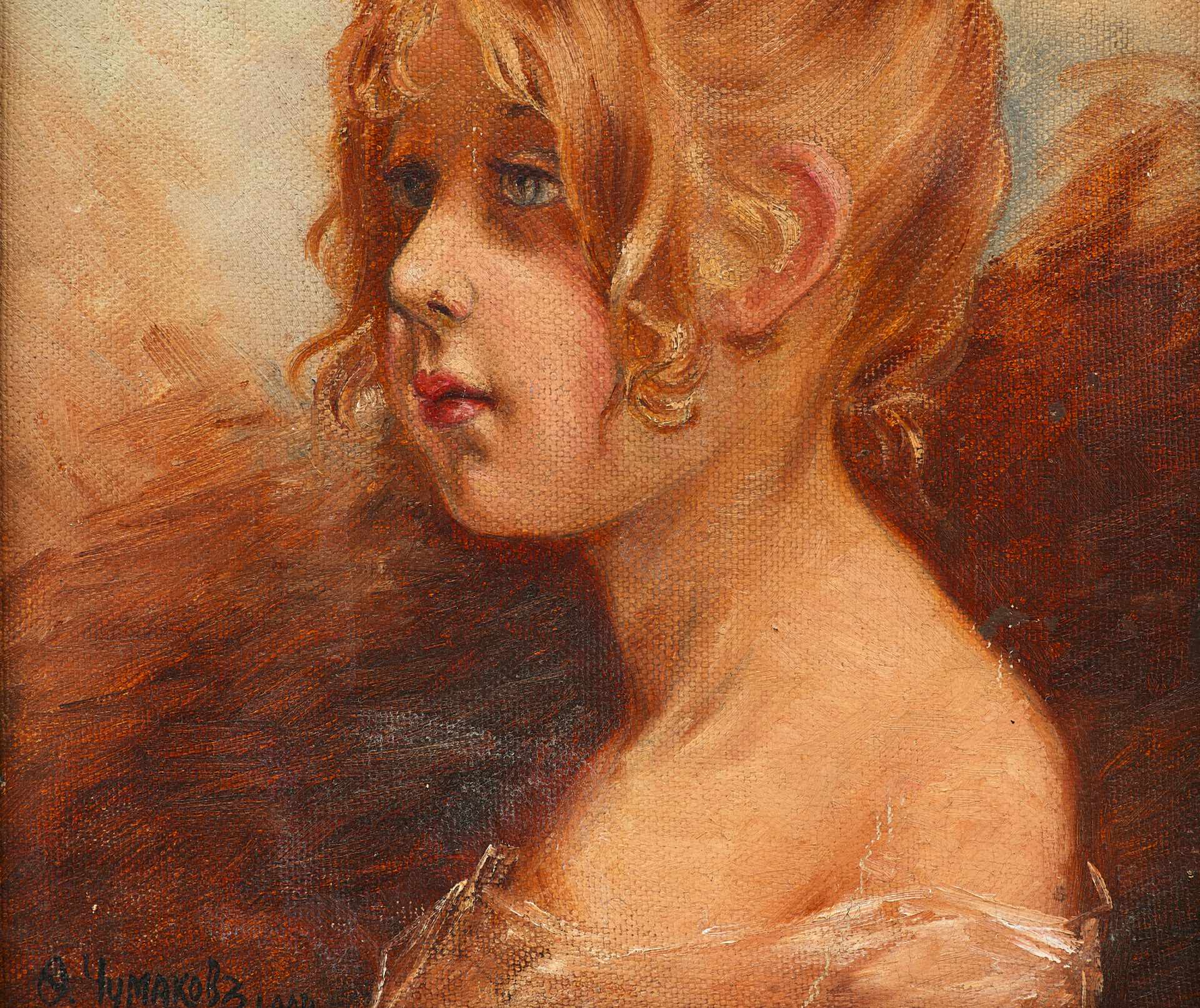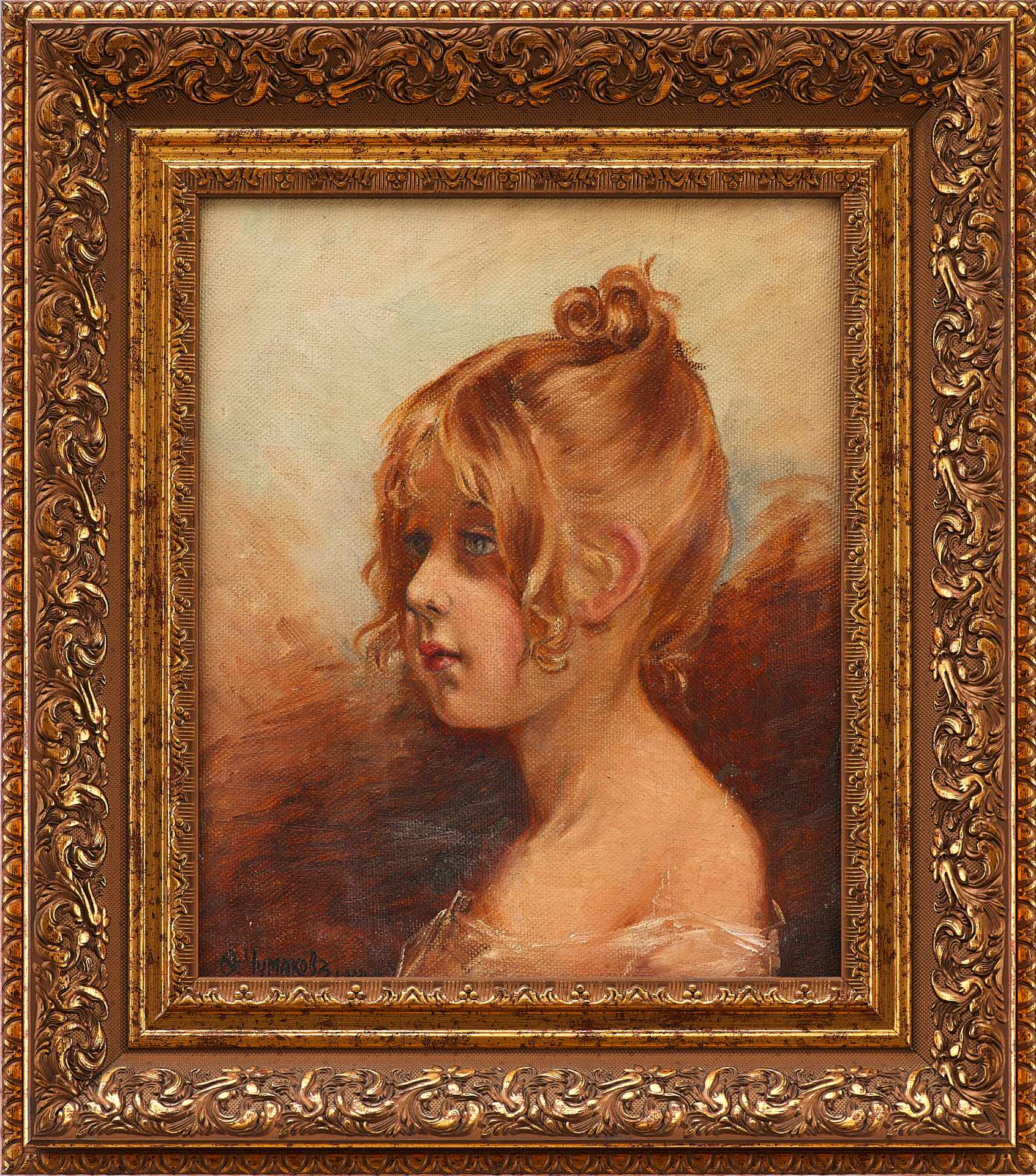 На обороте имеется бумажная наклейка Москуппромторга 1950-х гг. с указанием автора, названия картины, а также иных данных: «Коркин м(асло) на холсте Чум(аков) Головка девоч(ки) 25x30 в дер(евянной) раме». Состояние использованных в работе материалов соответствует указанной датировке - начало XXв. Работа выполнена на профессиональном уровне.